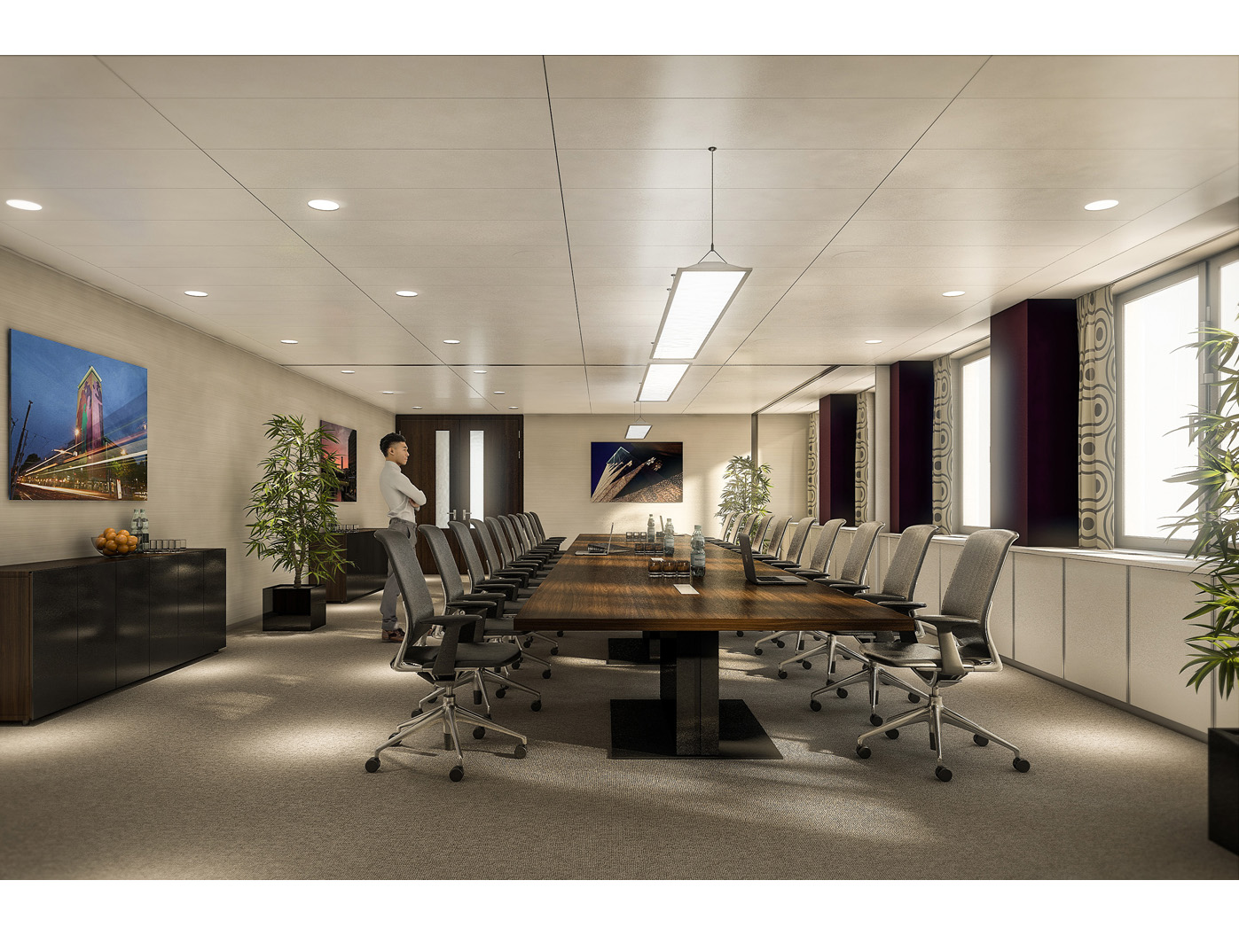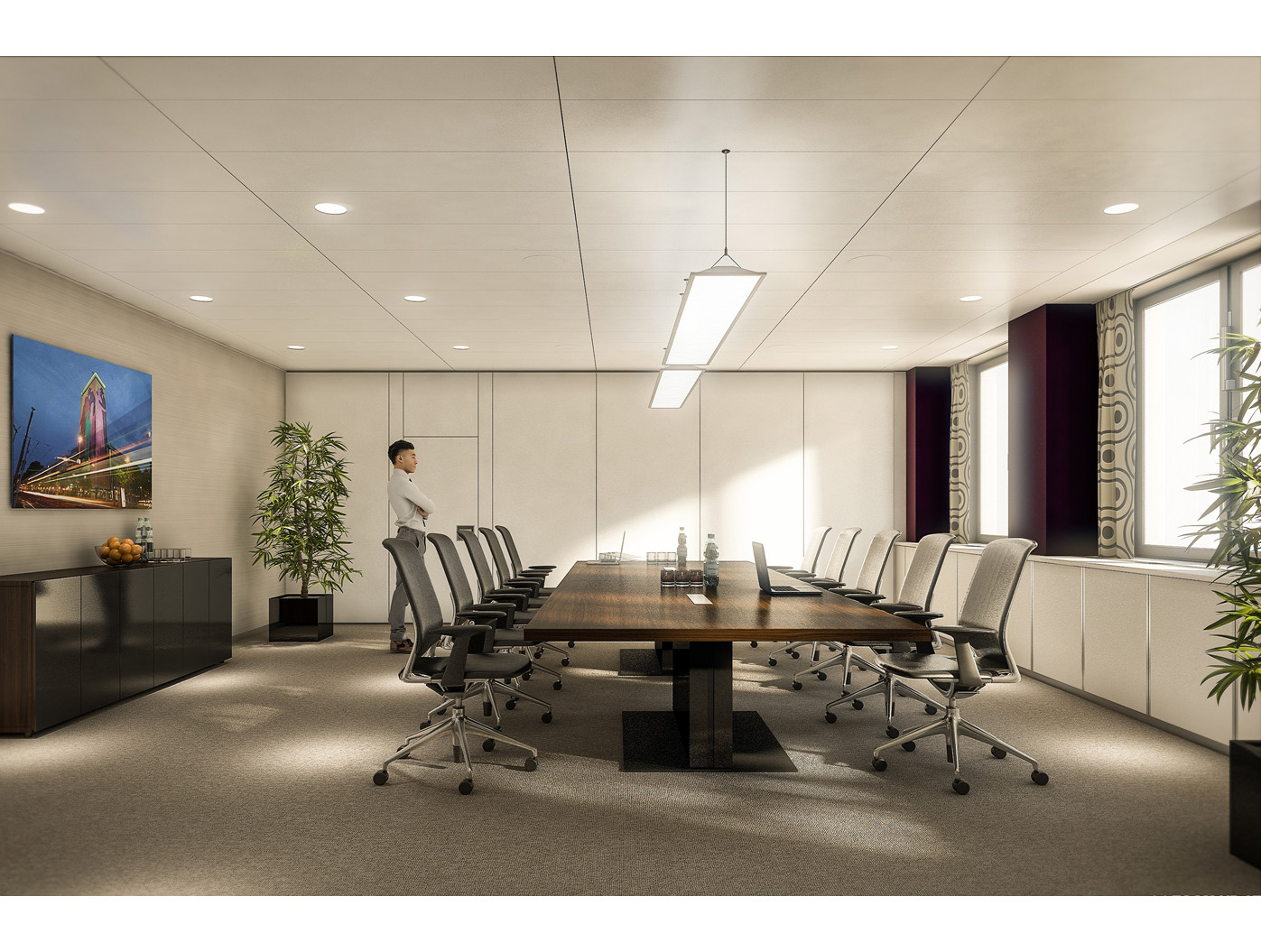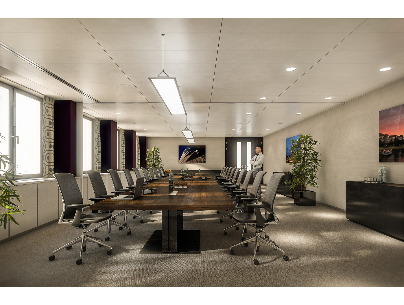 Ein zeitgemässer Sitzungssaal vereint schlichte Formen mit hochwertigen Materialien. Die Raum- gestaltung folgt einer reduzierten Linienführung, wobei grossfor- matige Glasfronten Transparenz und Tageslichtnutzung betonen. Die Wände in sichtbarem Beton oder holzverkleideten Akustikelementen schaffen eine warme, professionelle Atmosphäre, während eine zurück- haltende indirekte Beleuchtung fokussiertes Arbeiten ermöglicht.