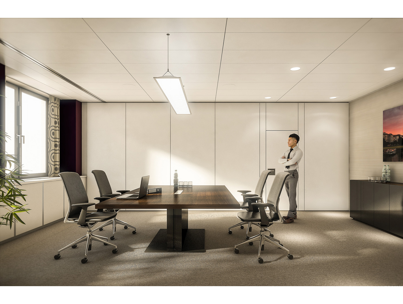 Ein zentraler minimalistischer Konferenztisch aus massivem Holz oder gebürstetem Metall bildet das Herzstück, flankiert von ergonom- ischen Stühlen in neutralen Farb- tönen. Die integrierte Medien- technik (monitorseitig unsichtbar eingelassen) unterstreicht den Anspruch auf Funktionalität ohne störende Elemente.