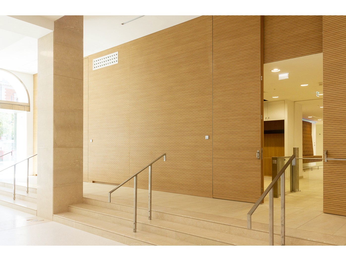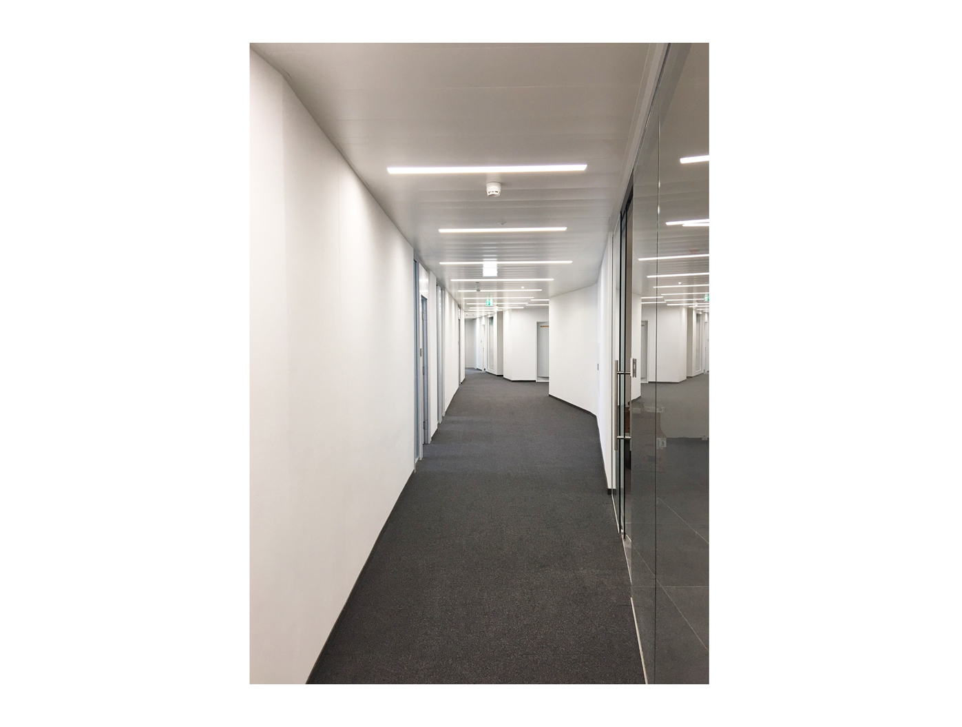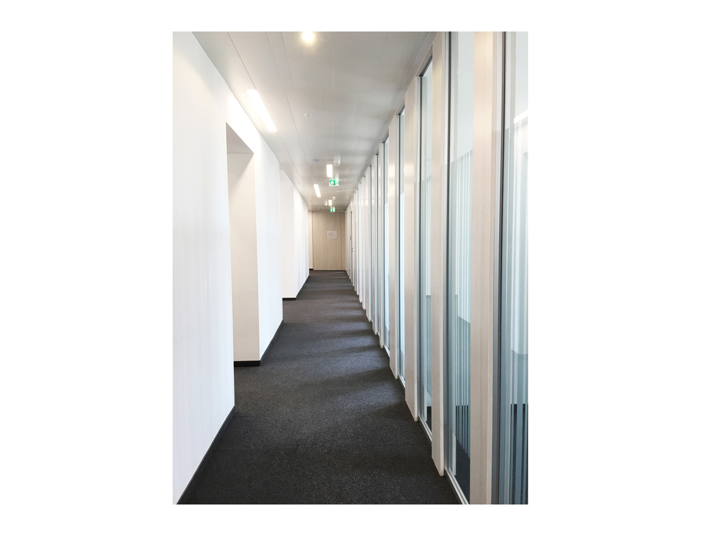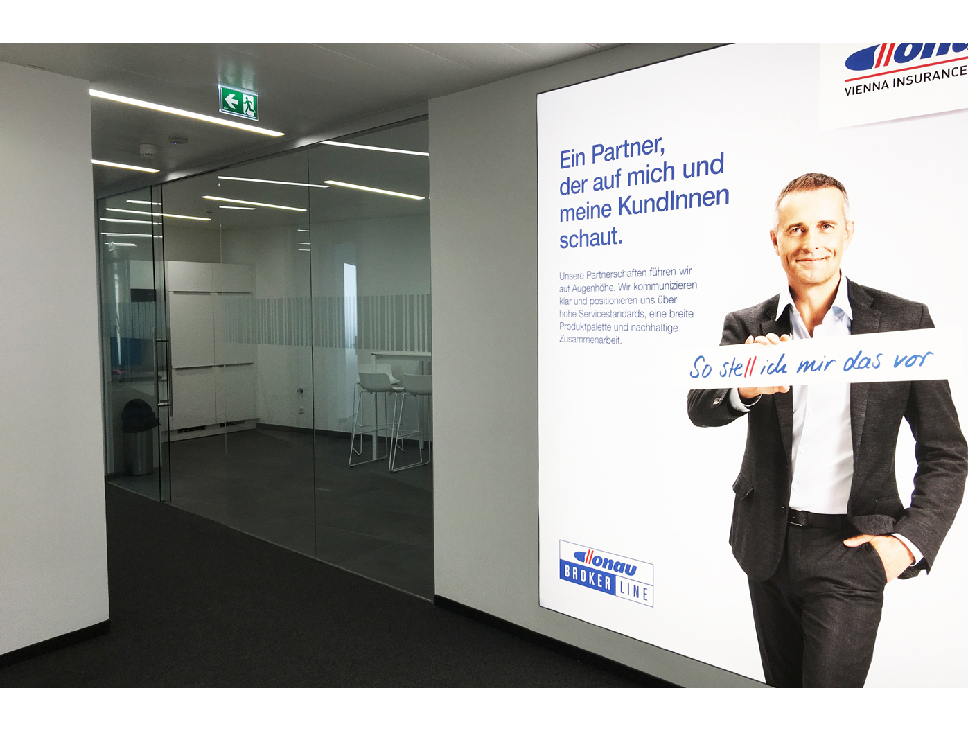 Das Projekt verleiht dem histor- ischen Gebäude der Donau-Versich- erung eine zeitgemässe architekt- onische Identität, die Tradition und Innovation in Dialog setzt. Herz- stück der Transformation ist die neue Kantine im Erdgeschoss, die durch raumhohe Oberlichtgauben mit natürlichem Licht geflutet wird. Bewegliche Raumteiler ermög- lichen flexible Nutzungsszenarien, während das neu gestaltete, zwei- geschossige Foyer als repräsen- tative Eingangssituation den Ansprüchen einer Konzernzentrale gerecht wird. Die Materialität überzeugt durch ihre klare Eleganz, helle Oberflächen, transparente Glaswände und dezente Metall- applikationen schaffen eine ruhige, professionelle Atmosphäre.