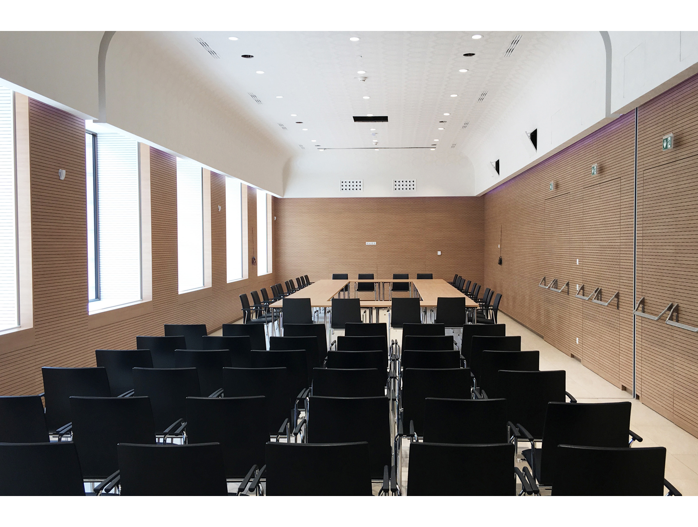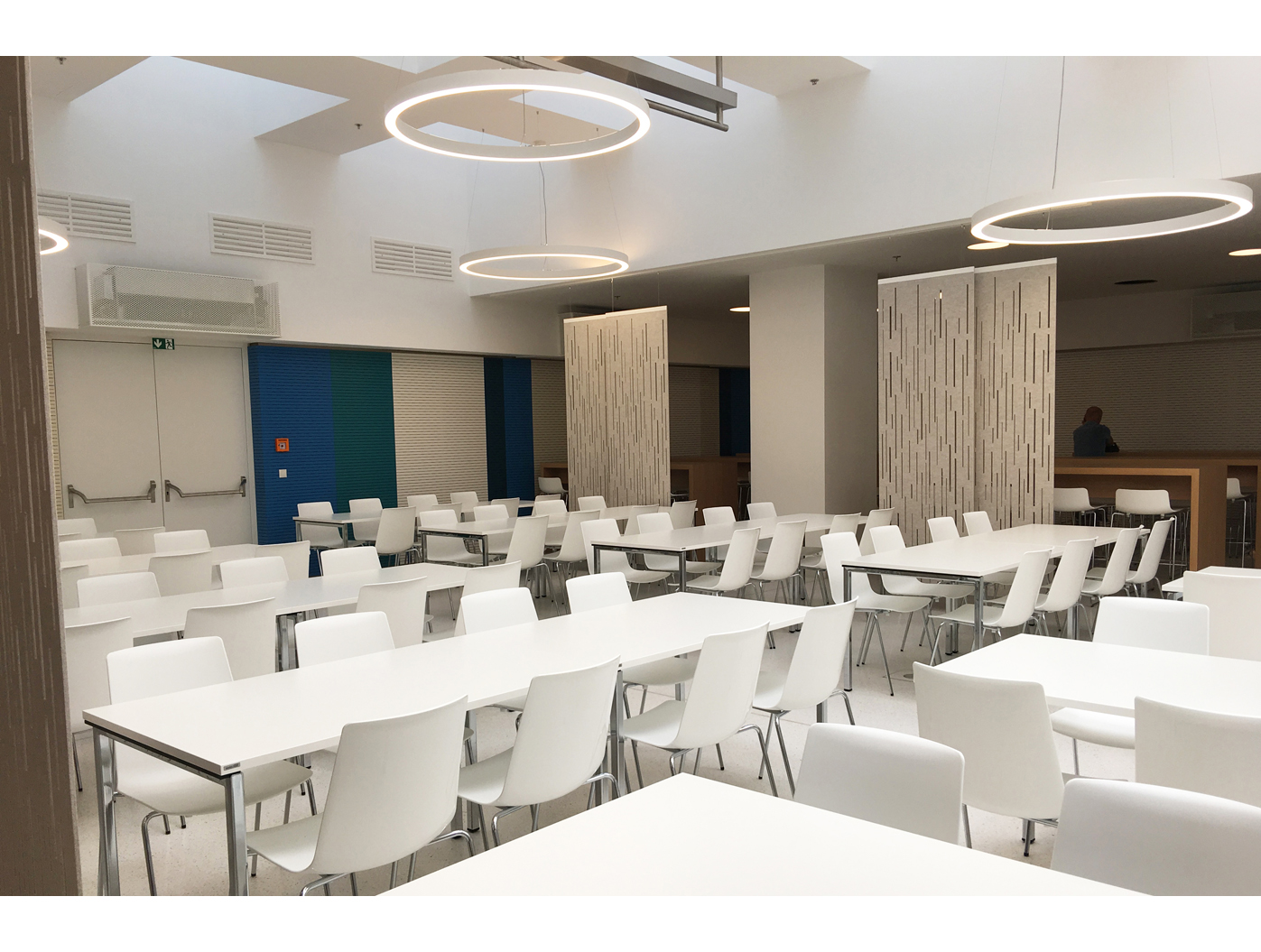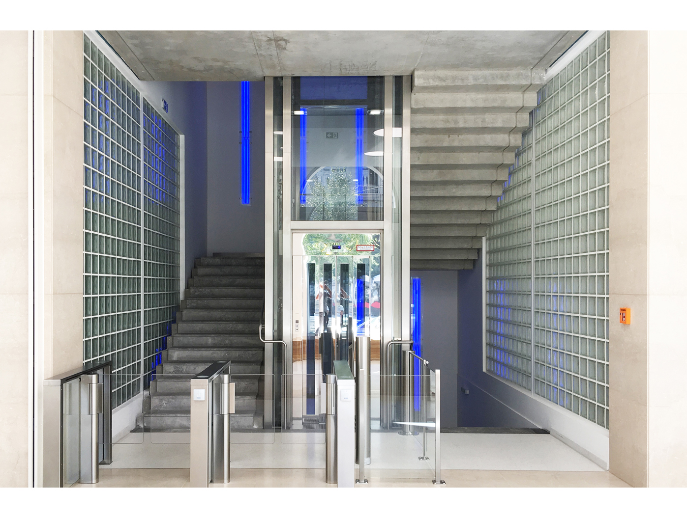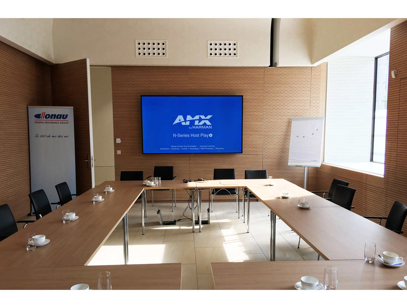 Das Projekt verleiht dem histor- ischen Gebäude der Donau-Versich- erung eine zeitgemässe architekt- onische Identität, die Tradition und Innovation in Dialog setzt. Herz- stück der Transformation ist die neue Kantine im Erdgeschoss, die durch raumhohe Oberlichtgauben mit natürlichem Licht geflutet wird. Bewegliche Raumteiler ermög- lichen flexible Nutzungsszenarien, während das neu gestaltete, zwei- geschossige Foyer als repräsen- tative Eingangssituation den Ansprüchen einer Konzernzentrale gerecht wird. Die Materialität überzeugt durch ihre klare Eleganz, helle Oberflächen, transparente Glaswände und dezente Metall- applikationen schaffen eine ruhige, professionelle Atmosphäre.