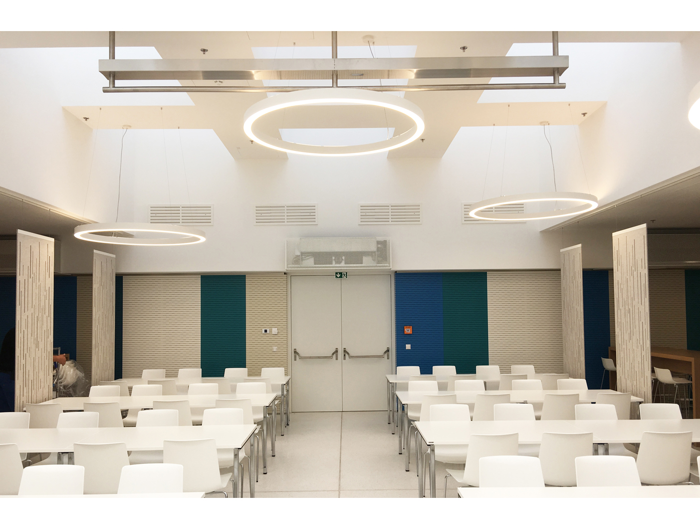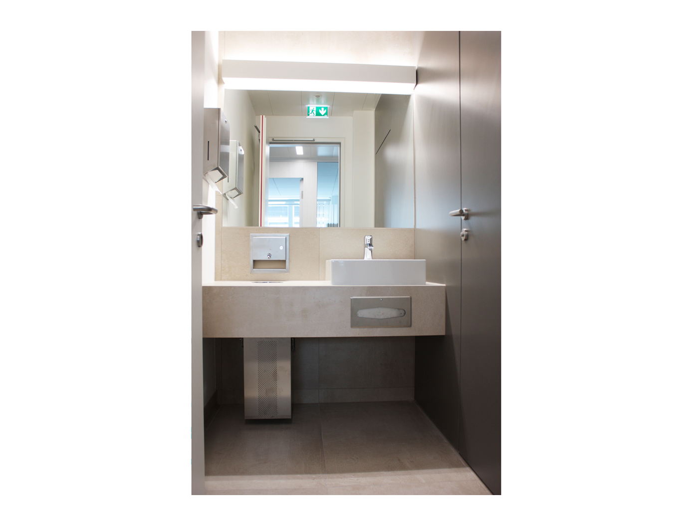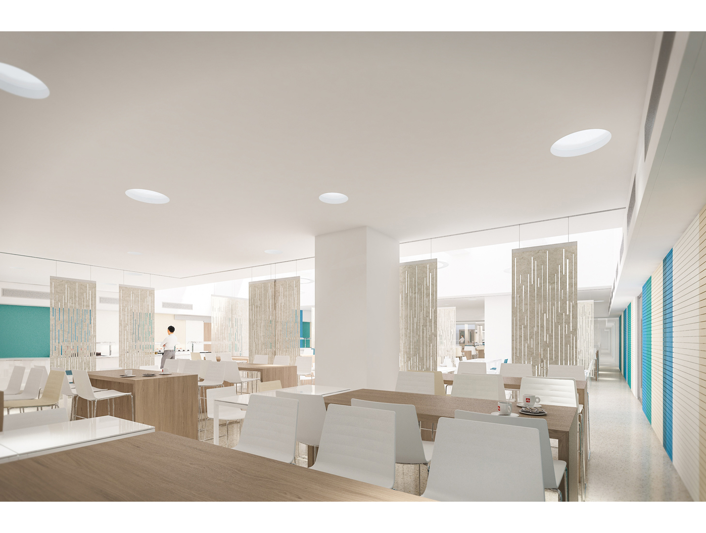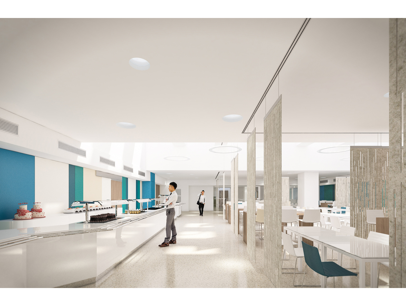 Das Projekt verleiht dem histor- ischen Gebäude der Donau-Versich- erung eine zeitgemässe architekt- onische Identität, die Tradition und Innovation in Dialog setzt. Herz- stück der Transformation ist die neue Kantine im Erdgeschoss, die durch raumhohe Oberlichtgauben mit natürlichem Licht geflutet wird. Bewegliche Raumteiler ermög- lichen flexible Nutzungsszenarien, während das neu gestaltete, zwei- geschossige Foyer als repräsen- tative Eingangssituation den Ansprüchen einer Konzernzentrale gerecht wird. Die Materialität überzeugt durch ihre klare Eleganz, helle Oberflächen, transparente Glaswände und dezente Metall- applikationen schaffen eine ruhige, professionelle Atmosphäre.
