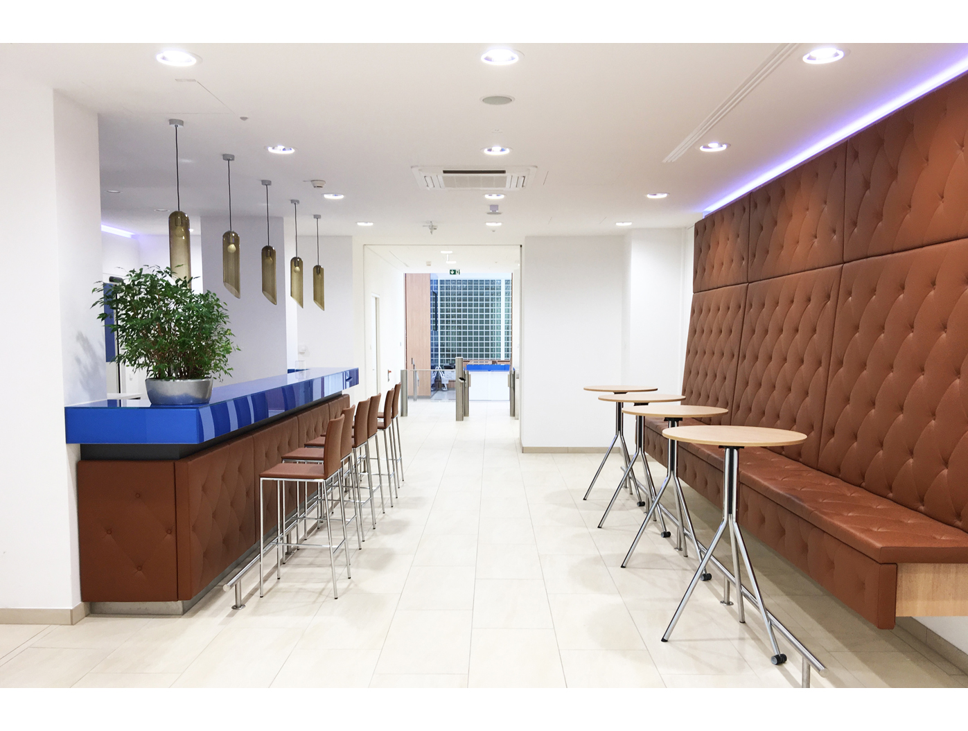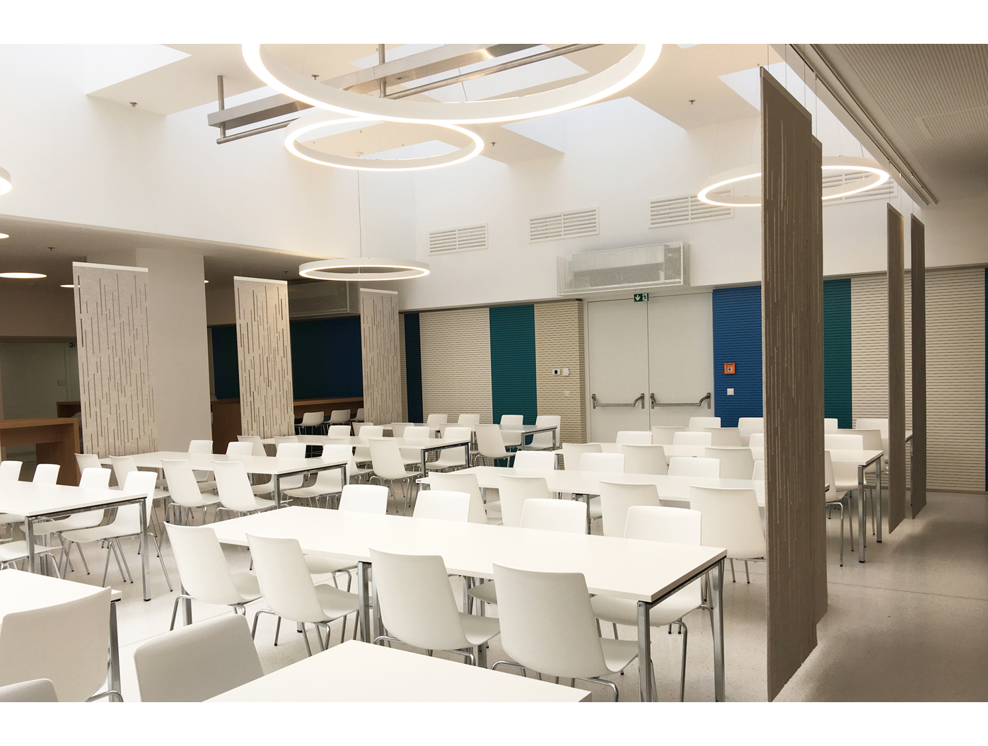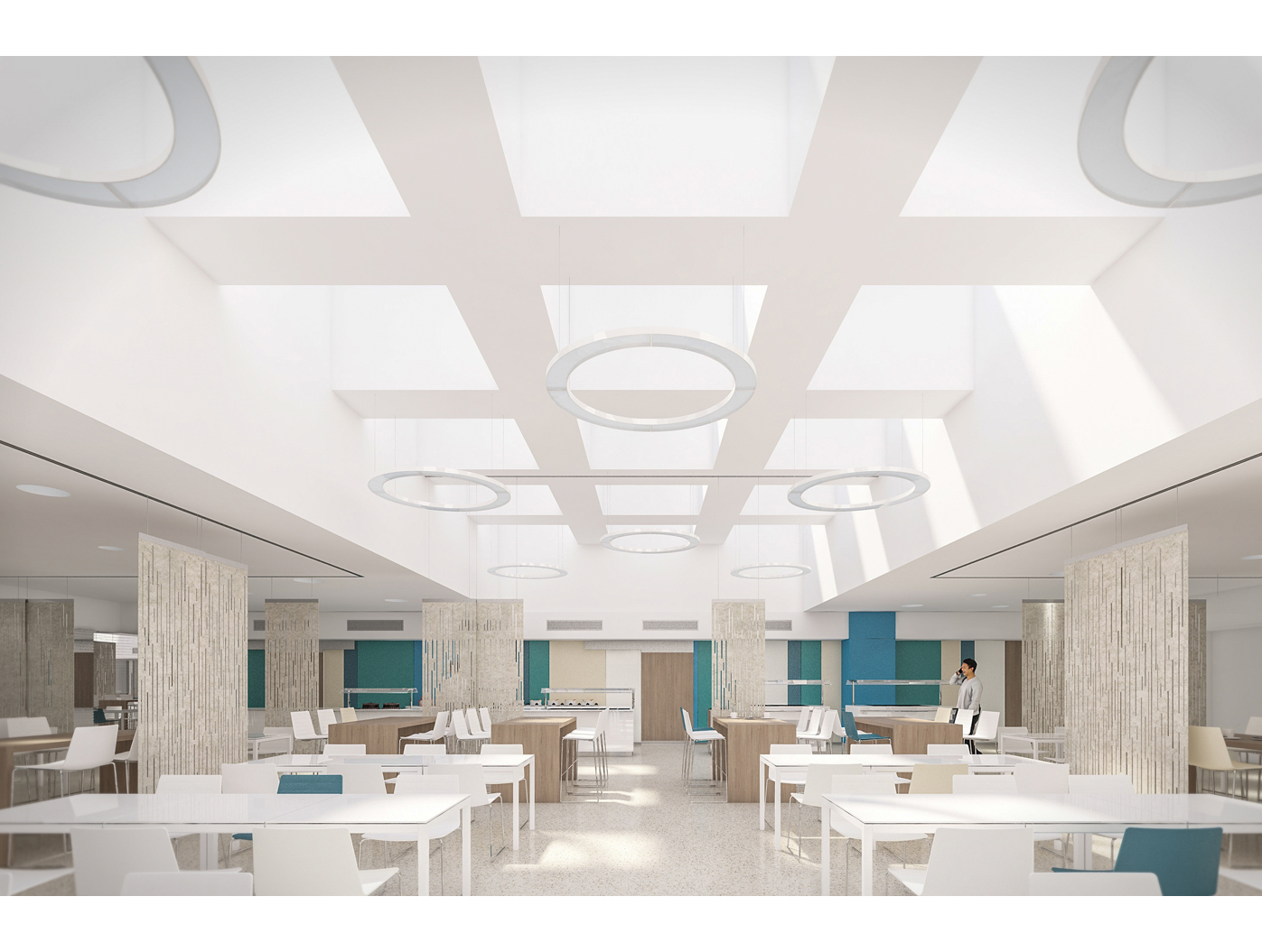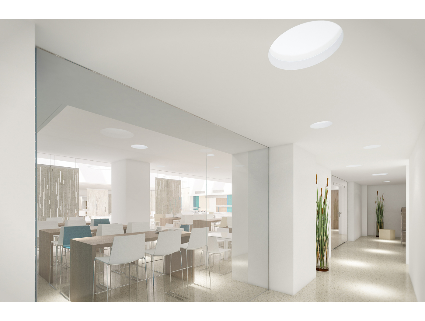 Das Projekt verleiht dem histor- ischen Gebäude der Donau-Versich- erung eine zeitgemässe architekt- onische Identität, die Tradition und Innovation in Dialog setzt. Herz- stück der Transformation ist die neue Kantine im Erdgeschoss, die durch raumhohe Oberlichtgauben mit natürlichem Licht geflutet wird. Bewegliche Raumteiler ermög- lichen flexible Nutzungsszenarien, während das neu gestaltete, zwei- geschossige Foyer als repräsen- tative Eingangssituation den Ansprüchen einer Konzernzentrale gerecht wird. Die Materialität überzeugt durch ihre klare Eleganz, helle Oberflächen, transparente Glaswände und dezente Metall- applikationen schaffen eine ruhige, professionelle Atmosphäre.