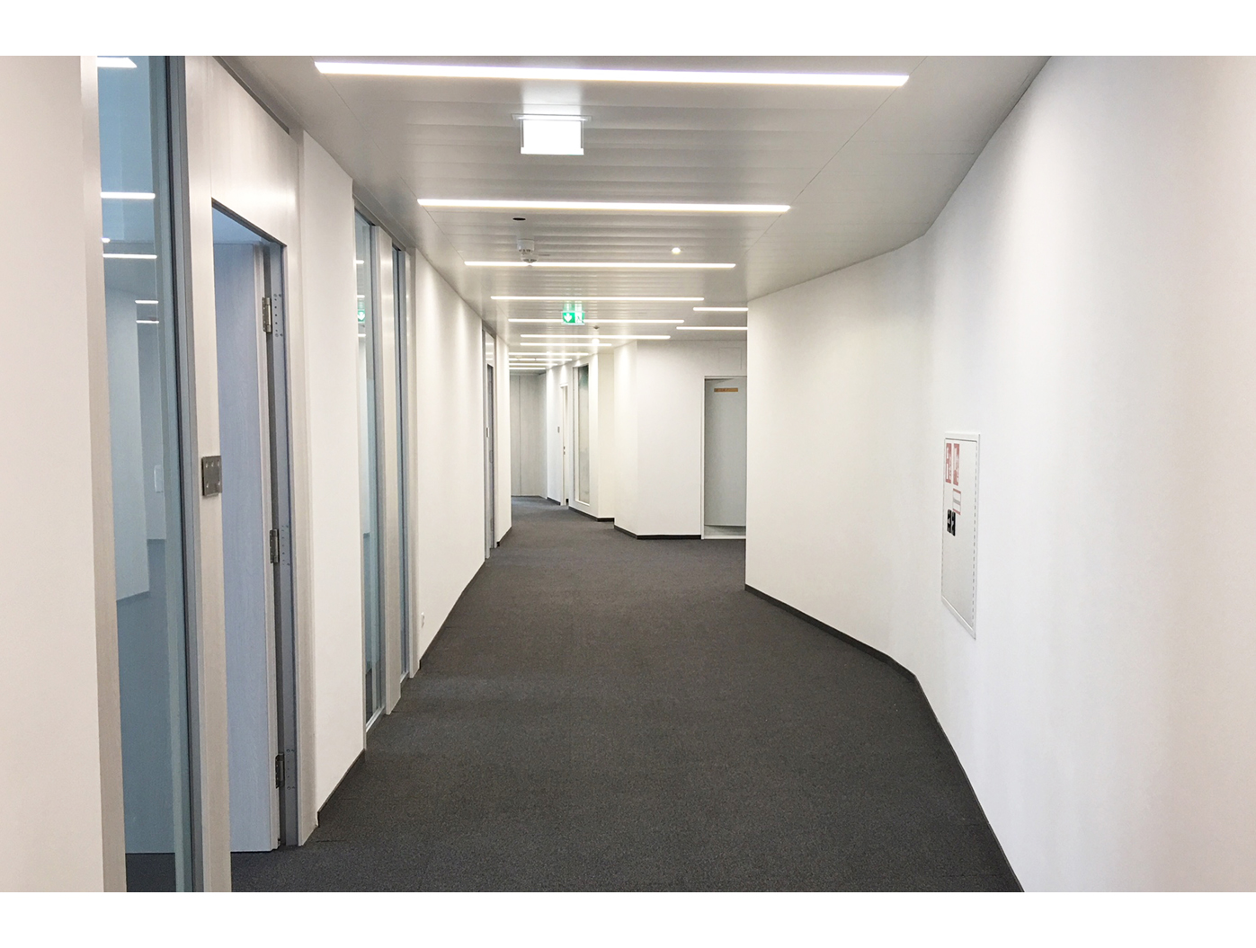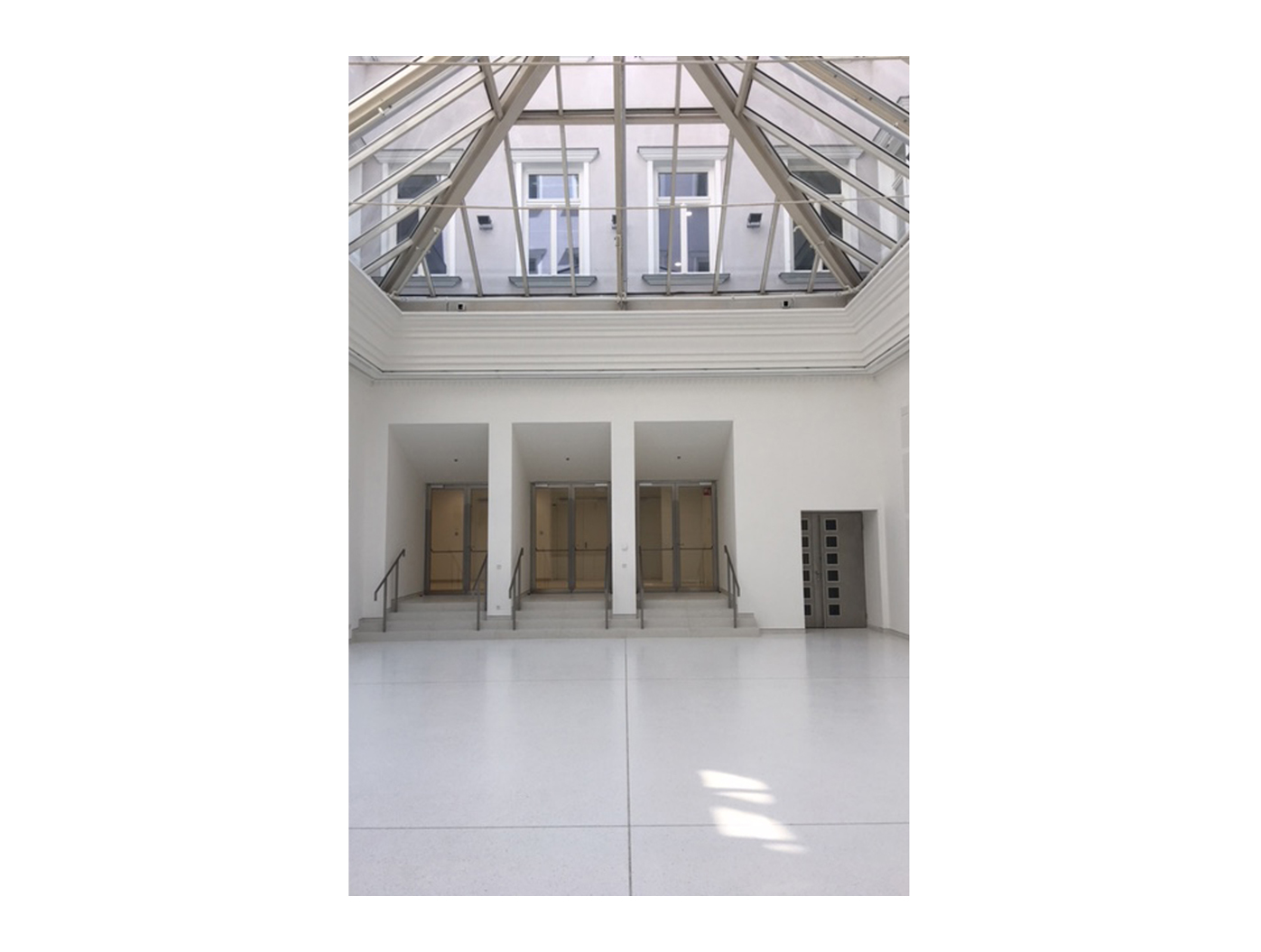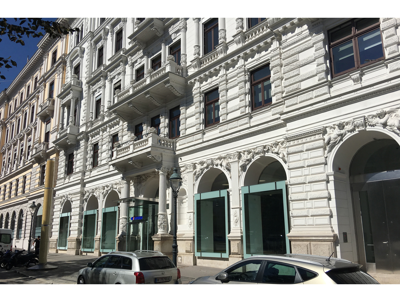 In den Obergeschossen strukturiert ein hexagonales Erschliessungs- system den Raum neu. Der umlauf- ende Gang mit seinen transparenten Bürowänden ermöglicht Blickbezieh- ungen und Tageslichttiefe, während variable Raumzuschnitte maximale Flexibilität gewährleisten. Der ausgebaute Dachbereich erweitert das Raumangebot und nutzt die bestehende Dachstruktur durch geschickt platzierte Fensterbänder. Besondere Sorgfalt erhielten die denkmalgeschützten Fassaden zum Ring und zur Maria-Theresien-Strasse, deren historische Substanz behutsam konserviert und durch einen neuen Anstrich revitalisiert wurde.
