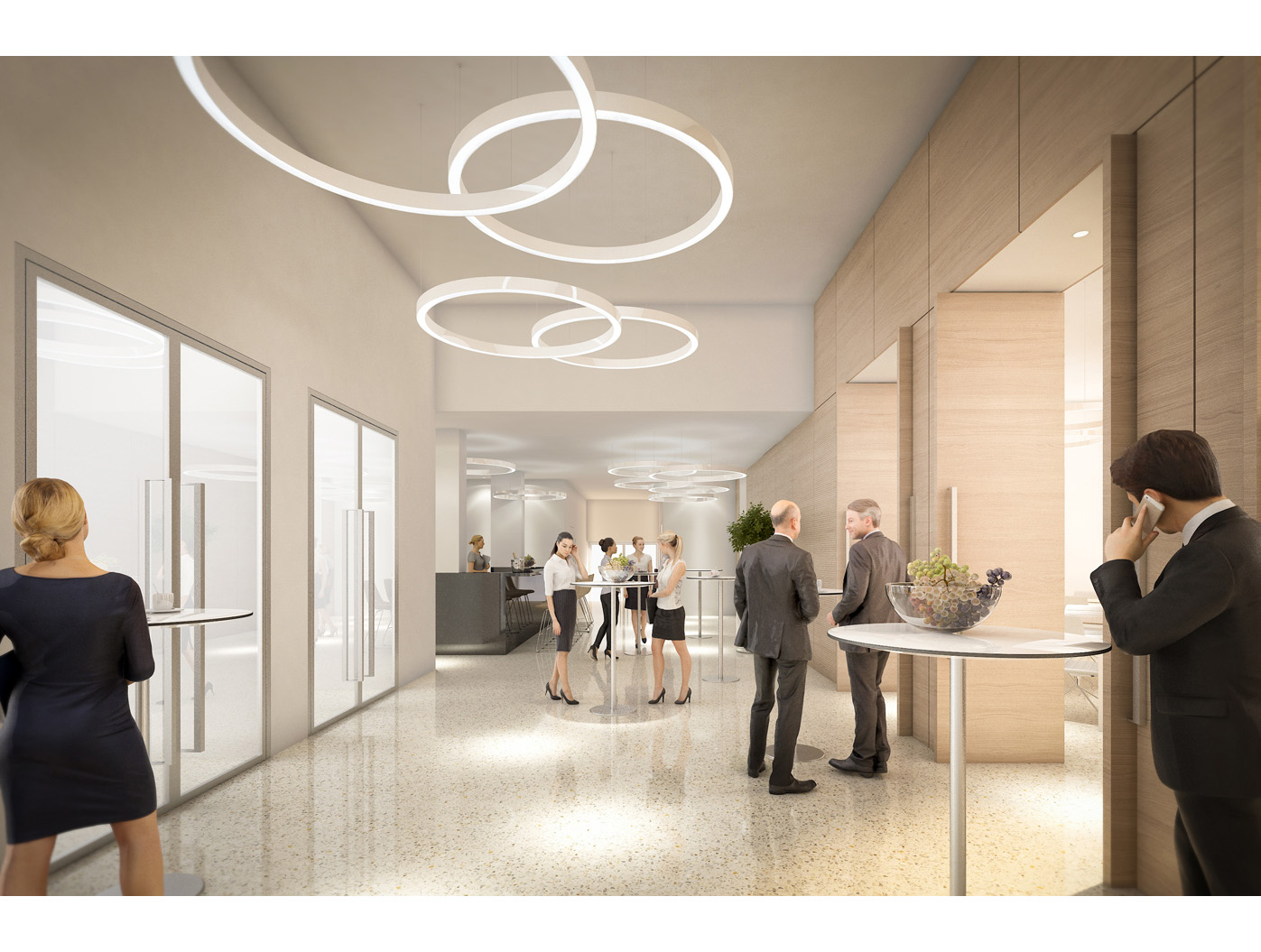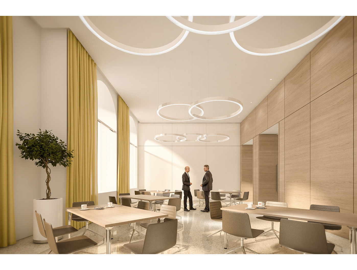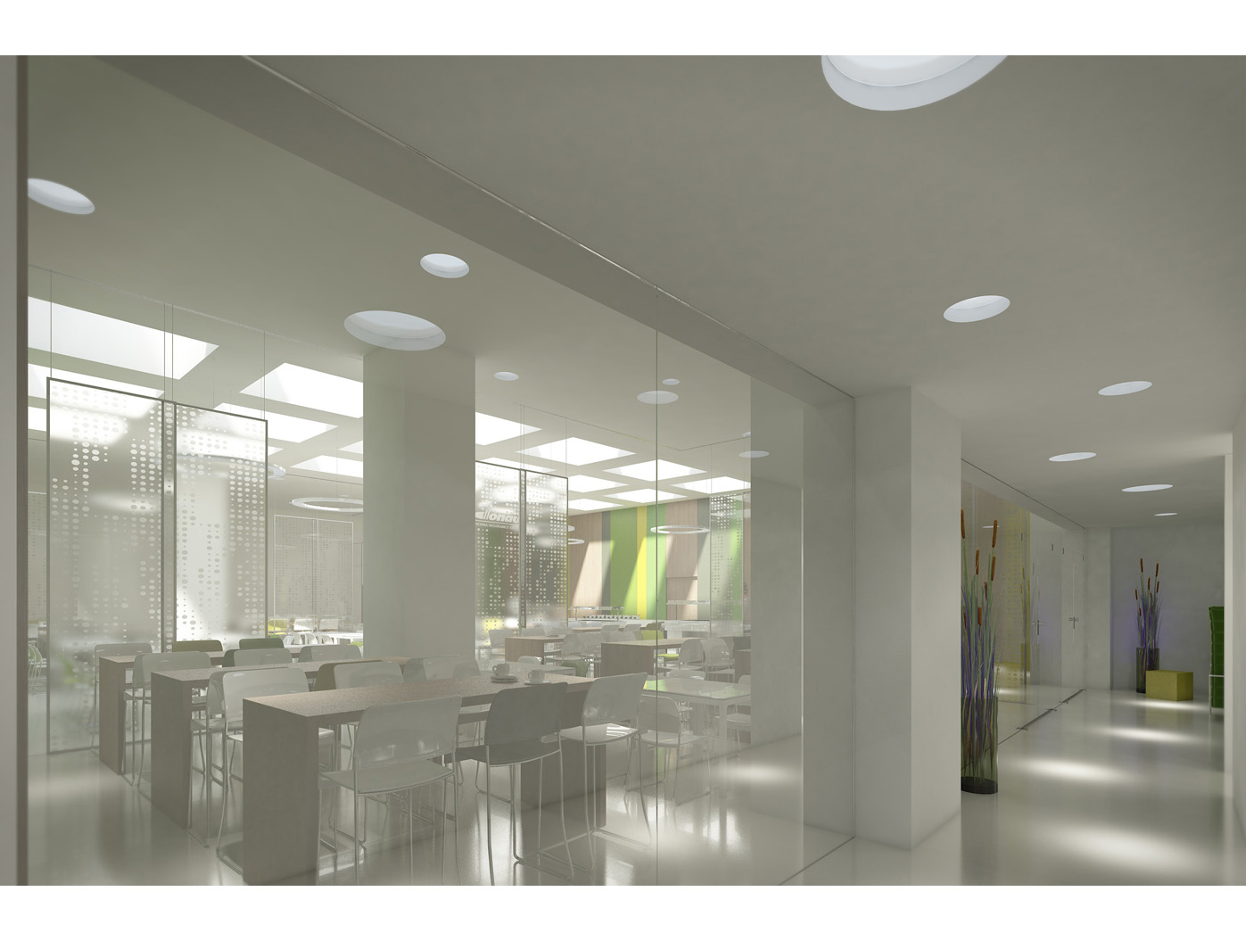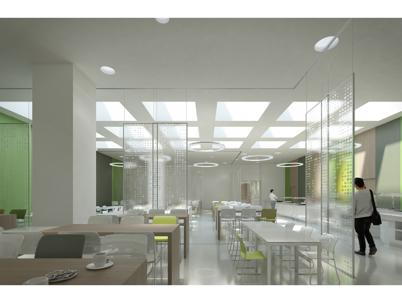 Im Zentrum steht das neu gestaltete, zweigeschossige Foyer, ein elegantes Entree, das den repräsentativen Anspruch einer Konzernzentrale erfüllt. Direkt dahinter liegt die helle, von Oberlichten durchflutete Kantine, die durch flexible Raumtrennungen und variabel hohe Tische dynamisch nutzbar ist.