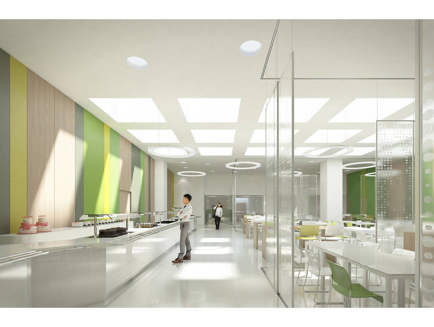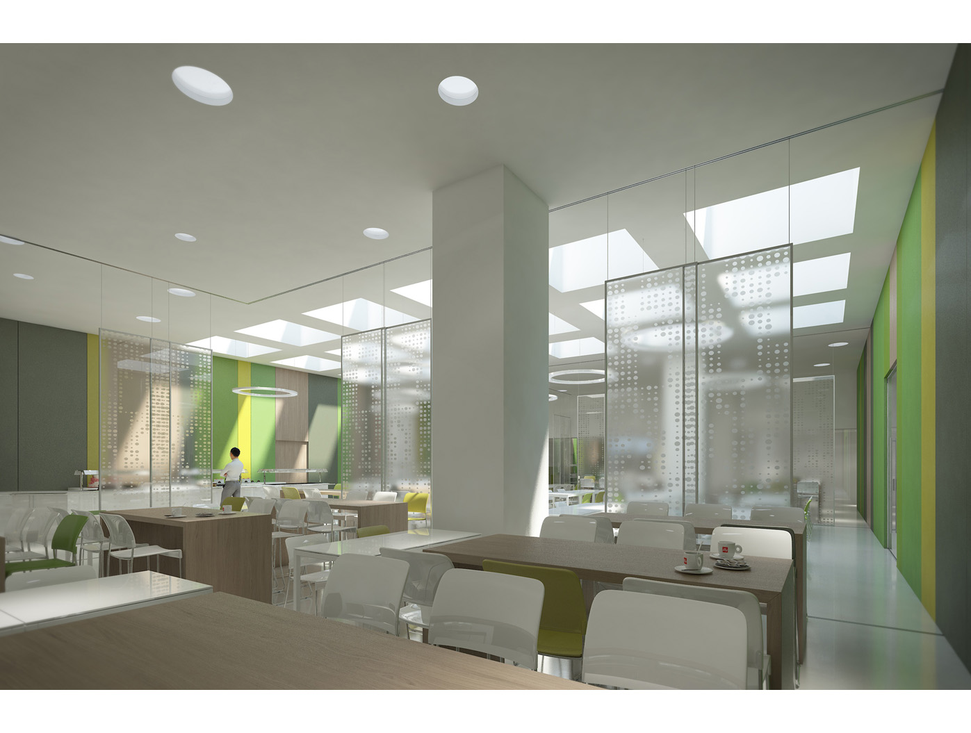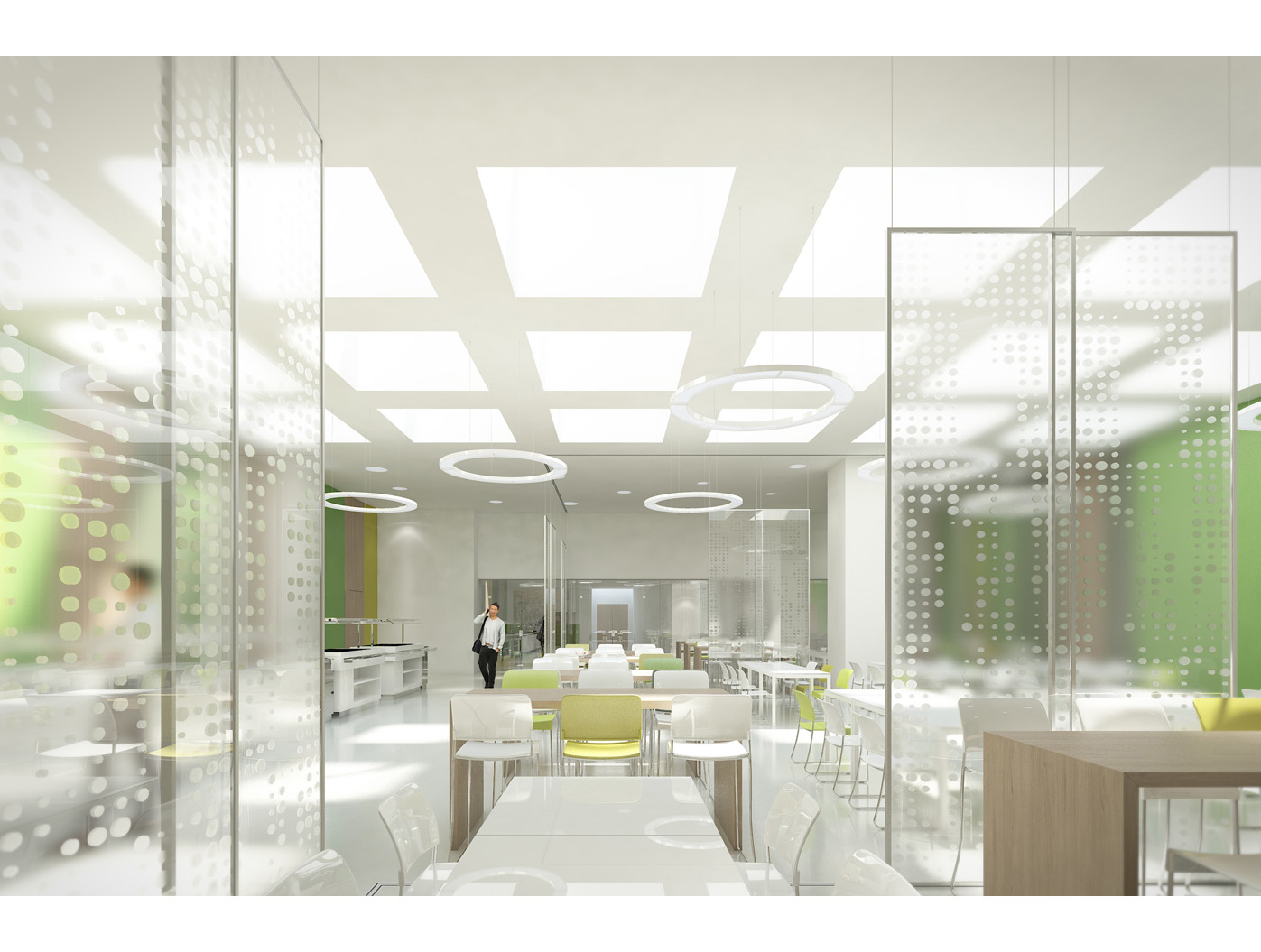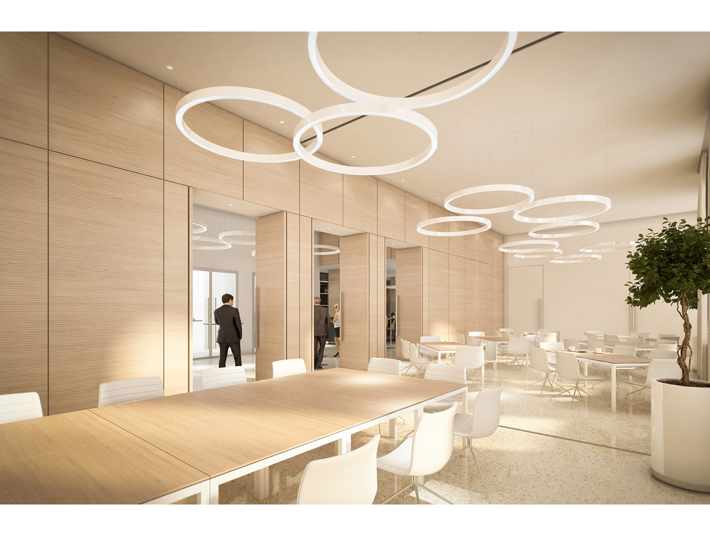 Im Zentrum steht das neu gestaltete, zweigeschossige Foyer, ein elegantes Entree, das den repräsentativen Anspruch einer Konzernzentrale erfüllt. Direkt dahinter liegt die helle, von Oberlichten durchflutete Kantine, die durch flexible Raumtrennungen und variabel hohe Tische dynamisch nutzbar ist.