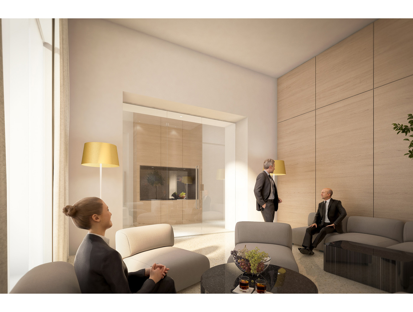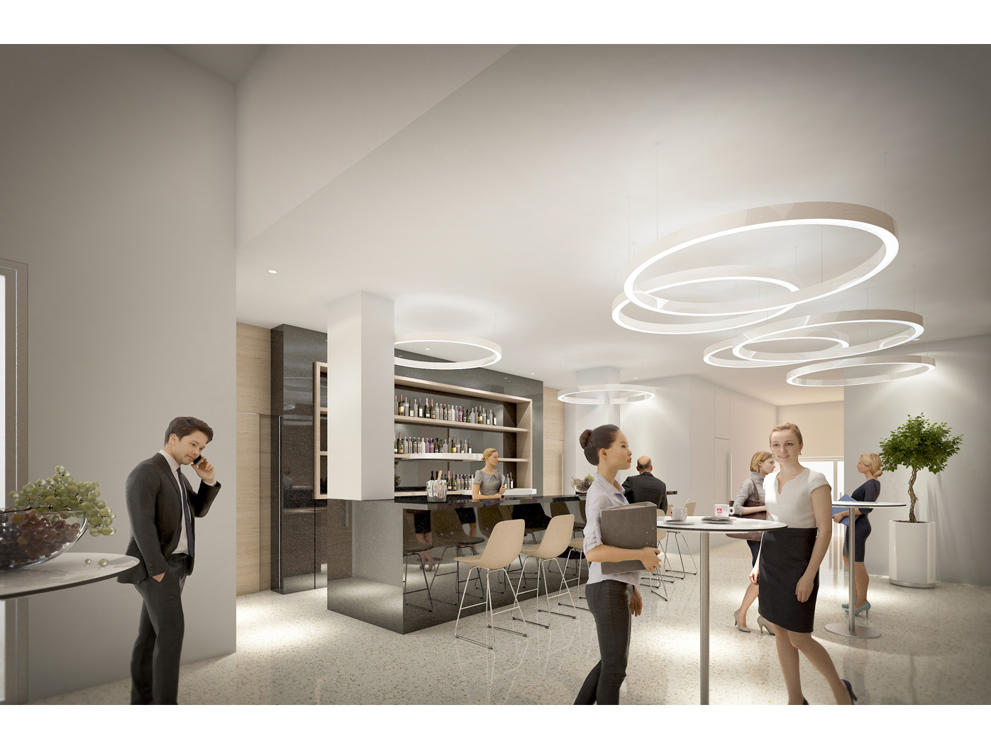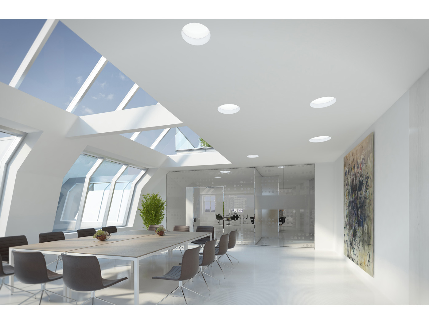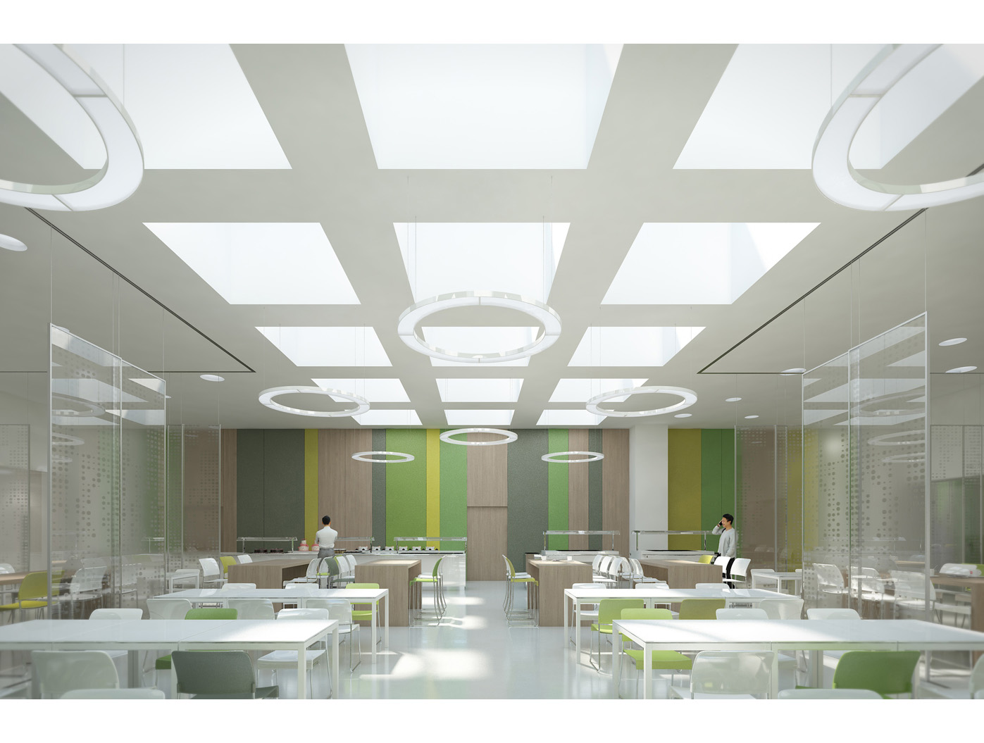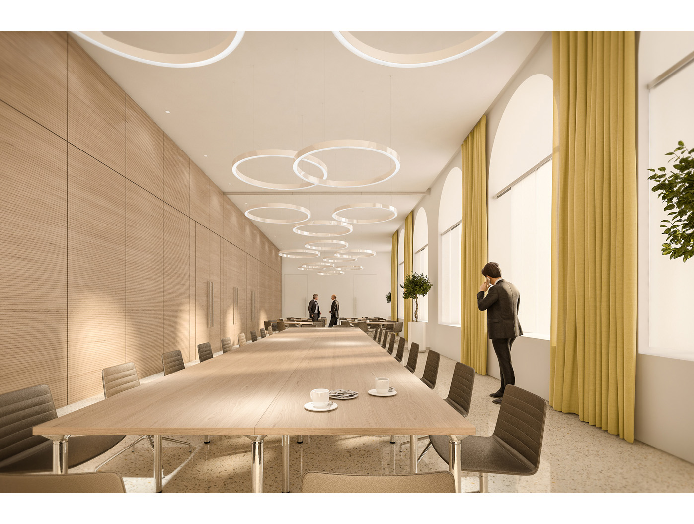 Im Zentrum steht das neu gestaltete, zweigeschossige Foyer, ein elegantes Entree, das den repräsentativen Anspruch einer Konzernzentrale erfüllt. Direkt dahinter liegt die helle, von Oberlichten durchflutete Kantine, die durch flexible Raumtrennungen und variabel hohe Tische dynamisch nutzbar ist.