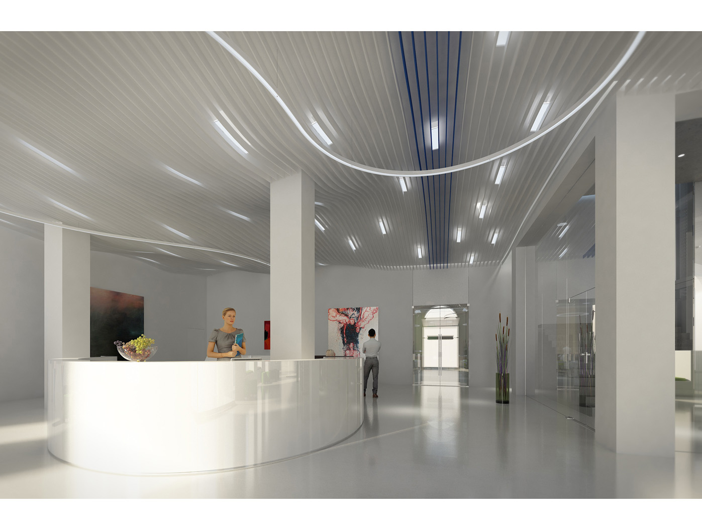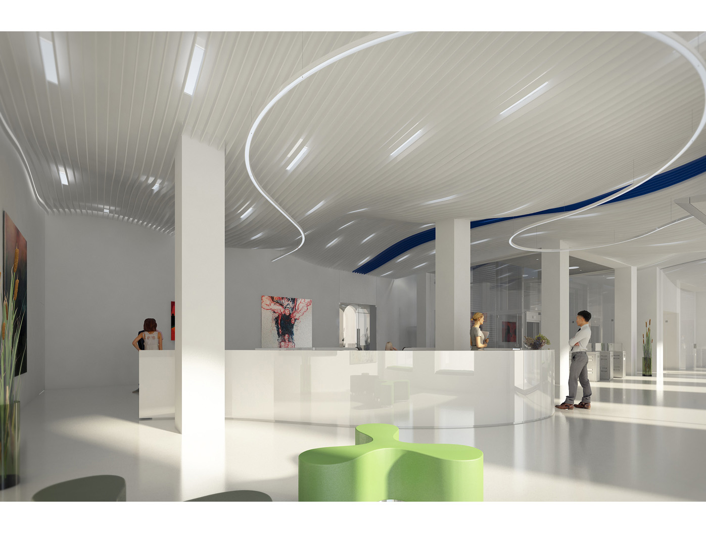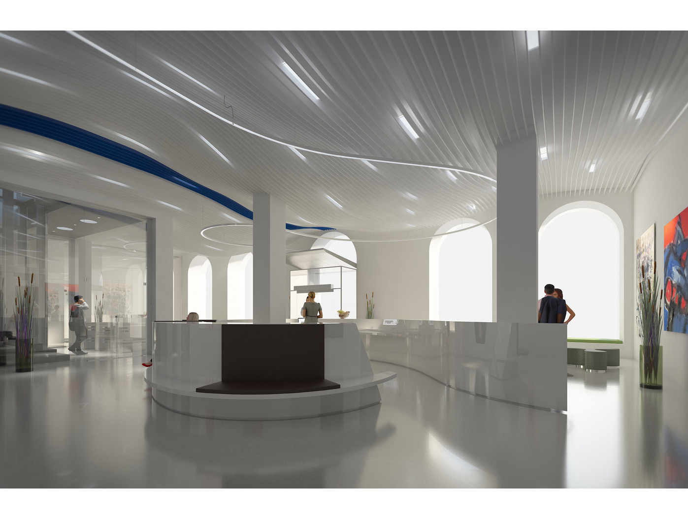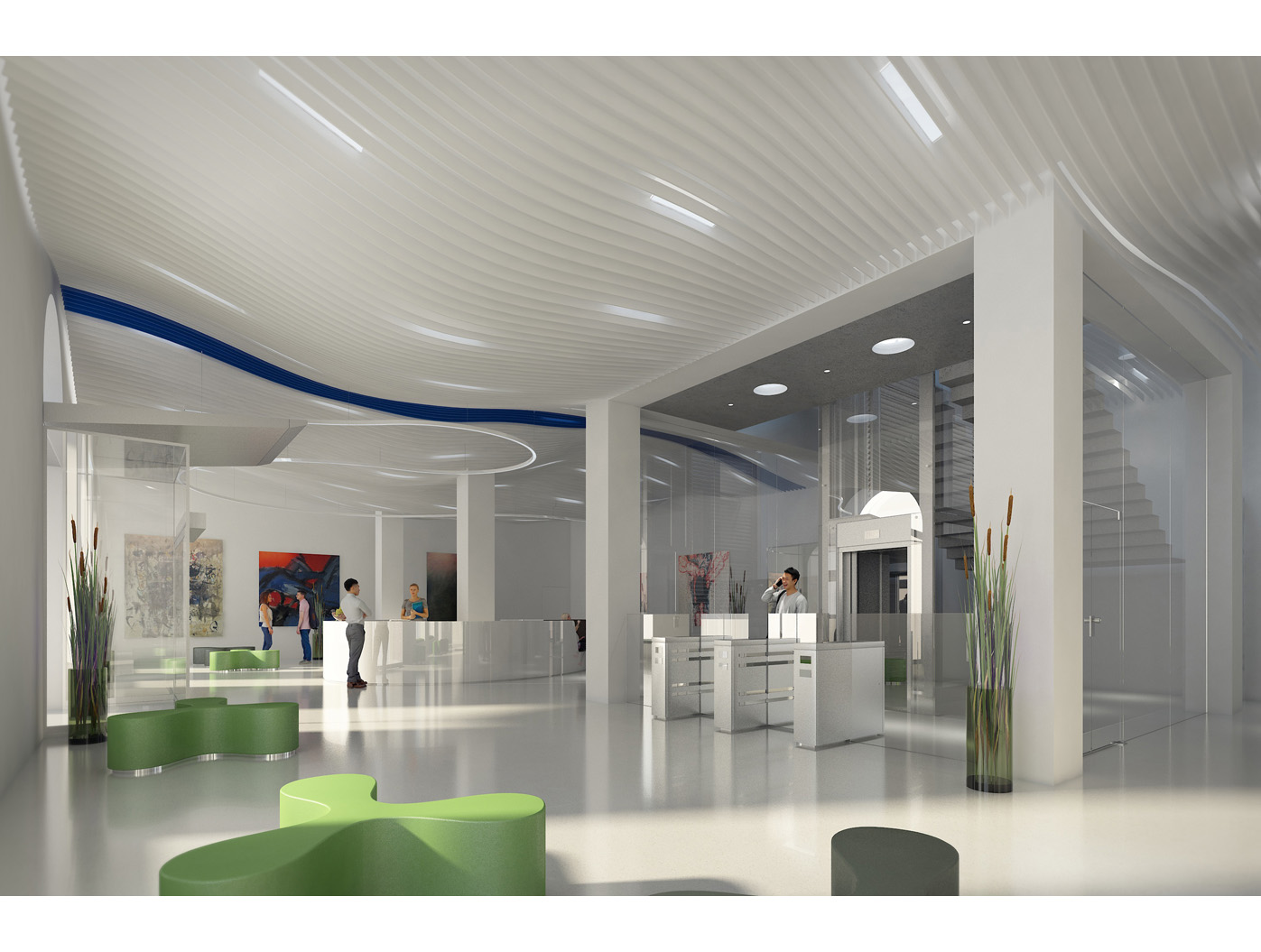 Im Zentrum steht das neu gestaltete, zweigeschossige Foyer, ein elegantes Entree, das den repräsentativen Anspruch einer Konzernzentrale erfüllt. Direkt dahinter liegt die helle, von Oberlichten durchflutete Kantine, die durch flexible Raumtrennungen und variabel hohe Tische dynamisch nutzbar ist.