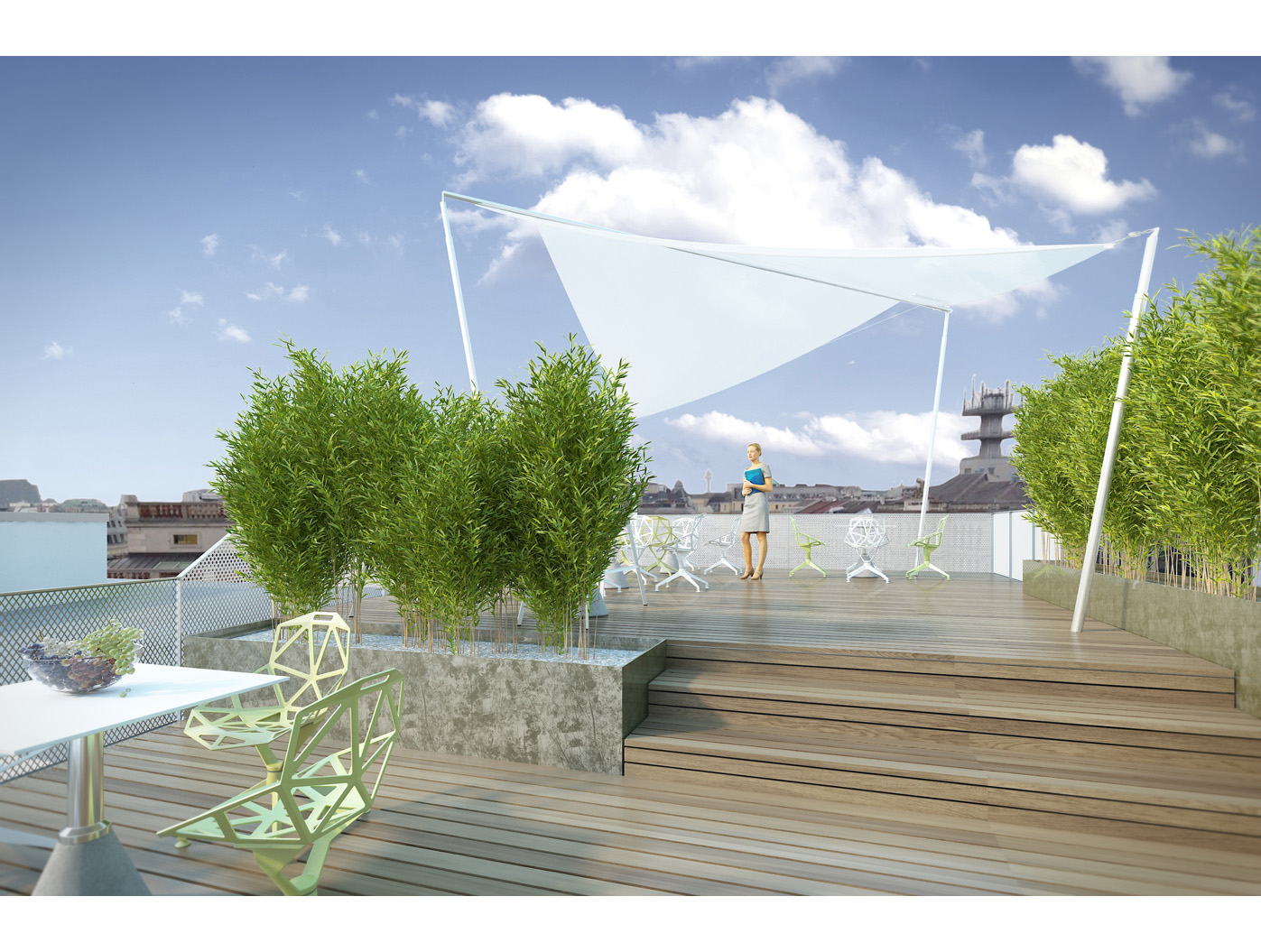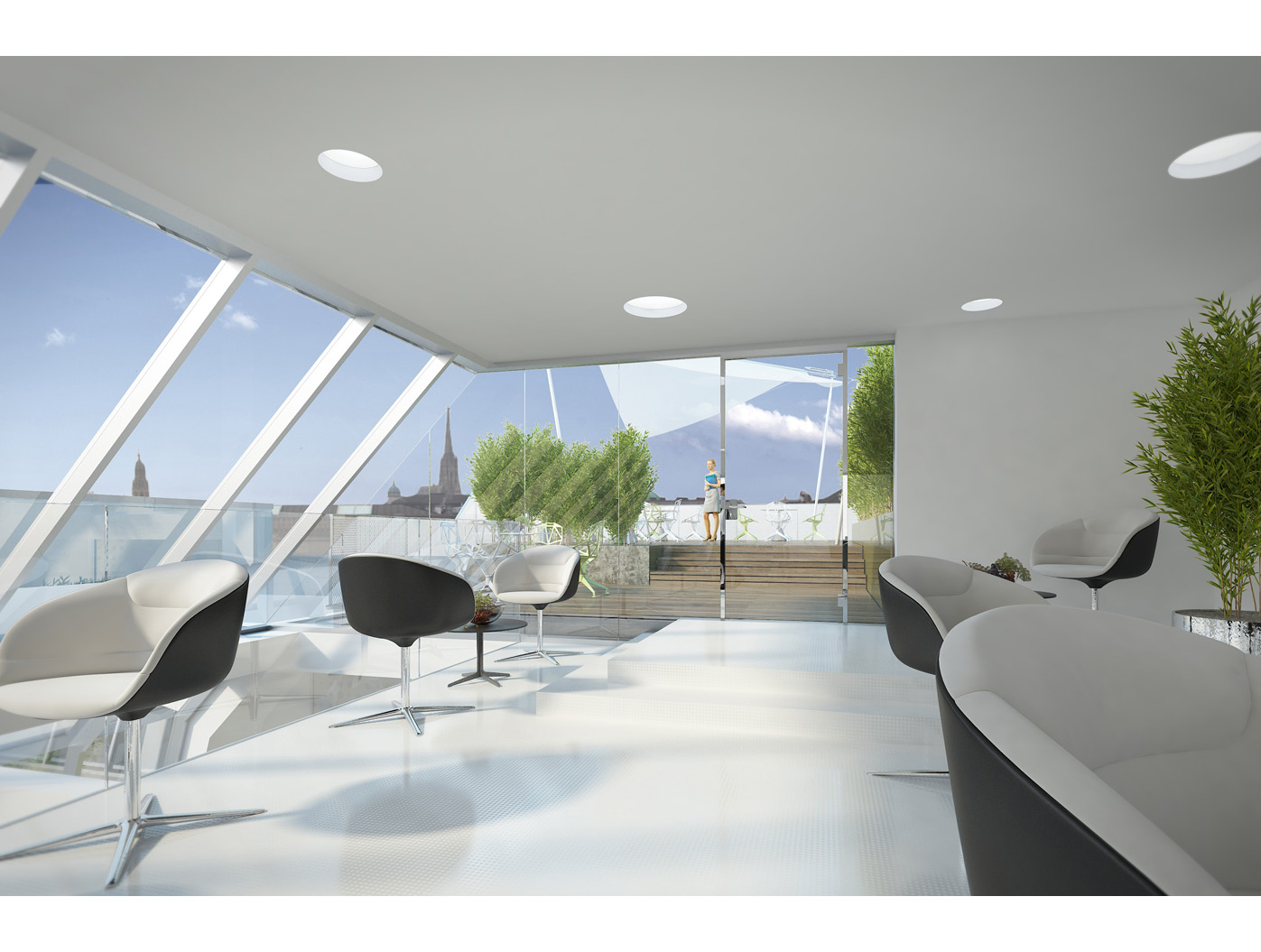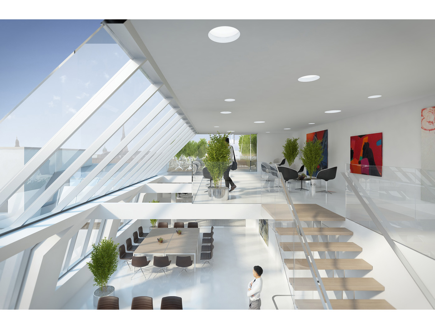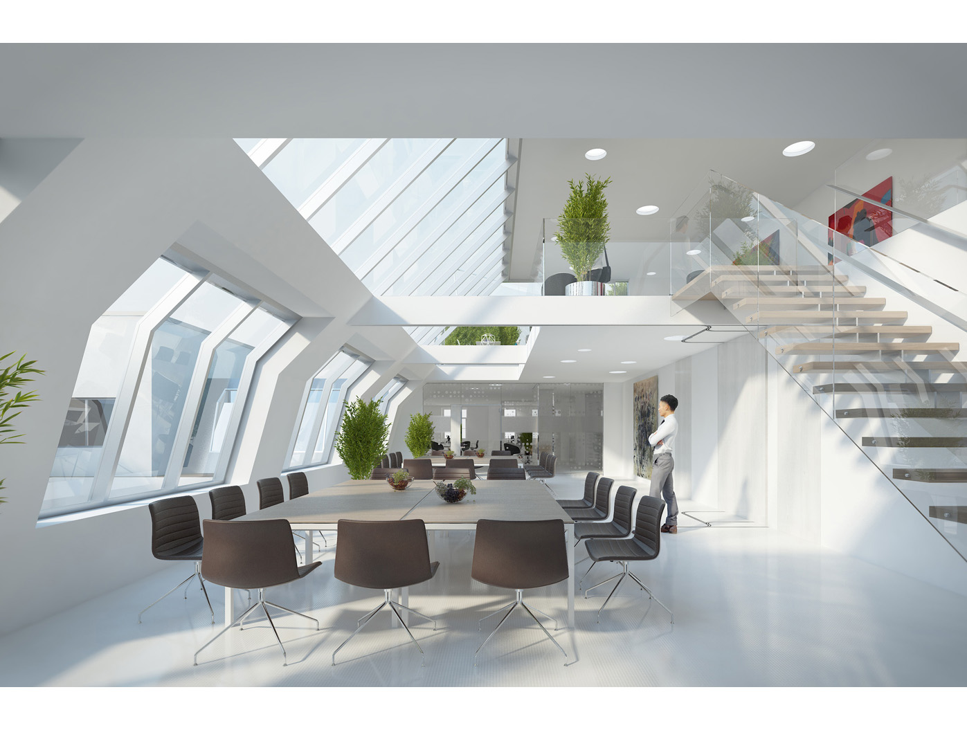 In den Büroetagen (1. bis 4. OG) entstehen durch einen hexagonalen, umlaufenden Gang neue Raumzonen, die moderne Arbeitswelten schaffen. Der ausgebaute Dachbereich beher- bergt den Vorstandsbereich mit einem multifunktionalen Innenhof- bereich, ausgestattet mit abtrenn- baren Besprechungs-, Sitzungs- und Diningräumen. Eine offene Treppe führt zur Galerie über dem Sitzungssaal, von der aus zwei schwebende Terrassen spektakuläre Ausblicke bieten. Ein Projekt, das Tradition und Innovation harmo- nisch verbindet.