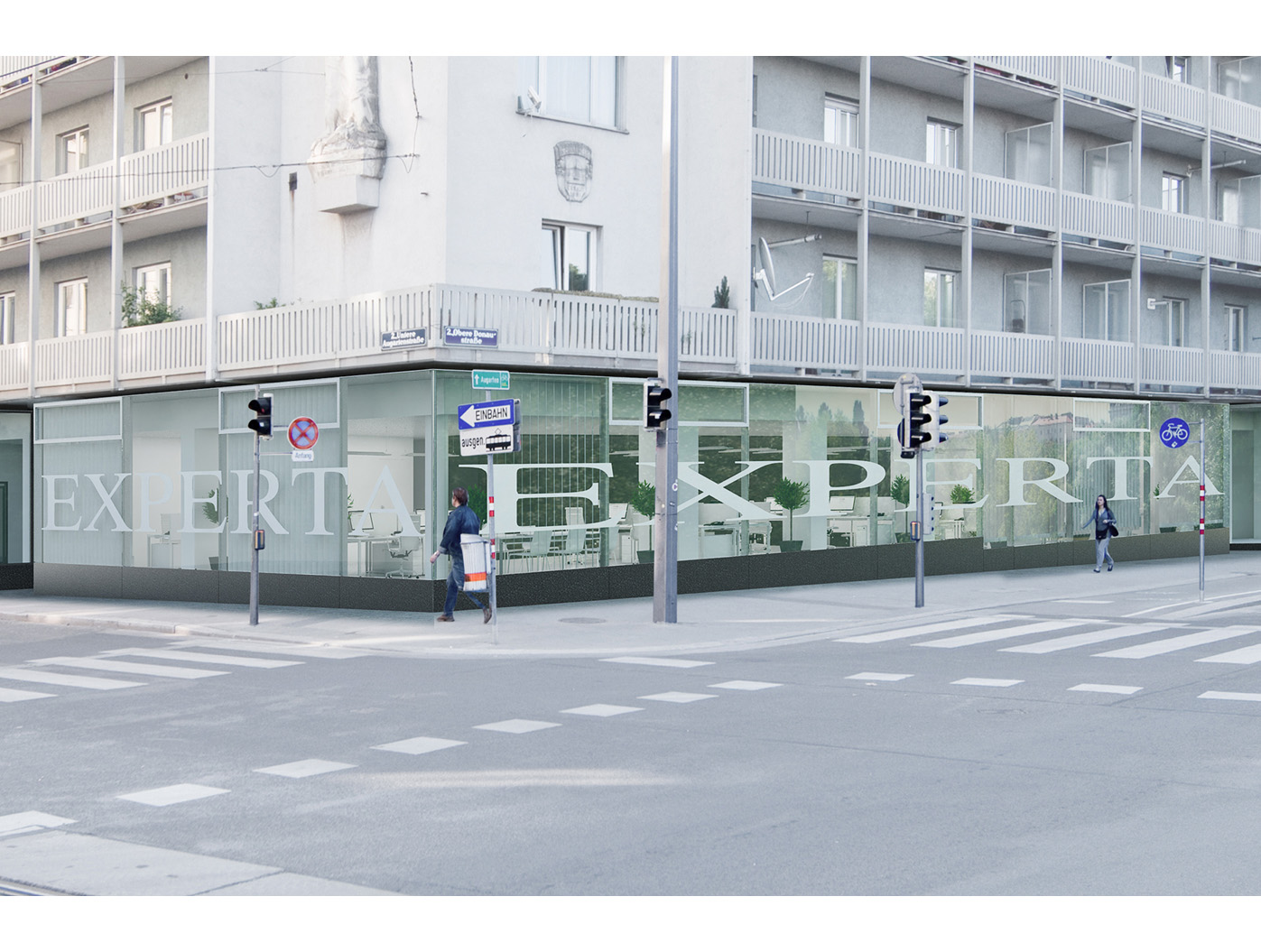 Ein bestehendes Geschäftslokal wurde umfassend renoviert und an die Bedürfnisse einer Versiche- rungsgesellschaft angepasst. Das Projekt umfasst eine vollständige Neugestaltung der Fassade, eine moderne Büroausstattung im In- neren sowie die behutsame Umge- staltung des Innenhofs.