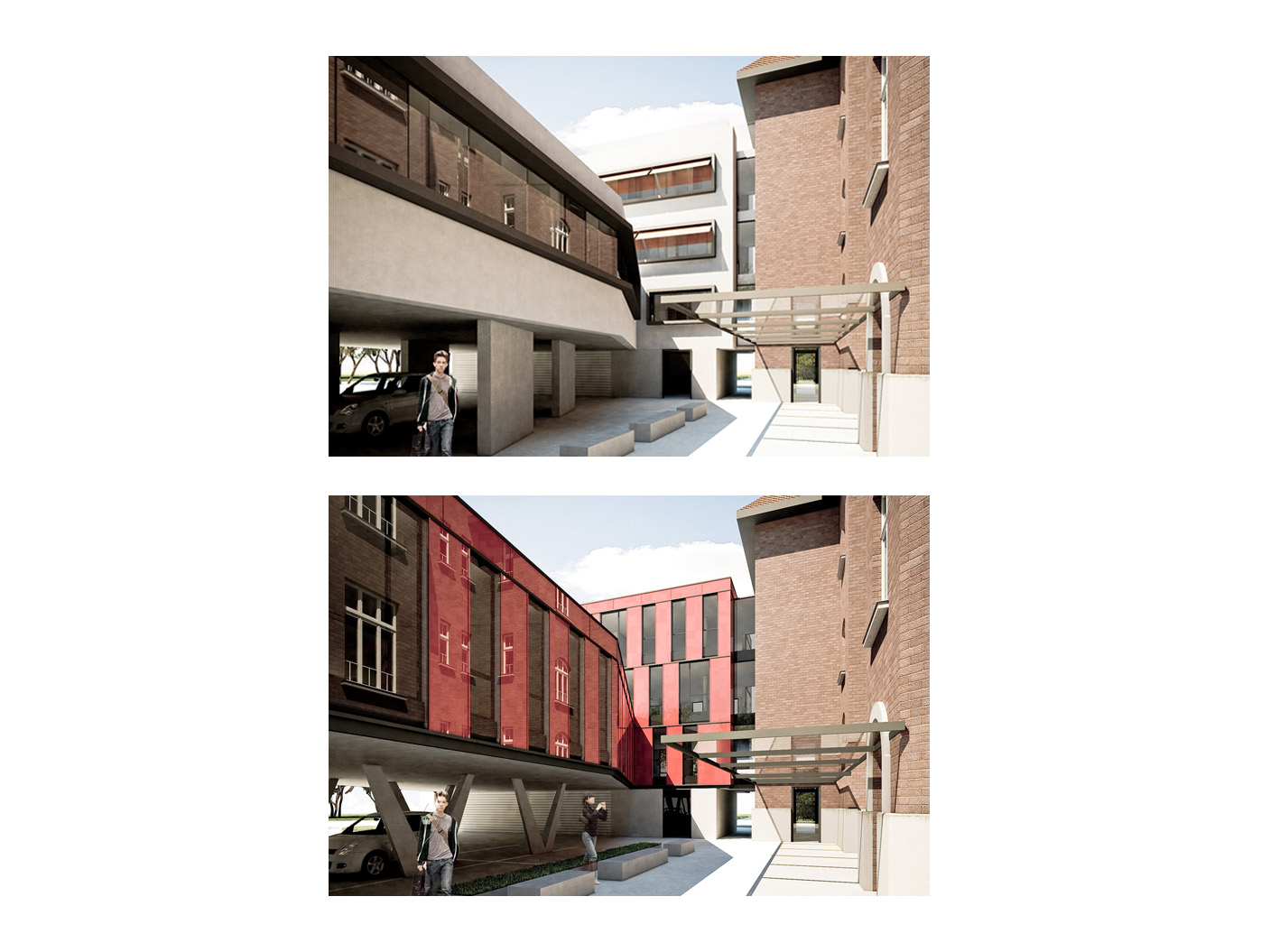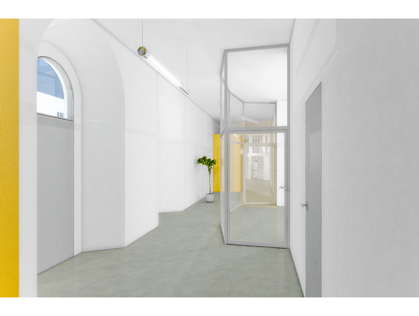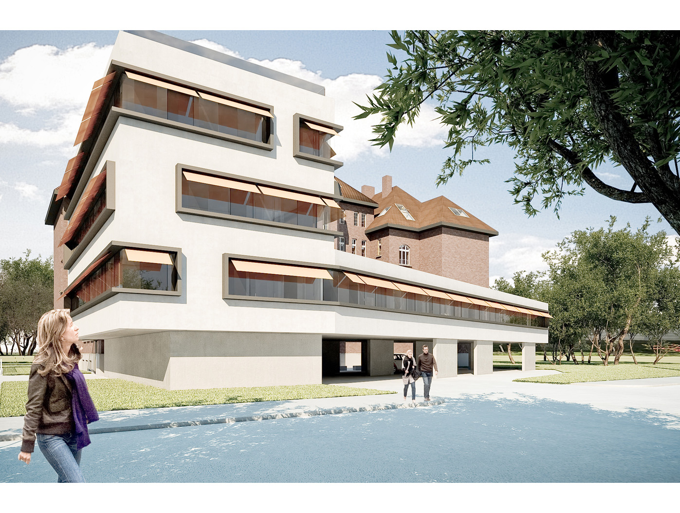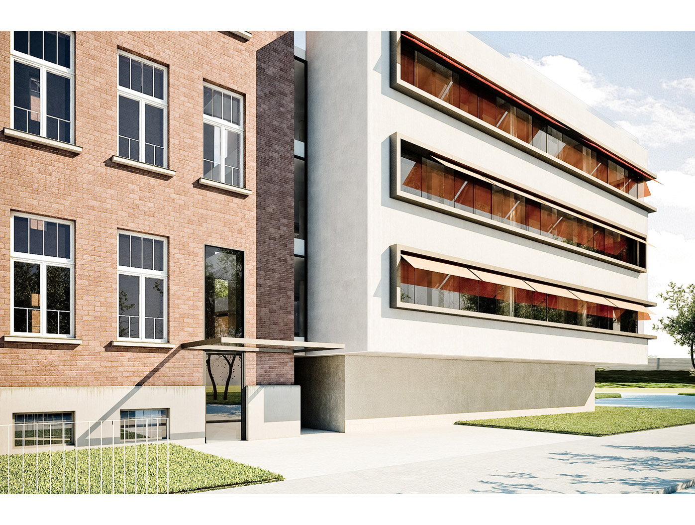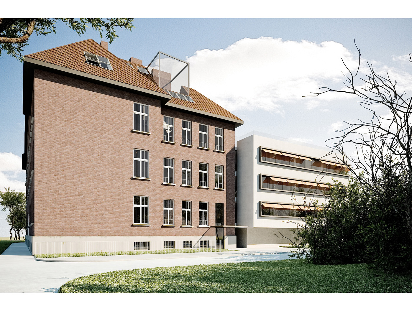 Mehrere Entwurfsvarianten für den Anbau wurden entwickelt, um eine optimale Lösung zwischen Funktio- nalität und architektonischer Integration zu finden. Das Ziel ist es, eine zeitgemässe Arbeitsum- gebung zu schaffen, die den Cha- rakter des historischen Gebäudes respektiert und gleichzeitig moder- ne Ansprüche an Flexibilität und Komfort erfüllt.
