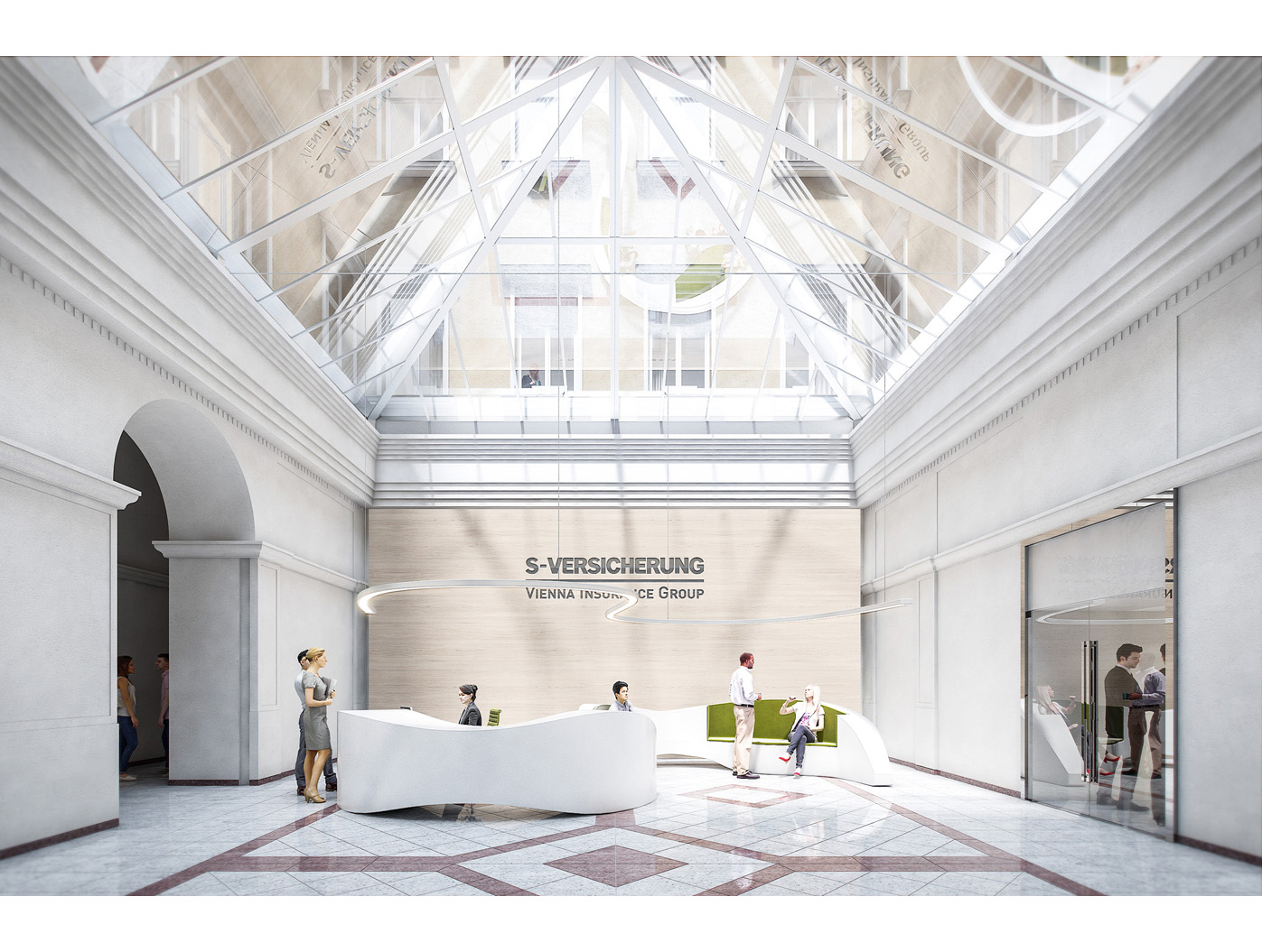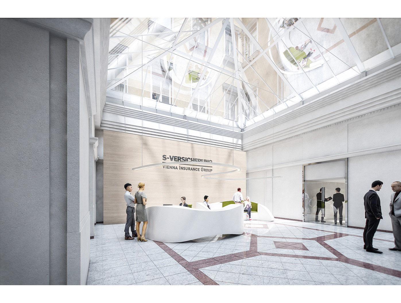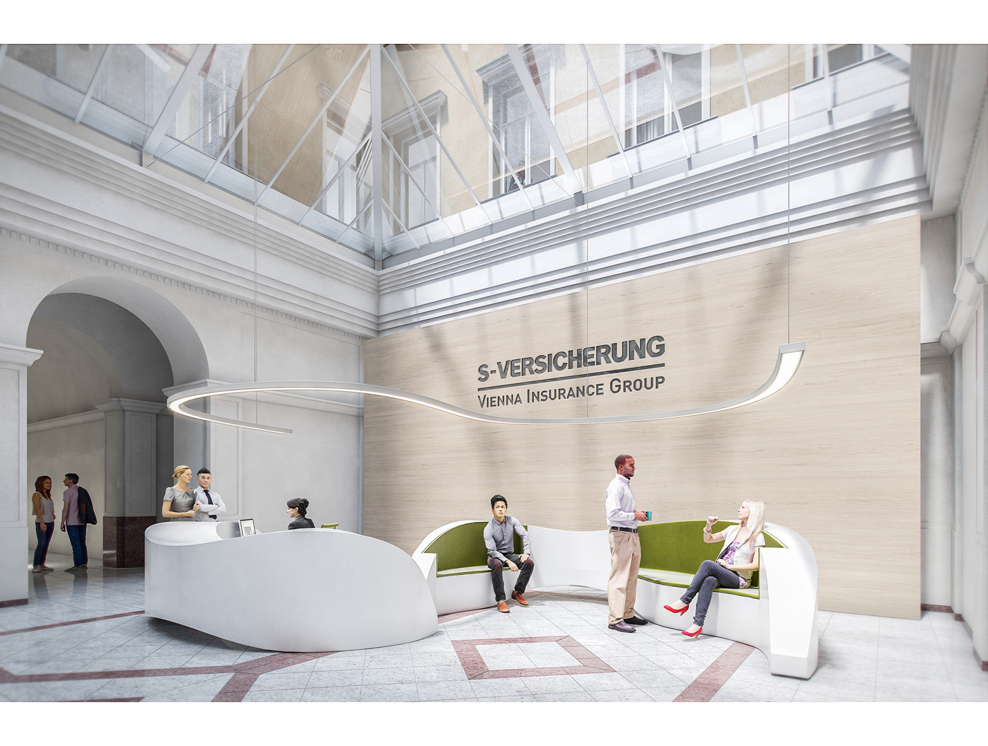 Grosszügige Glasflächen und schlanke Metallprofile ergänzen das Corian und betonen die transparente, offene Unternehmens- philosophie der S-Versicherung. Durch die fliessenden übergänge und die haptische Qualität des Materials entsteht ein Raum, der Funktionalität und Design perfekt vereint.