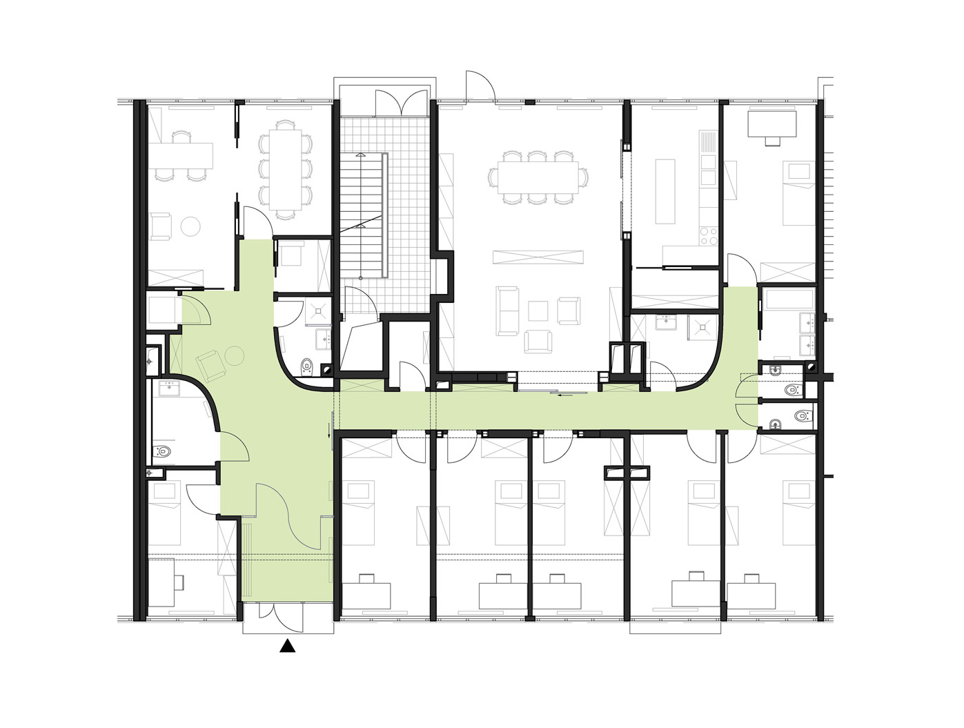 Im rückwärtigen Teil entsteht ein geschützter Wohnbereich, der durch eine deutliche räumliche Trennung vom vorderen Bereich Privatsphäre schafft. Fünf gleichgrosse Jugend- zimmer, zwei Bäder und zwei WCs sowie ein eigenes Betreuer- zimmer bilden hier den Wohnbereich. Besonderes Augenmerk liegt auf dem zum Hof orientierten Wohn- und Küchenbereich, der als gemein- schaftlicher Treffpunkt gestaltet ist und durch seine Ausrichtung eine angenehme, geborgene Atmos- phäre erzeugt.