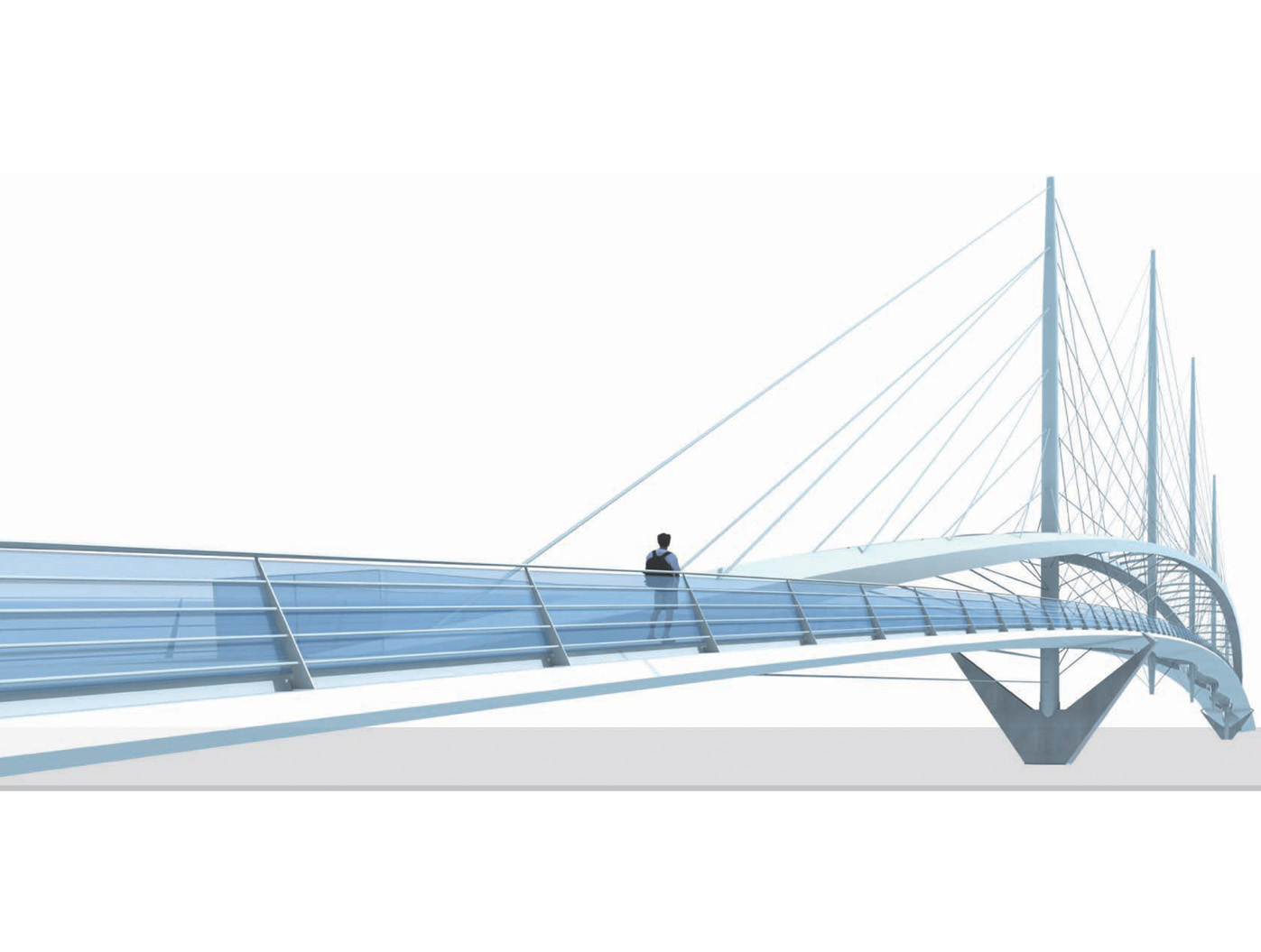 Die neue Fussgängerbrücke schafft eine elegante Verbindung zwischen Stadtzentrum und Urfahraner Markt und prägt damit künftig das Linzer Stadtbild. Ihre innovative Konstruk- tion vereint ingenieurtechnische Präzision mit landschaftlicher Ein- bettung. Als bewusst leichter Kon- trast zur massiven Nibelungen- brücke entwickelt sich der filigrane Steg gemeinsam mit dem Lentos zum neuen Wahrzeichen der Kultur- hauptstadt.