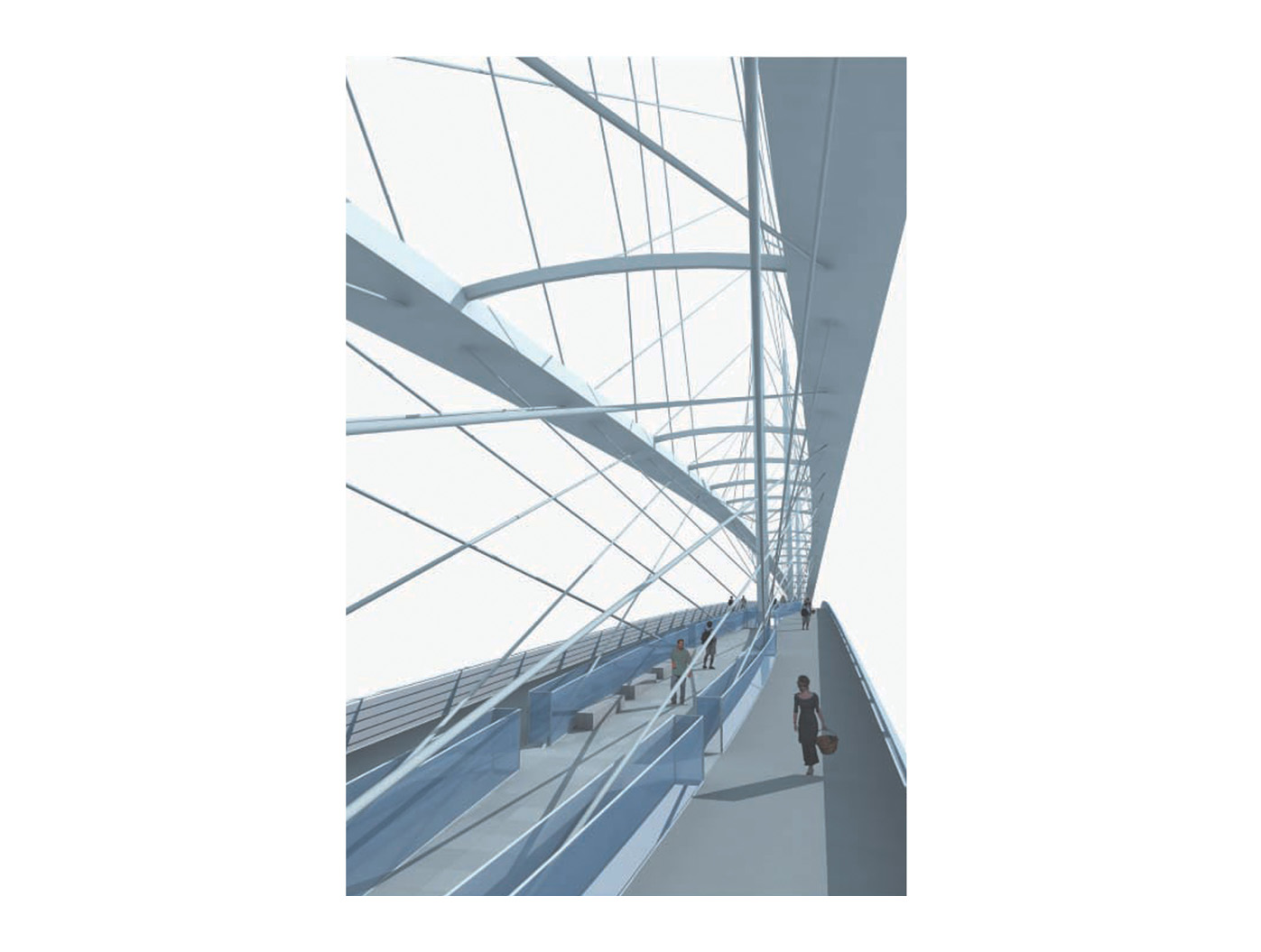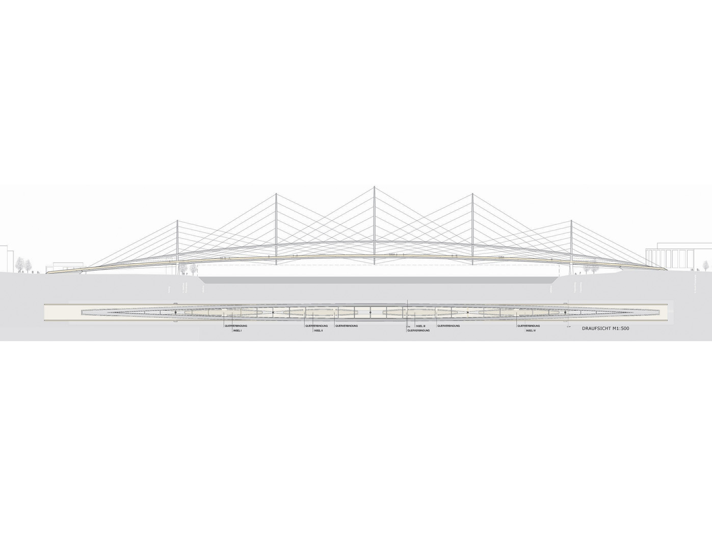 Dank einer raffinierten Seilkon- struktion zwischen Untergurt, der als Gehfläche dient, und geteiltem Obergurt entsteht trotz grosser Spannweite eine aussergewöhnlich schlanke Form. Die geschwungenen Rampen folgen dem Geländeverlauf und ermöglichen selbst die Be- fahrung mit Einsatzfahrzeugen. Auf der Urfahraner Seite ergänzt ein Lift die barrierearme Erschliessung.
