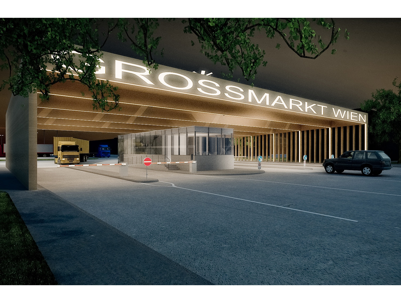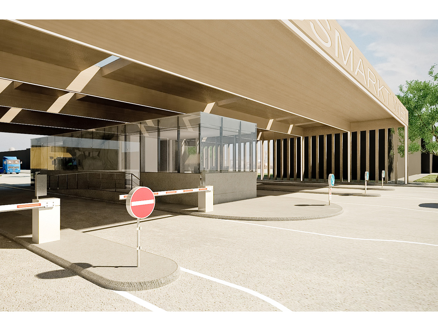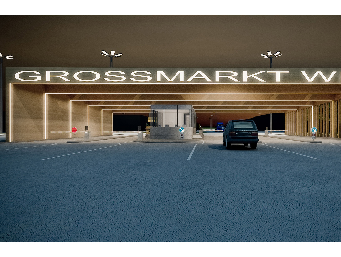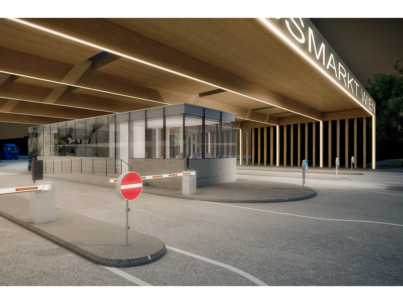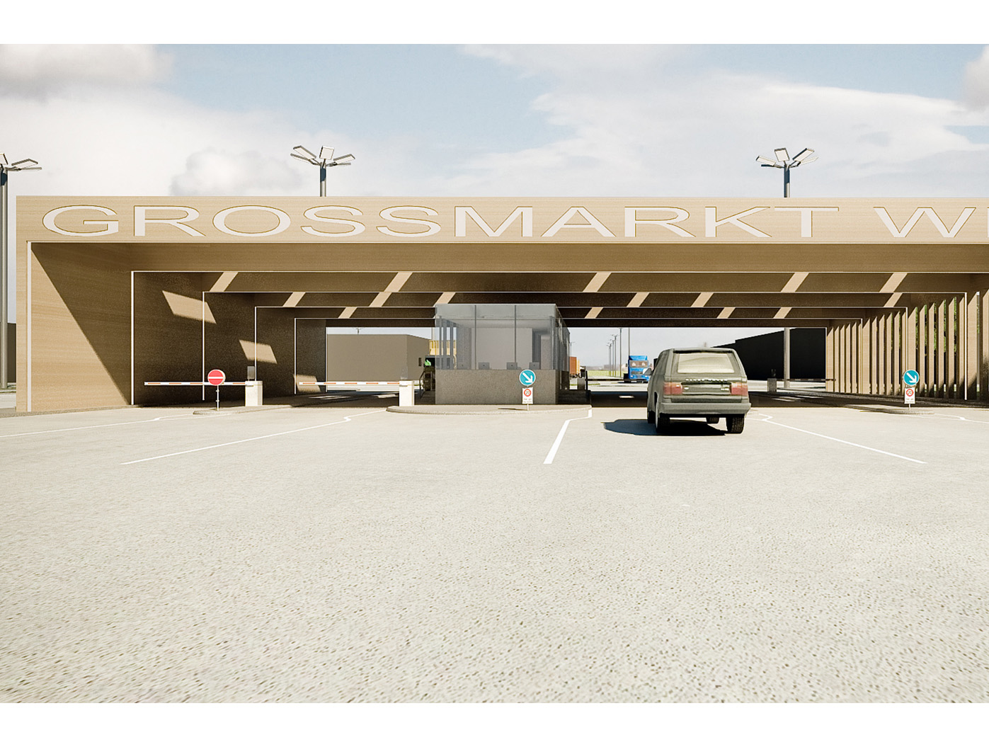 Die neue, markante überdachung am Eingang des Marktgeländes inszen- iert sich als eine grossformatige, leicht geneigte Tor-Situation. Mit einer freitragenden Spannweite von 33 Metern überspannt sie die Ein- und Ausfahrten sowie die Portier- loge und setzt einen klaren städte- baulichen Akzent. In der Nacht wird die Struktur durch gezielte Be- leuchtung als leuchtender Rahmen wahrnehmbar.