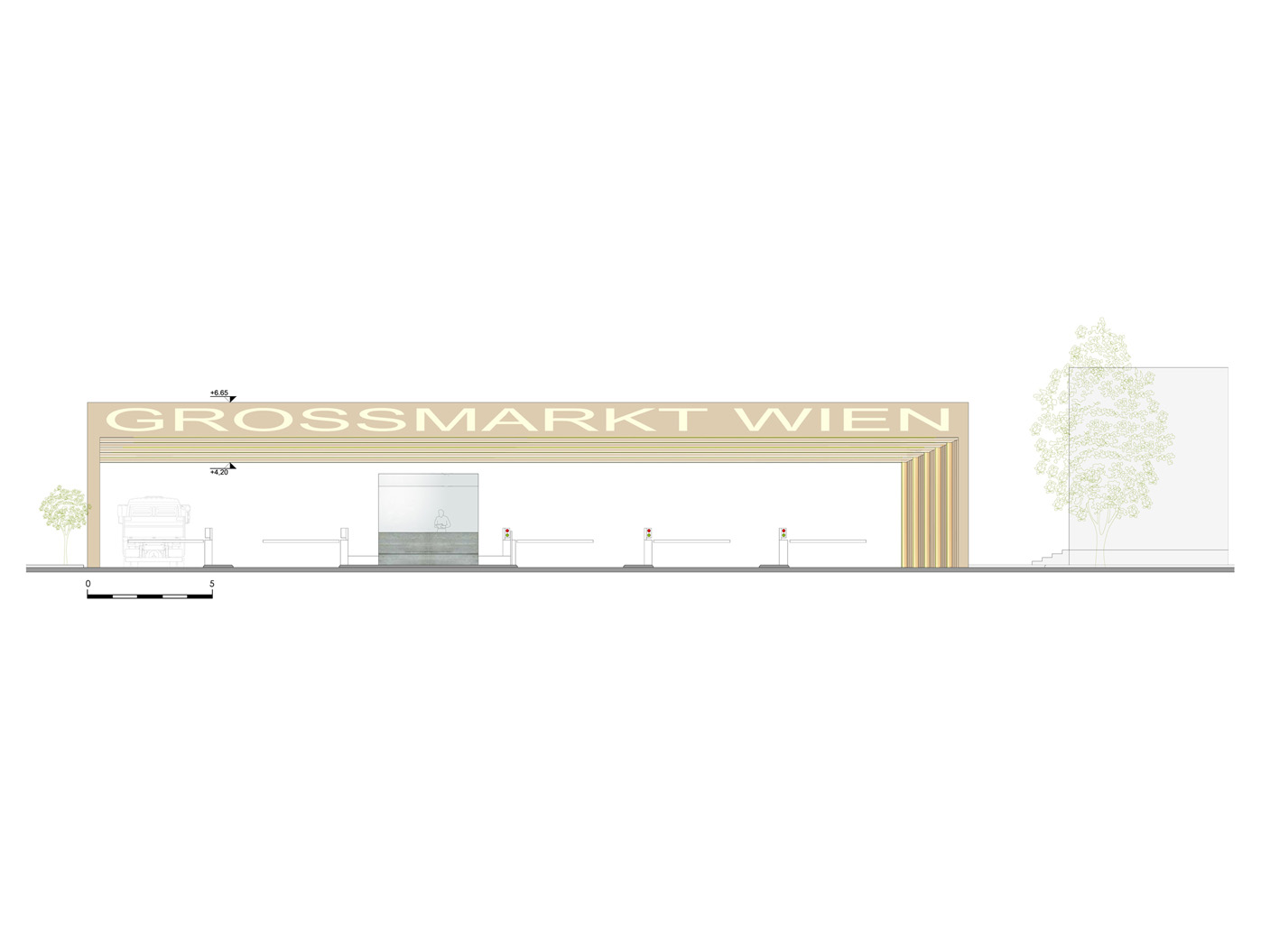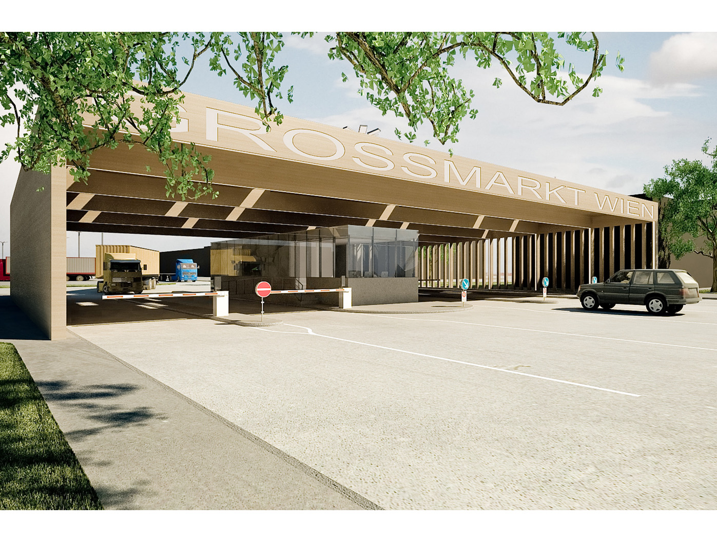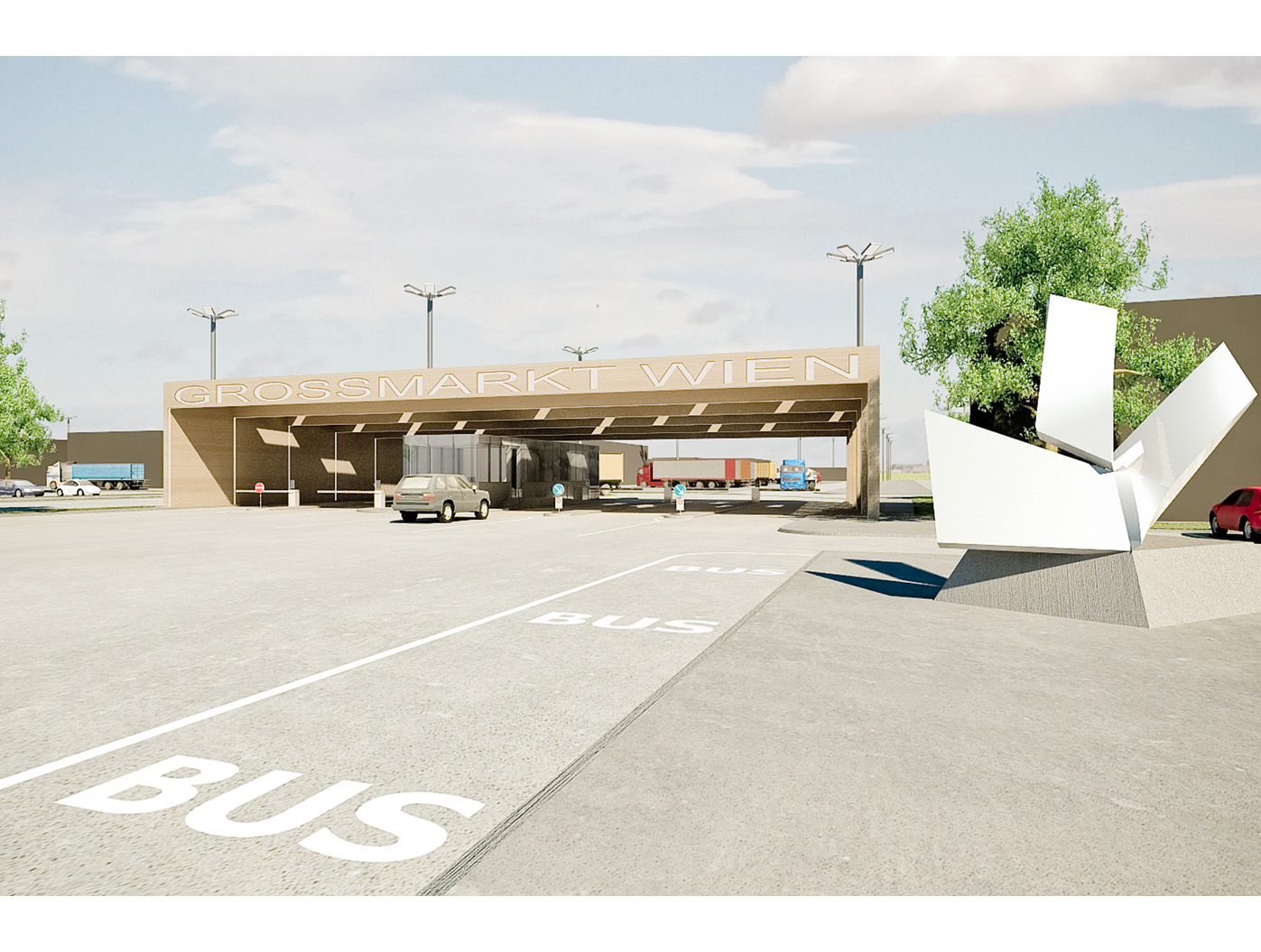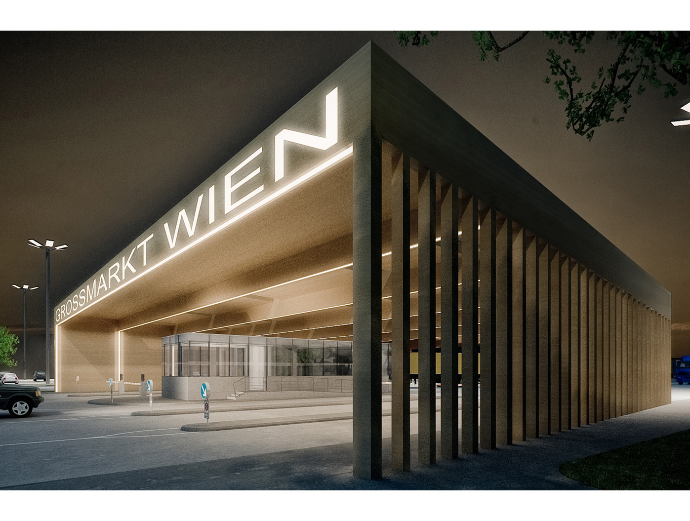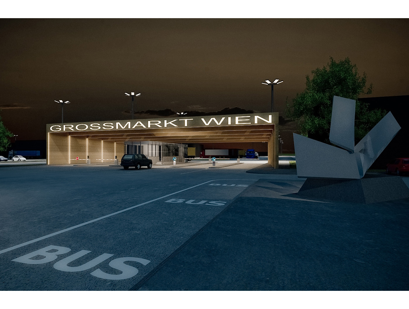 Die neue, markante überdachung am Eingang des Marktgeländes inszen- iert sich als eine grossformatige, leicht geneigte Tor-Situation. Mit einer freitragenden Spannweite von 33 Metern überspannt sie die Ein- und Ausfahrten sowie die Portier- loge und setzt einen klaren städte- baulichen Akzent. In der Nacht wird die Struktur durch gezielte Be- leuchtung als leuchtender Rahmen wahrnehmbar.