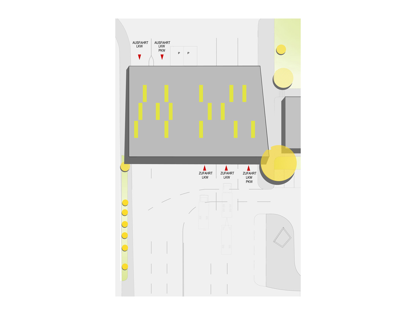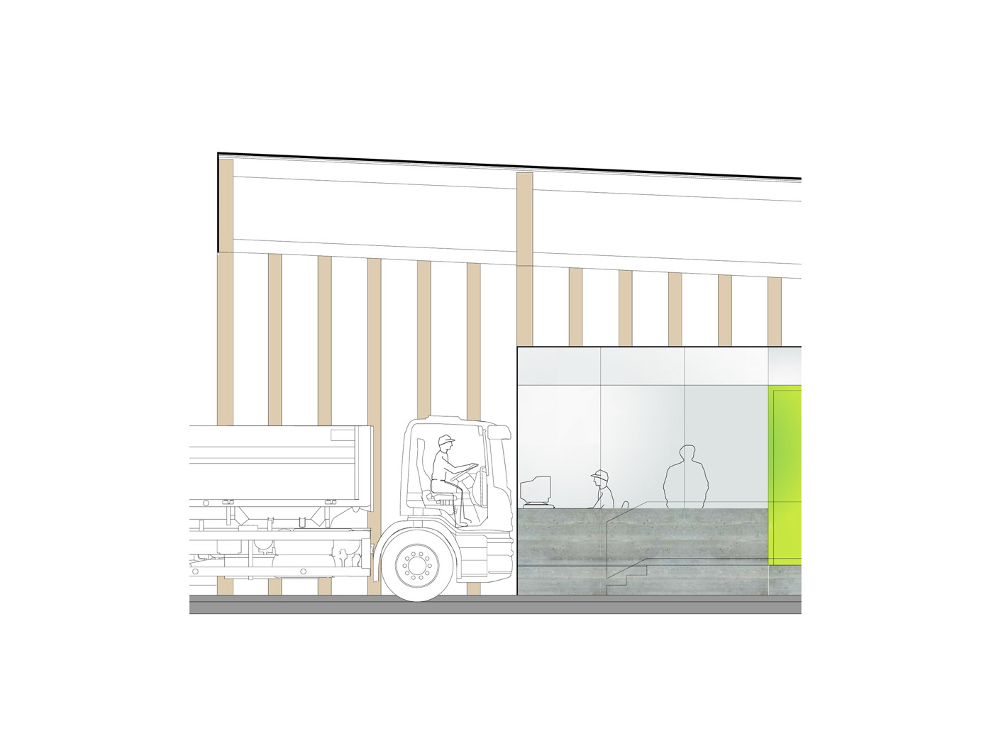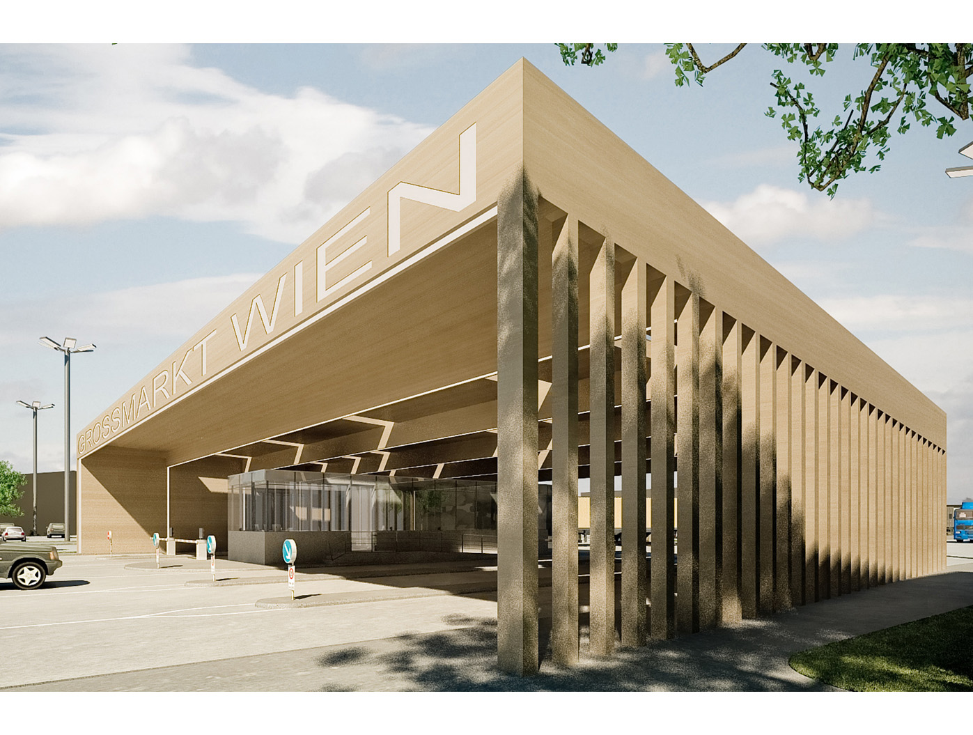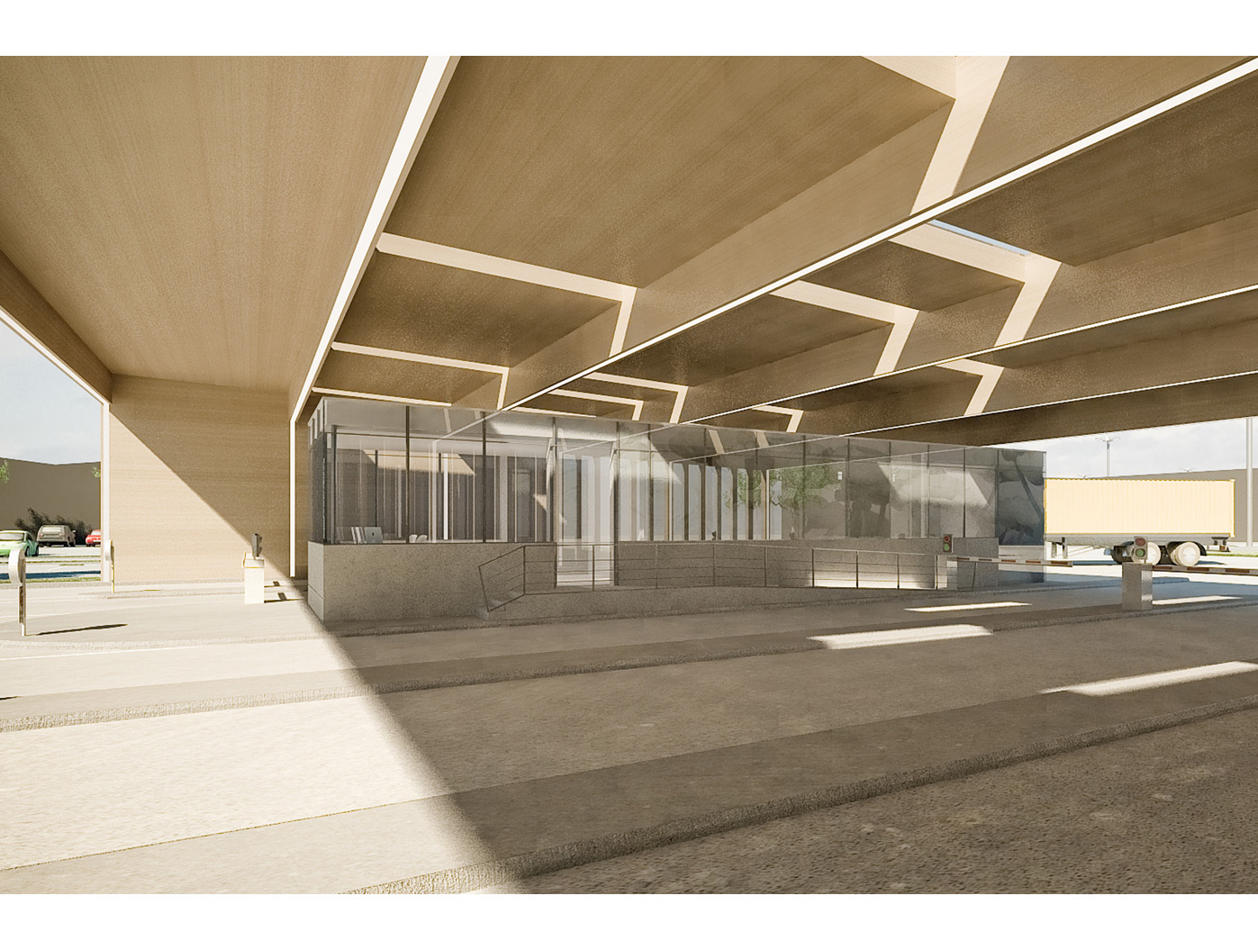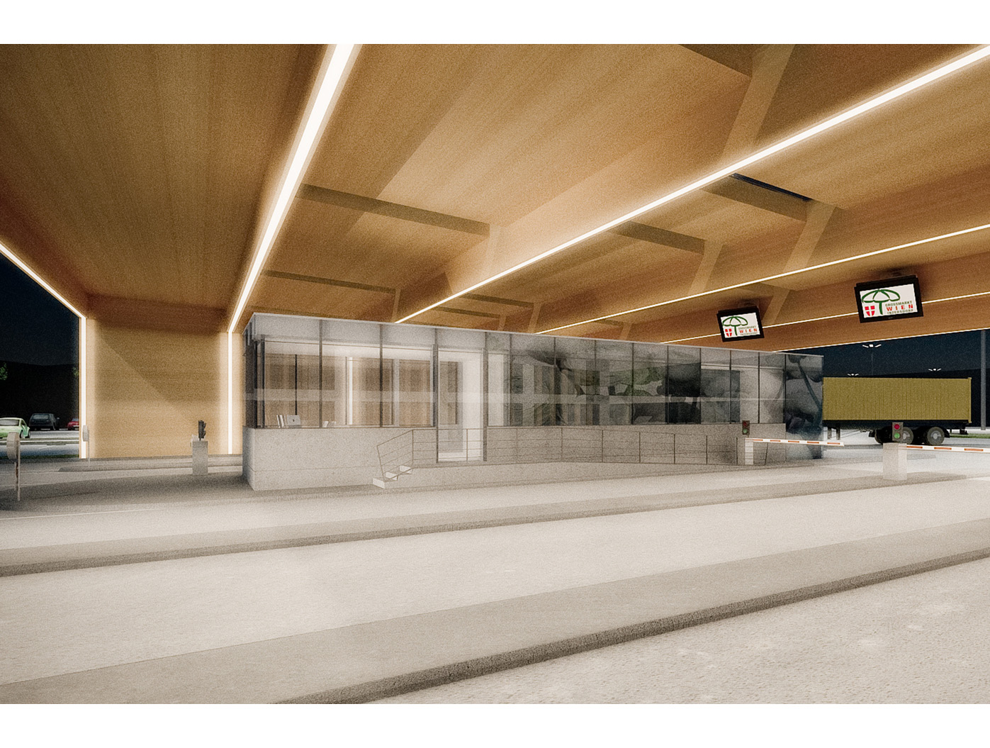 Die neue, markante überdachung am Eingang des Marktgeländes inszen- iert sich als eine grossformatige, leicht geneigte Tor-Situation. Mit einer freitragenden Spannweite von 33 Metern überspannt sie die Ein- und Ausfahrten sowie die Portier- loge und setzt einen klaren städte- baulichen Akzent. In der Nacht wird die Struktur durch gezielte Be- leuchtung als leuchtender Rahmen wahrnehmbar.