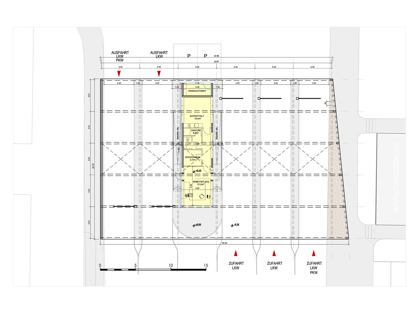 Das Portiergebäude fungiert als transparenter Kontrollpunkt: Seine Fassade kombiniert wärmegedämmte Betonfertigteile mit einer umlauf- enden, bedruckten Glasfassade. Die teils durchsichtige, teils mit Marktmotiven versehene Verglasung schafft ein lebendiges Spiel von Licht und Sichtbeziehungen. Zur Kühlung des Serverraums dient ein Lüftungsgerät auf dem Flugdach, während ein Konvektorgang die Anbindung an das Verwaltungs- gebäude sicherstellt.