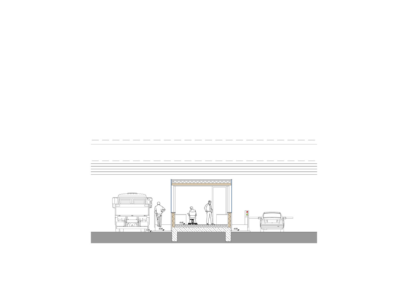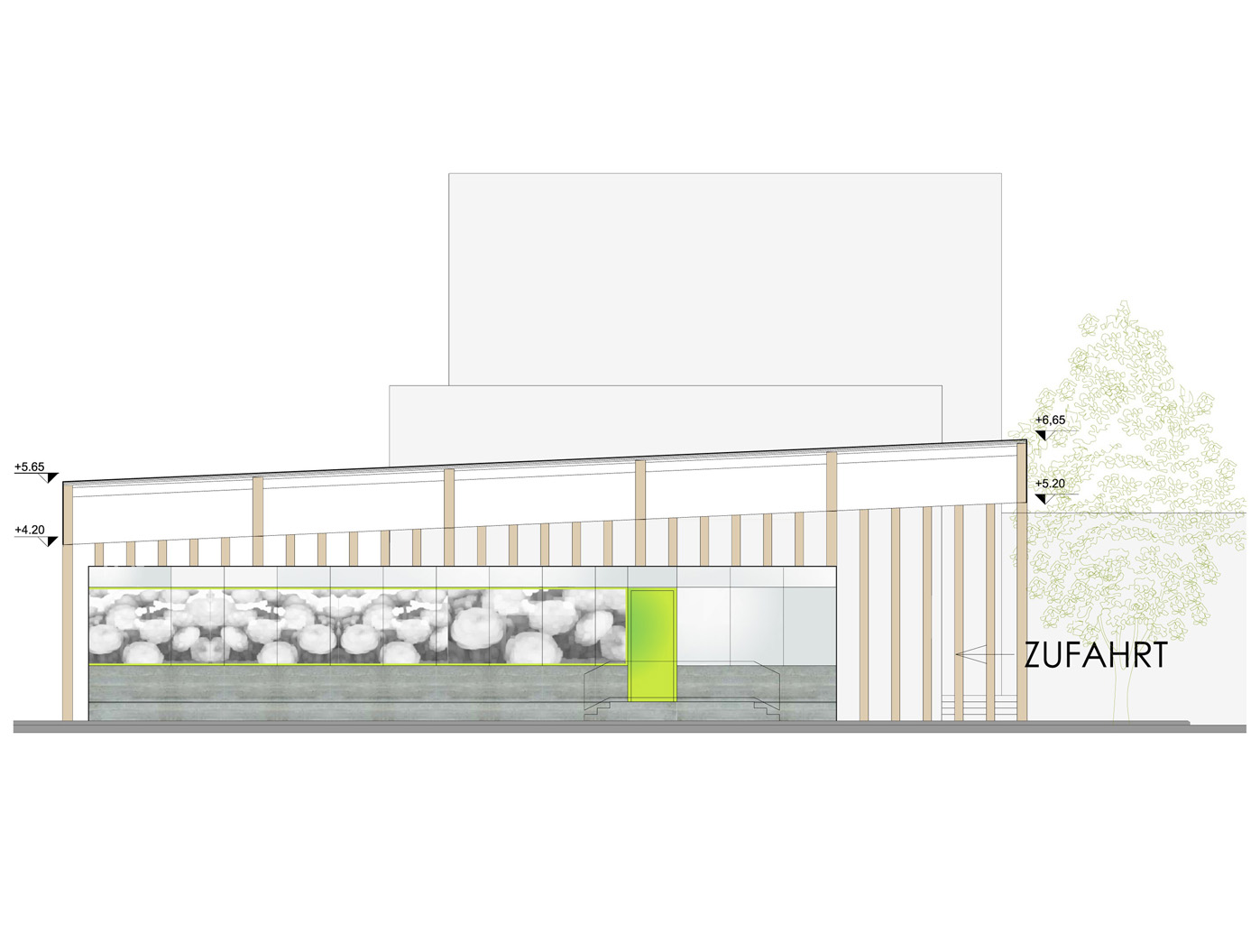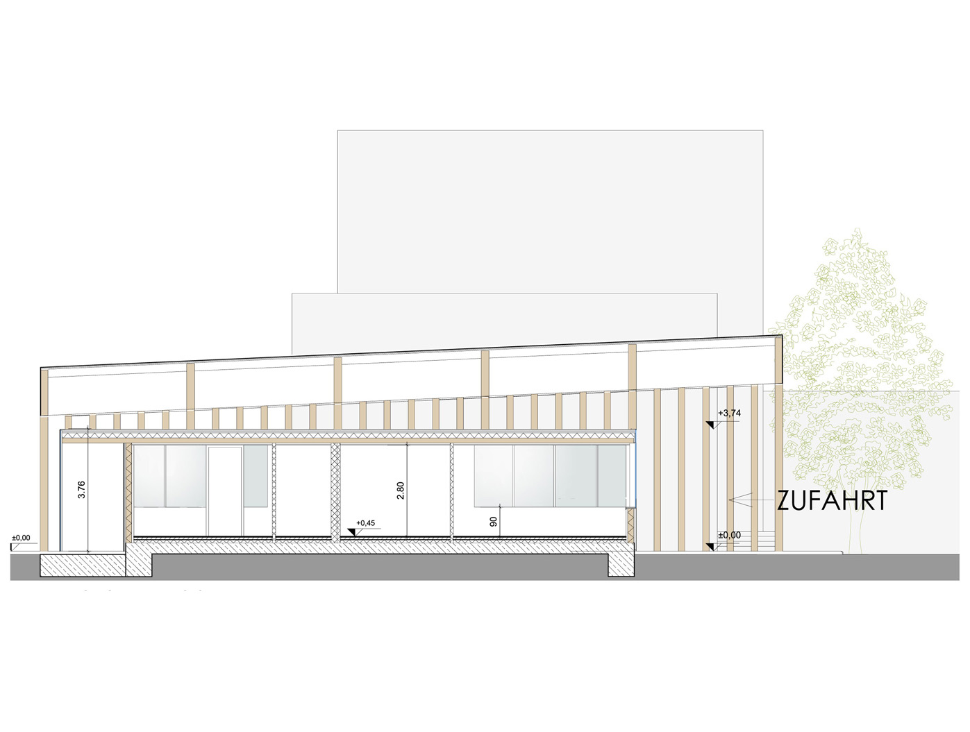 Die Tragkonstruktion, wahlweise in Holz oder Stahl ausführbar, besteht aus sechs Trägern, die einerseits auf einer massiven Wand und ander- erseits auf einer filigranen Lamel- lentützenwand aufliegen. Diese auf- gelöste Stützenwand ermöglicht Durchblicke und verbindet das Tor mit dem umliegenden Areal. Die Aus- steifung übernimmt die Untersicht- verkleidung, die je nach Material- wahl in Holz oder Metall gestaltet wird.