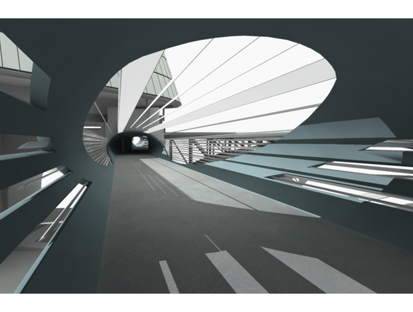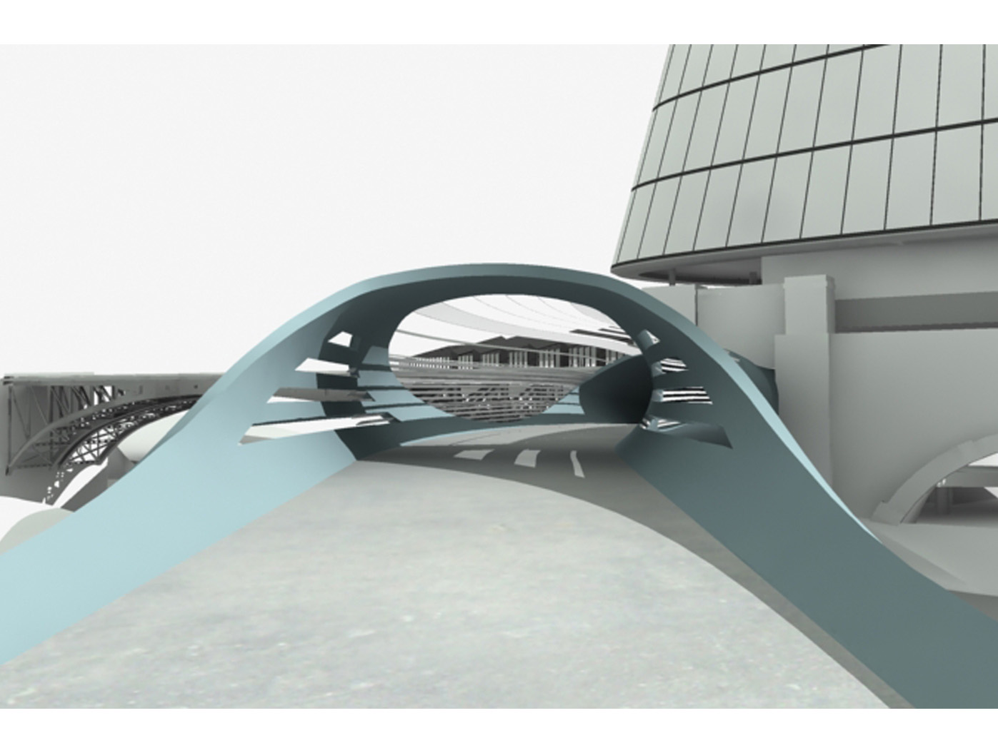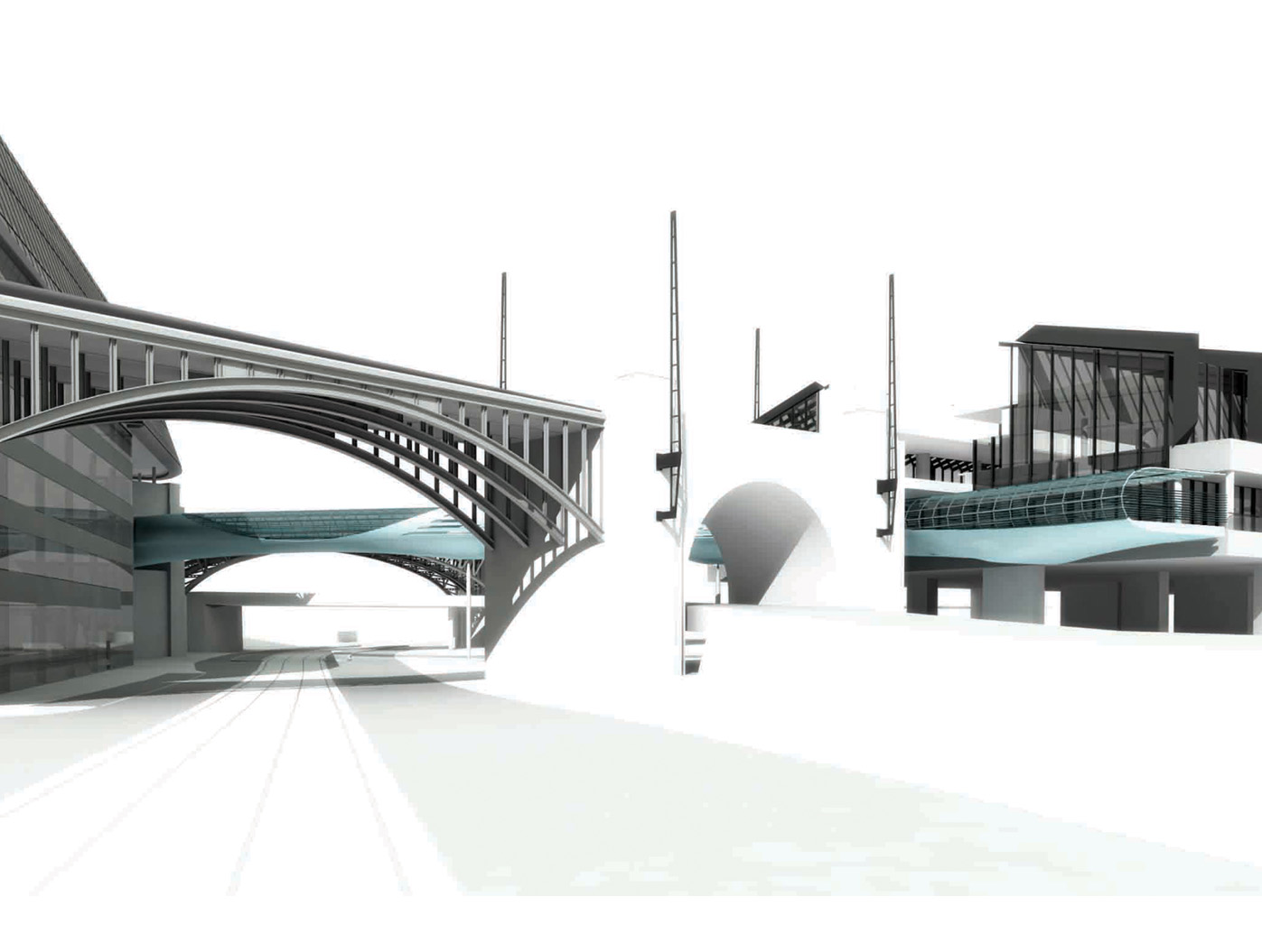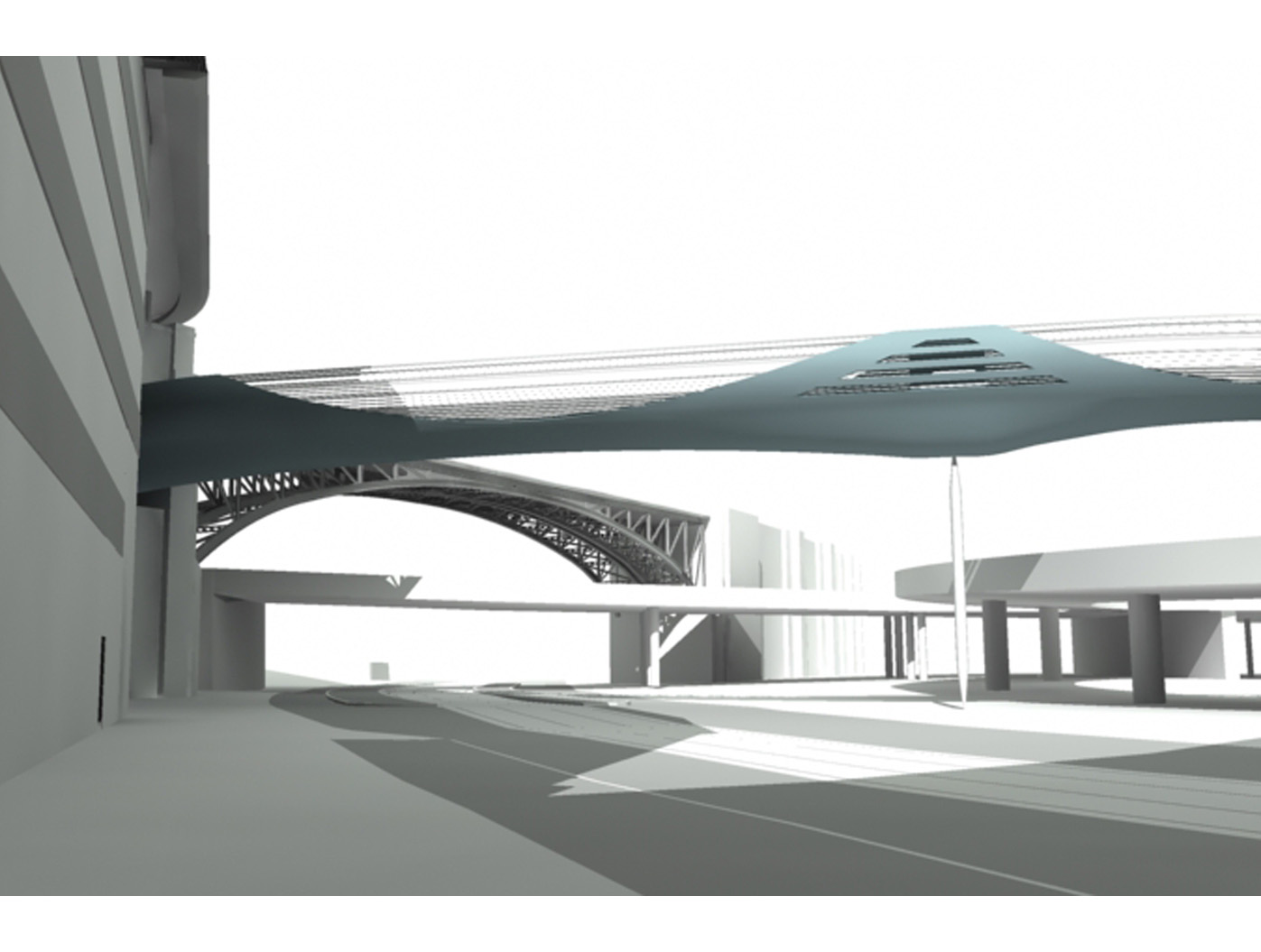 Inmitten einer von Verkehrsadern durchzogenen Landschaft entsteht der Skywalk als elegante Lösung für eine zunächst rein funktionale Aufgabe: das Verbinden von Orten. Die Architektur antwortet auf die Herausforderung des Ortes mit einer dynamischen Formensprache, die sich aus dem Dialog mit den bestehenden Bewegungslinien ent- wickelt. Mehr als nur eine über- querungshilfe wird der Skywalk zu einer Plattform, die den besonderen Reiz dieser urbanen Situation er- fahrbar macht, eine Inszenierung der scheinbaren Willkür des Raumes, die sich im Gestaltungsprozess zu einer eigenständigen ästhetik verdichtet.