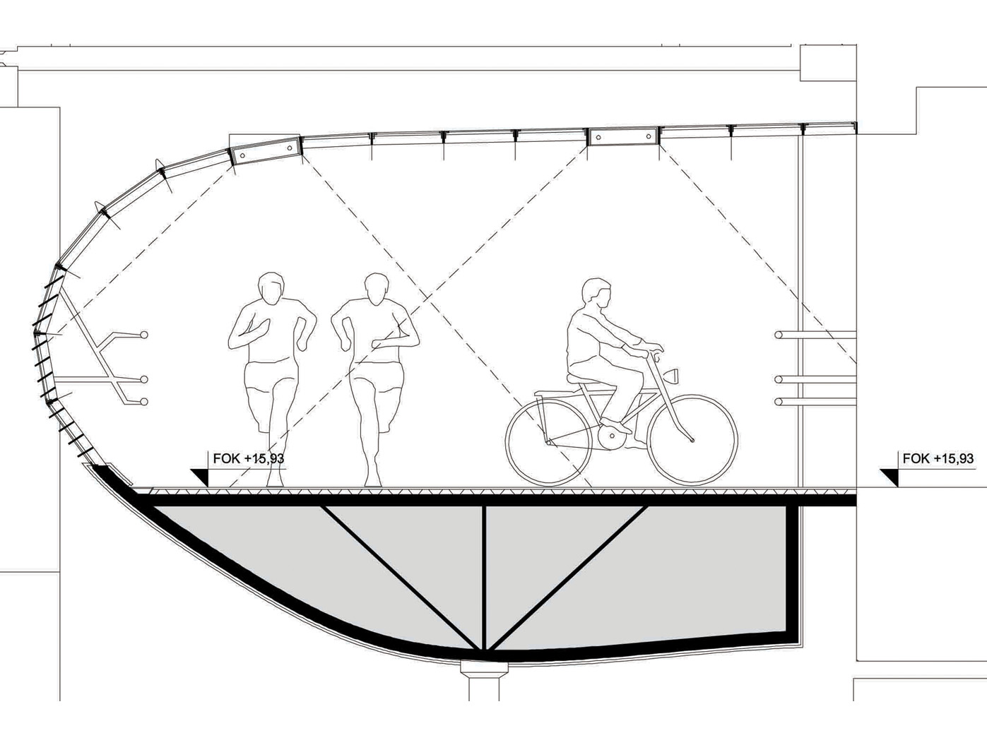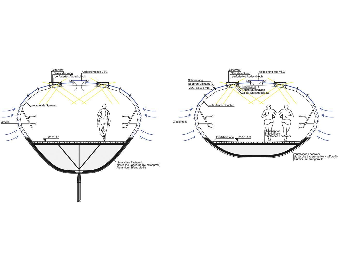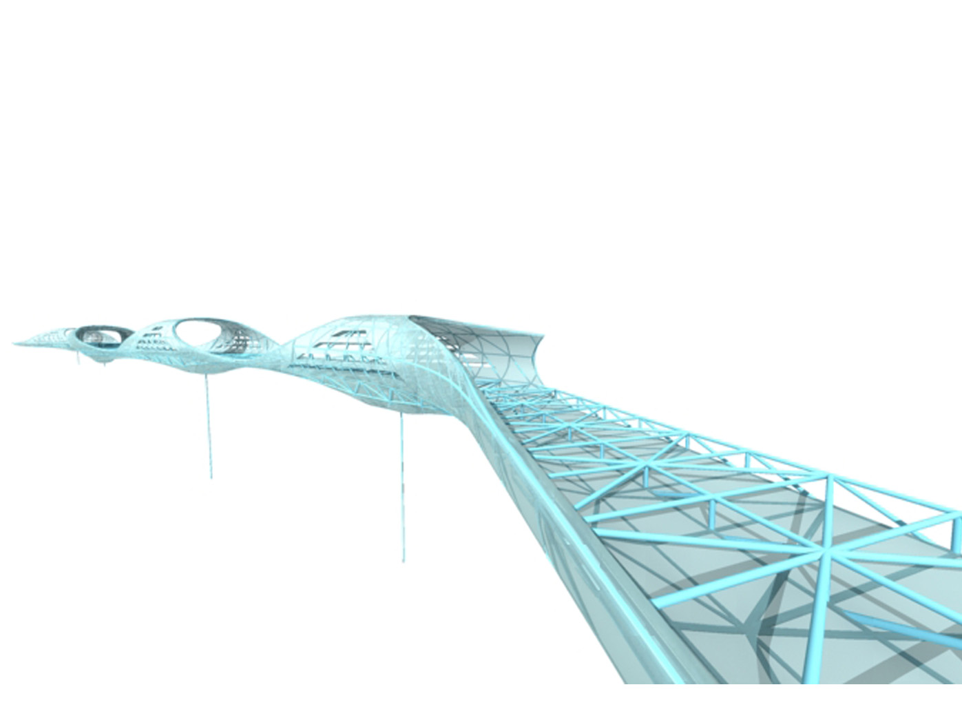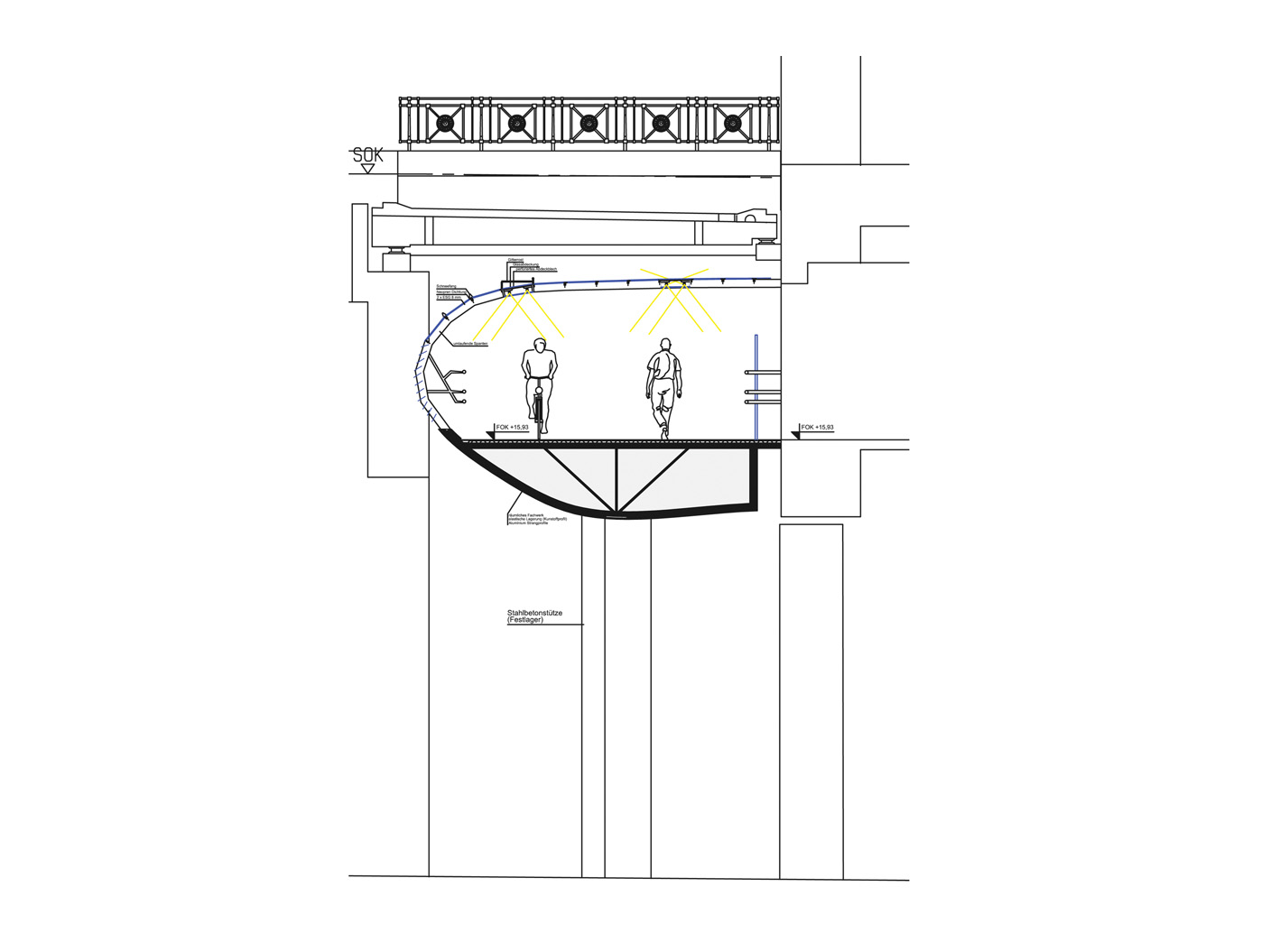 Die Brückenkonstruktion vereint Transparenz und Geschlossenheit in einer ausgewogenen Materialkompo- sition. Durchsichtige Elemente aus Glas oder textilen Membranen wech- seln sich mit metallverkleideten Abschnitten ab, die durch ihre Oberflächenbehandlung eine eigene Präsenz entfalten. Der innere Geh- und Radweg aus Gussasphalt gewährleistet komfortable Nutzbar- keit, während durchgehende Licht- bänder in der oberen Hülle nicht nur für Orientierung sorgen, sondern auch nach aussen strahlen und so den Skywalk zu einem markanten nächtlichen Element der Stadtsilhouette machen.
