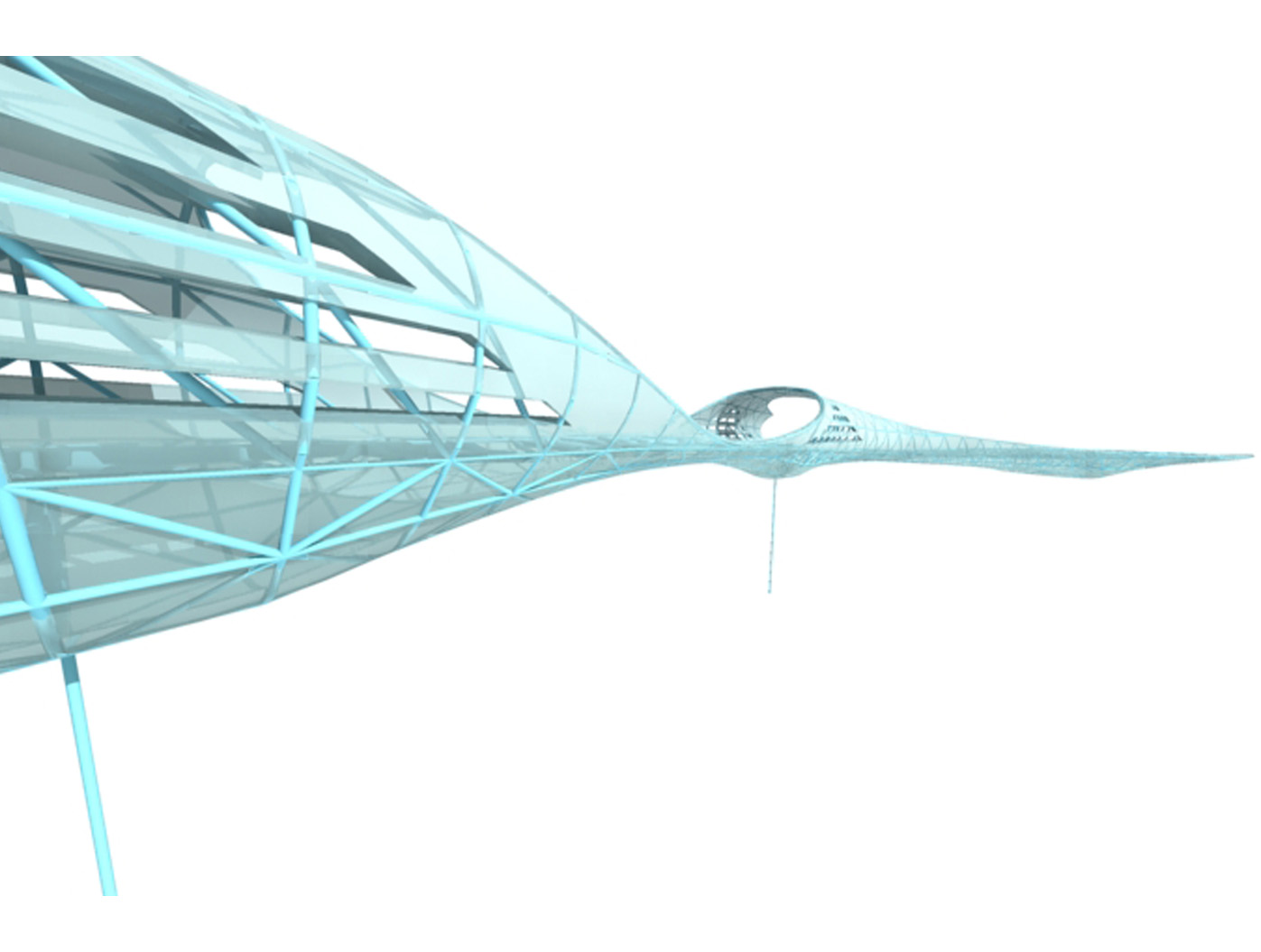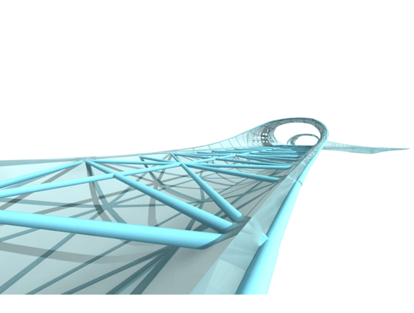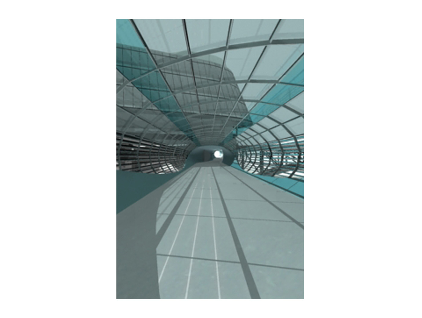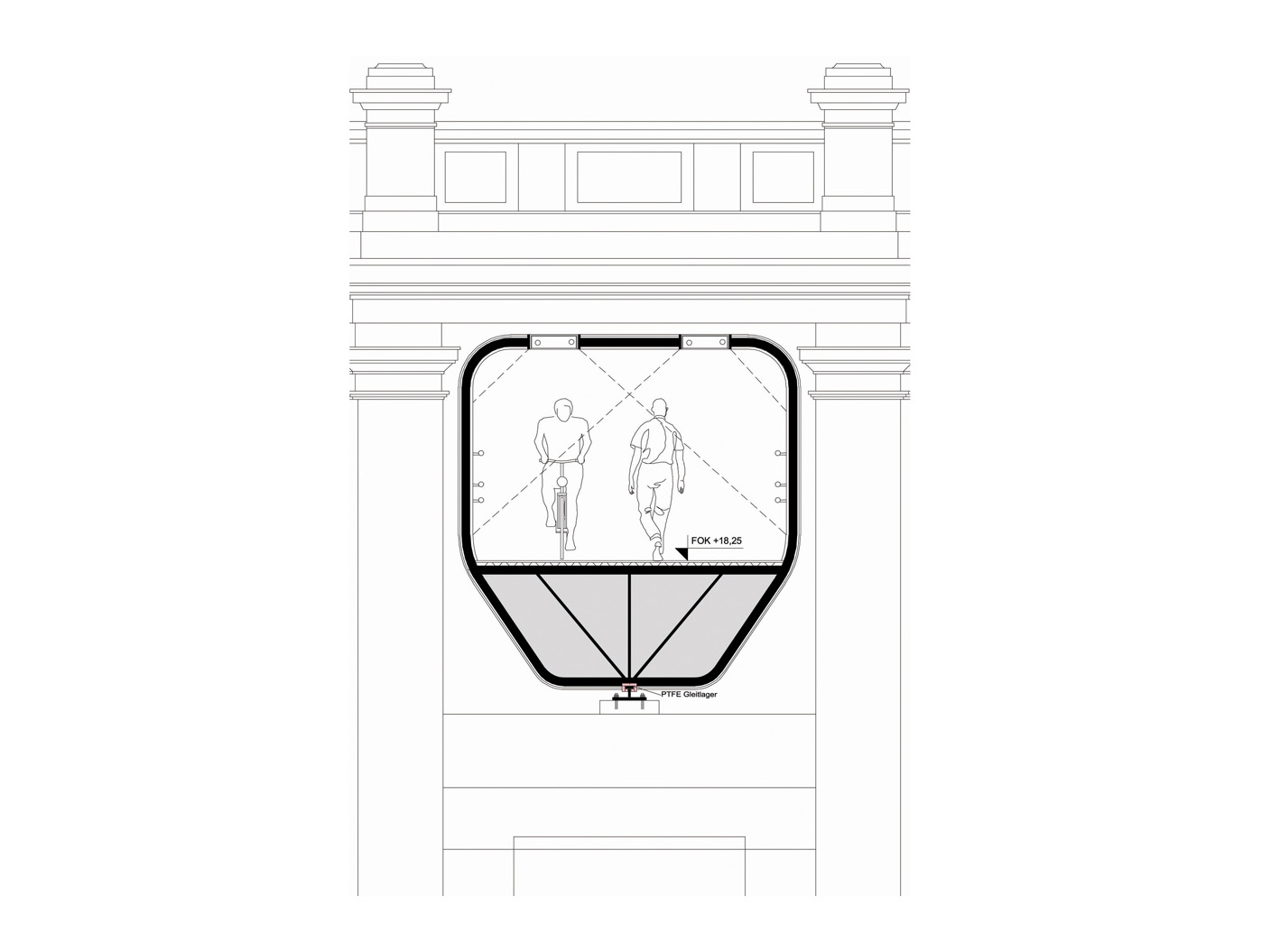 Die Brückenkonstruktion vereint Transparenz und Geschlossenheit in einer ausgewogenen Materialkompo- sition. Durchsichtige Elemente aus Glas oder textilen Membranen wech- seln sich mit metallverkleideten Abschnitten ab, die durch ihre Oberflächenbehandlung eine eigene Präsenz entfalten. Der innere Geh- und Radweg aus Gussasphalt gewährleistet komfortable Nutzbar- keit, während durchgehende Licht- bänder in der oberen Hülle nicht nur für Orientierung sorgen, sondern auch nach aussen strahlen und so den Skywalk zu einem markanten nächtlichen Element der Stadtsilhouette machen.