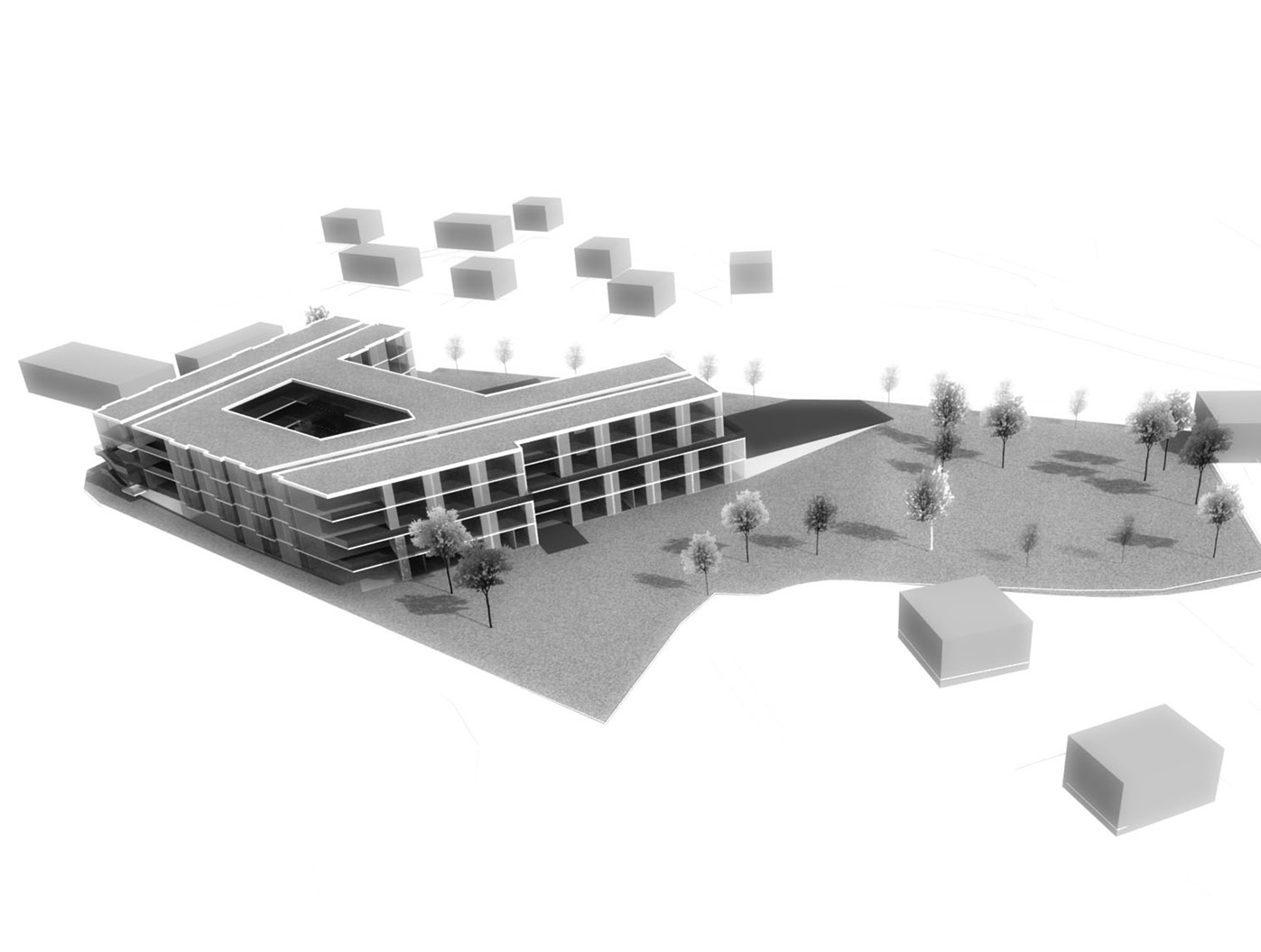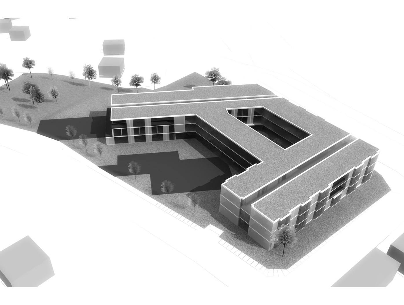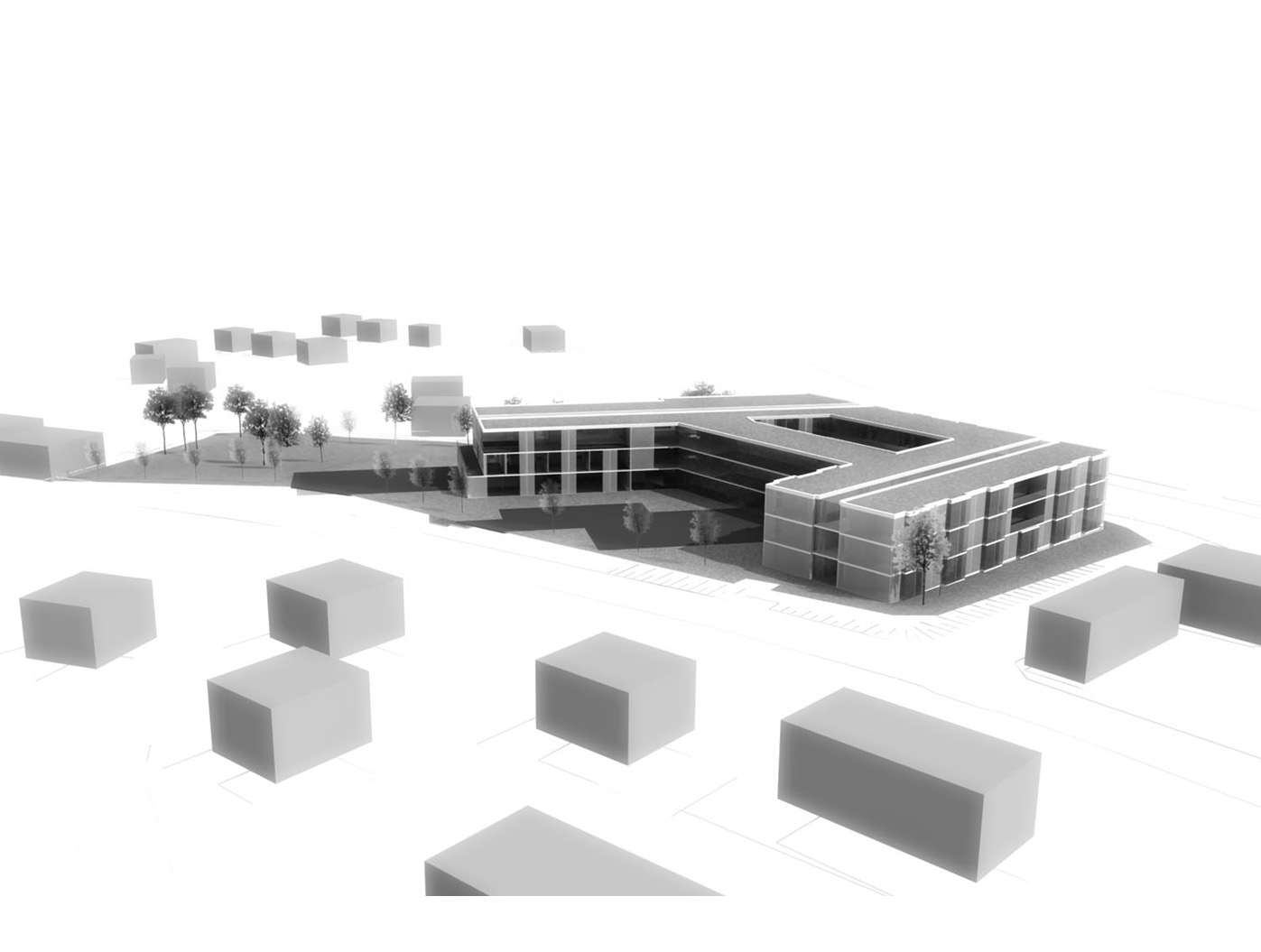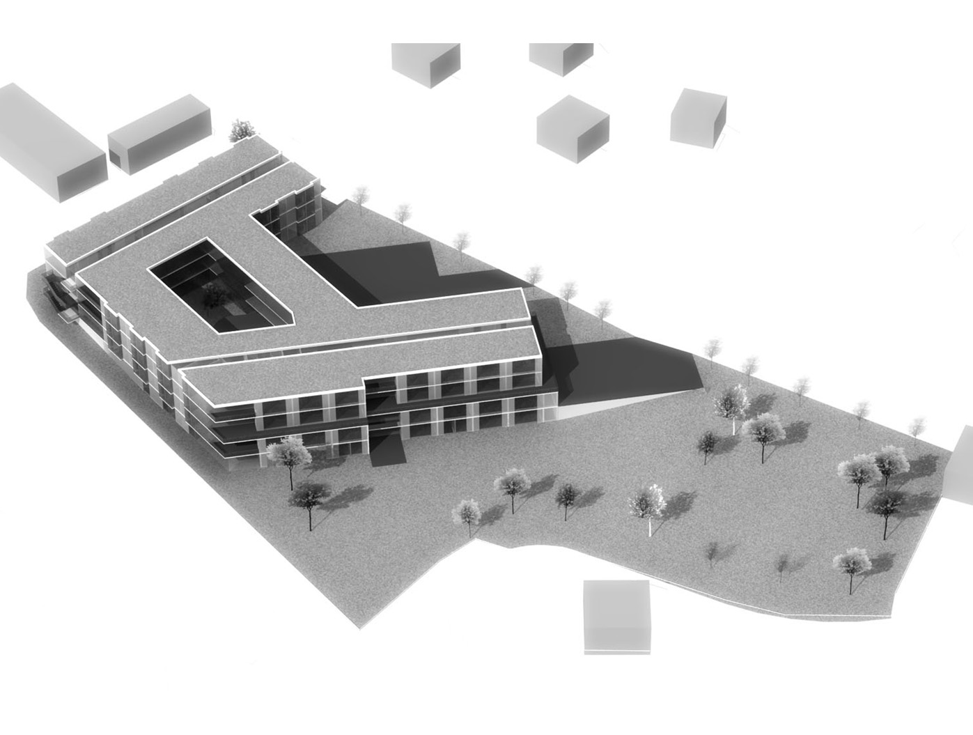 Unser Entwurf formt das städte- bauliche Bild durch klare, redu- zierte Baukörper neu. Der besteh- ende Bauteil wird bereinigt und durch einen dreigeschossigen, L-förmigen Neubau ergänzt, zusam- mengefasst um ein geschütztes, begrüntes Atrium.