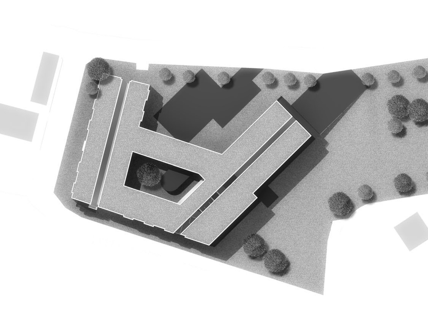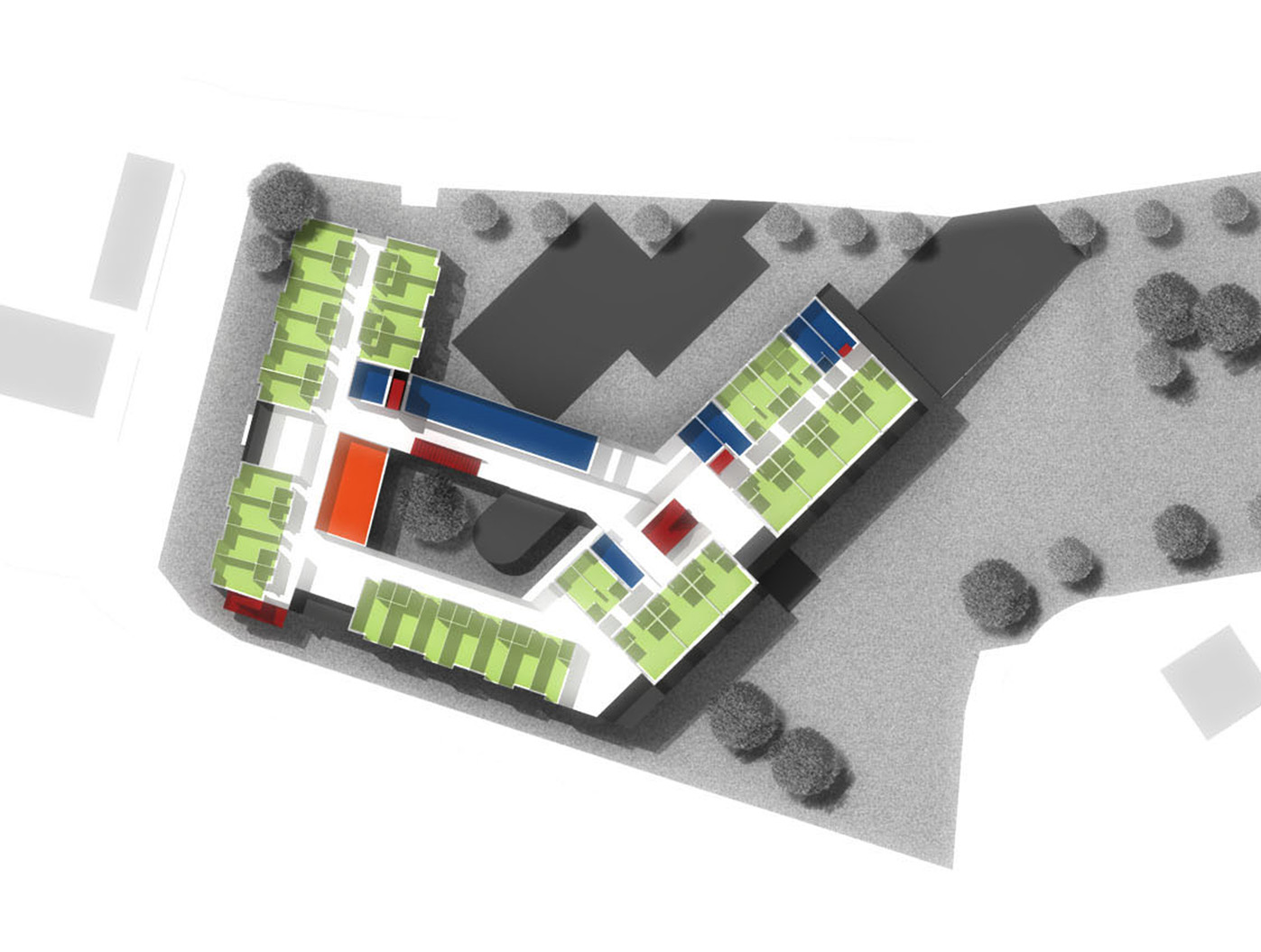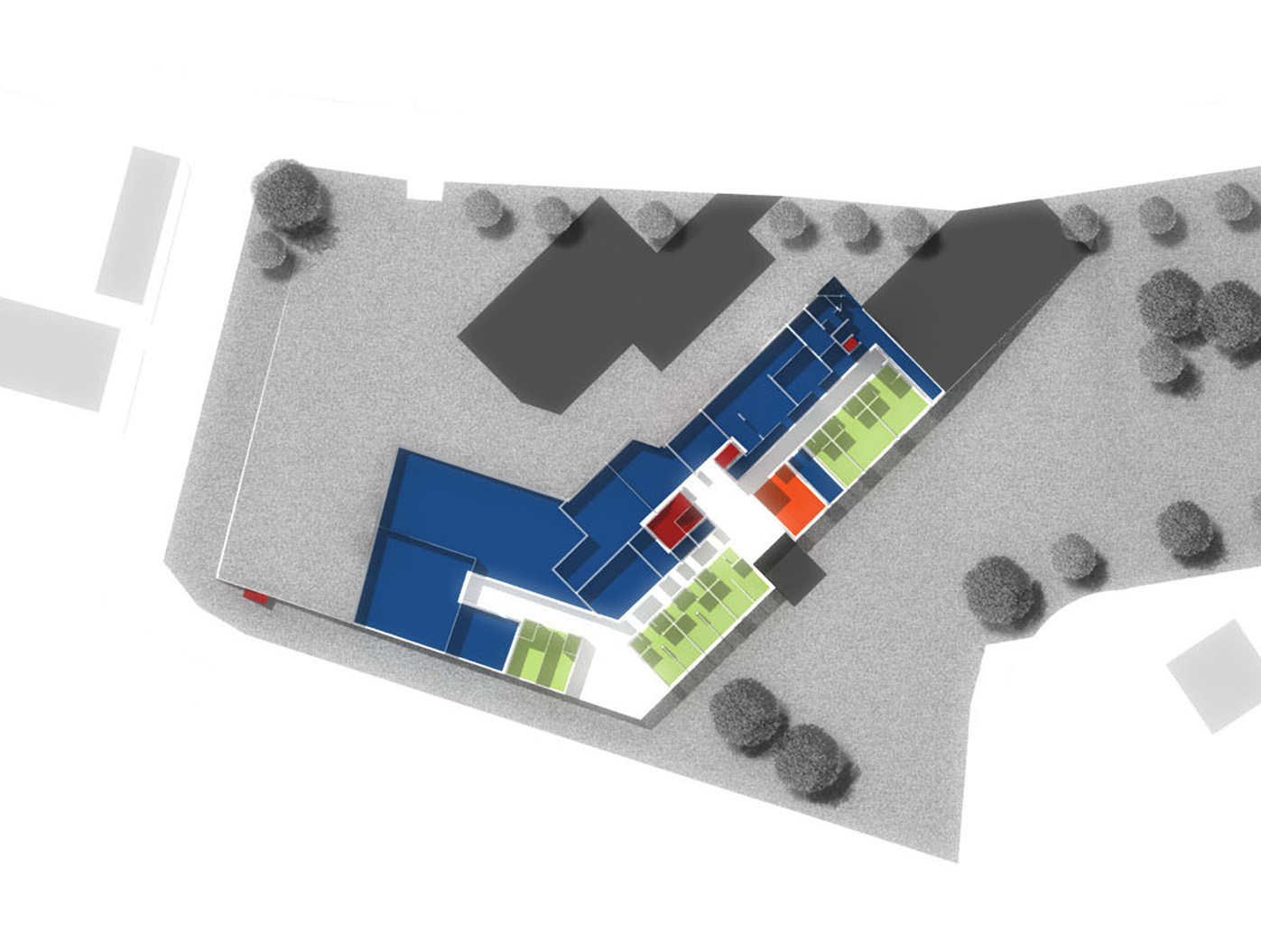 Unser Entwurf formt das städte- bauliche Bild durch klare, redu- zierte Baukörper neu. Der besteh- ende Bauteil wird bereinigt und durch einen dreigeschossigen, L-förmigen Neubau ergänzt, zusam- mengefasst um ein geschütztes, begrüntes Atrium.