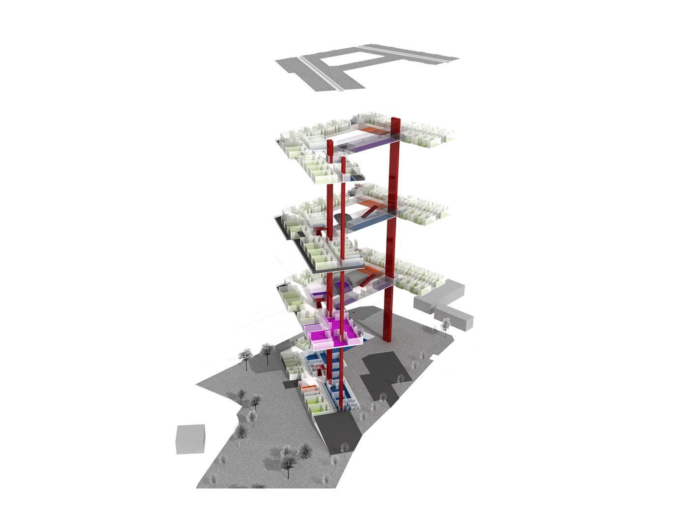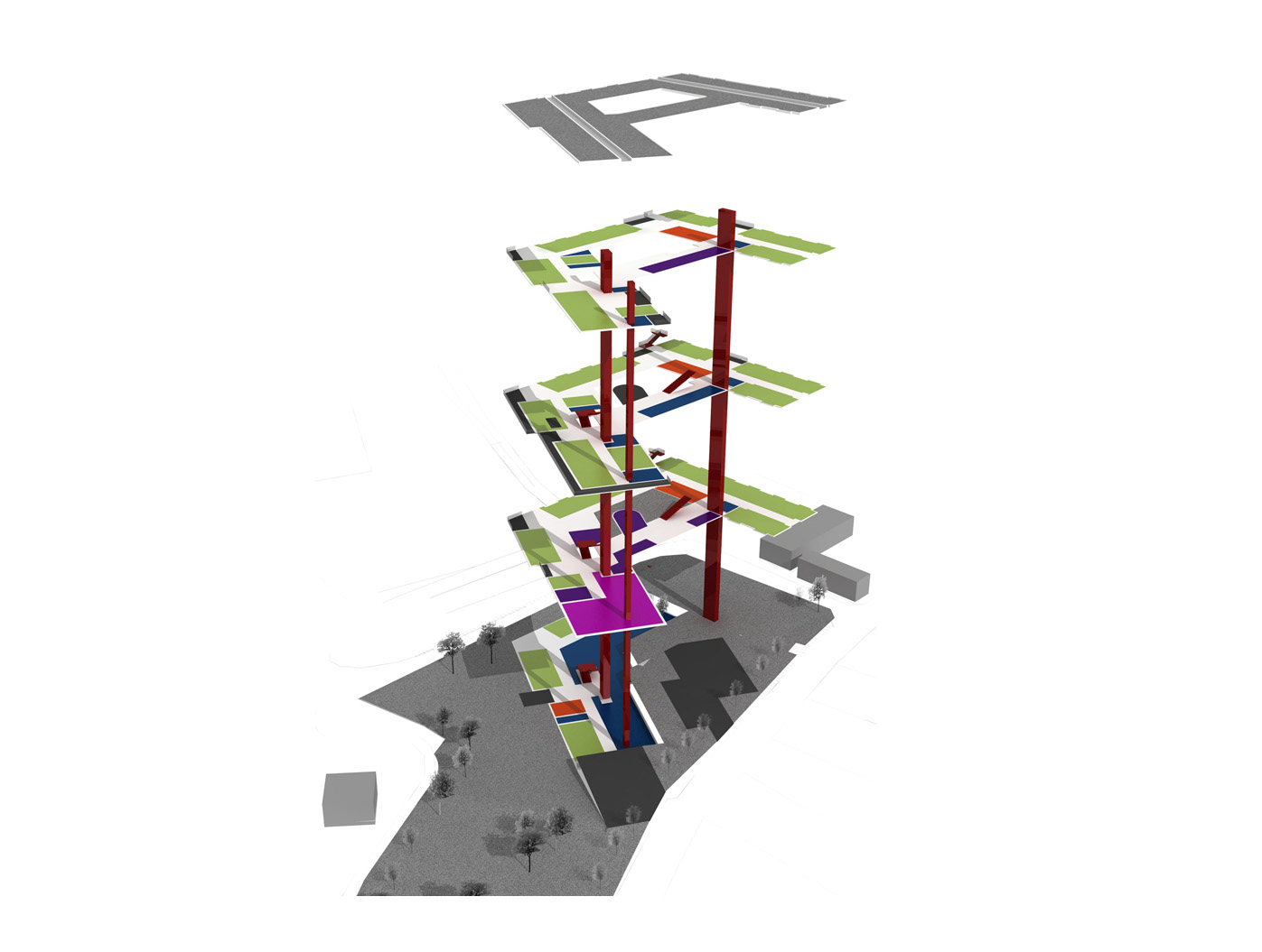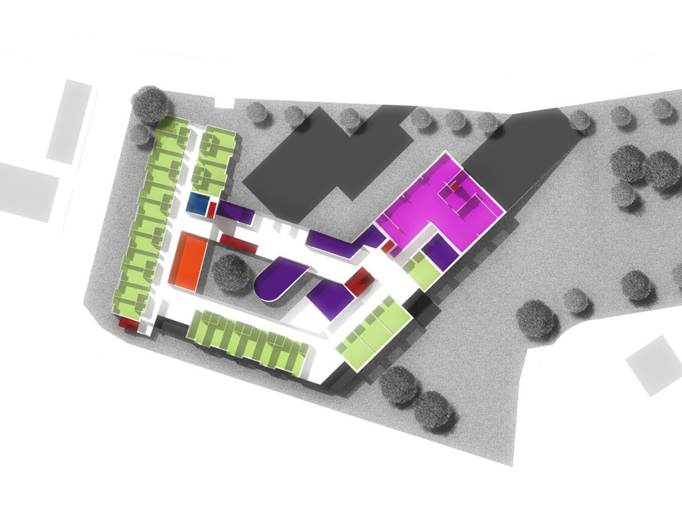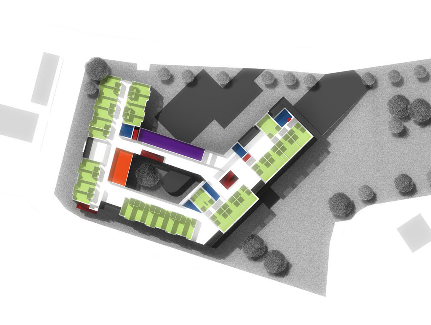 Unser Entwurf formt das städte- bauliche Bild durch klare, redu- zierte Baukörper neu. Der besteh- ende Bauteil wird bereinigt und durch einen dreigeschossigen, L-förmigen Neubau ergänzt, zusam- mengefasst um ein geschütztes, begrüntes Atrium.