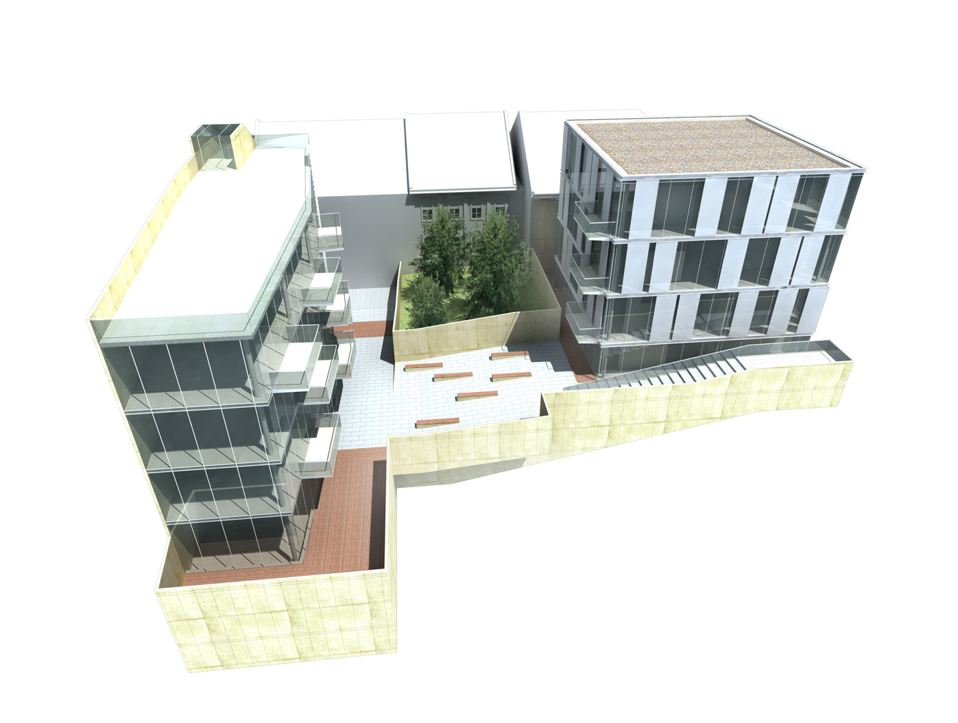 Ein eingesenkter Innenhof fungiert als gemeinsame Mitte: Hier verzahn- en sich die Nutzungen über ein öffentliches Cafe im Erdgeschoss. Die Erschliessung erfolgt über ein zentrales Treppenhaus mit Ober- licht, ein lichtdurchfluteter Ort der Begegnung.