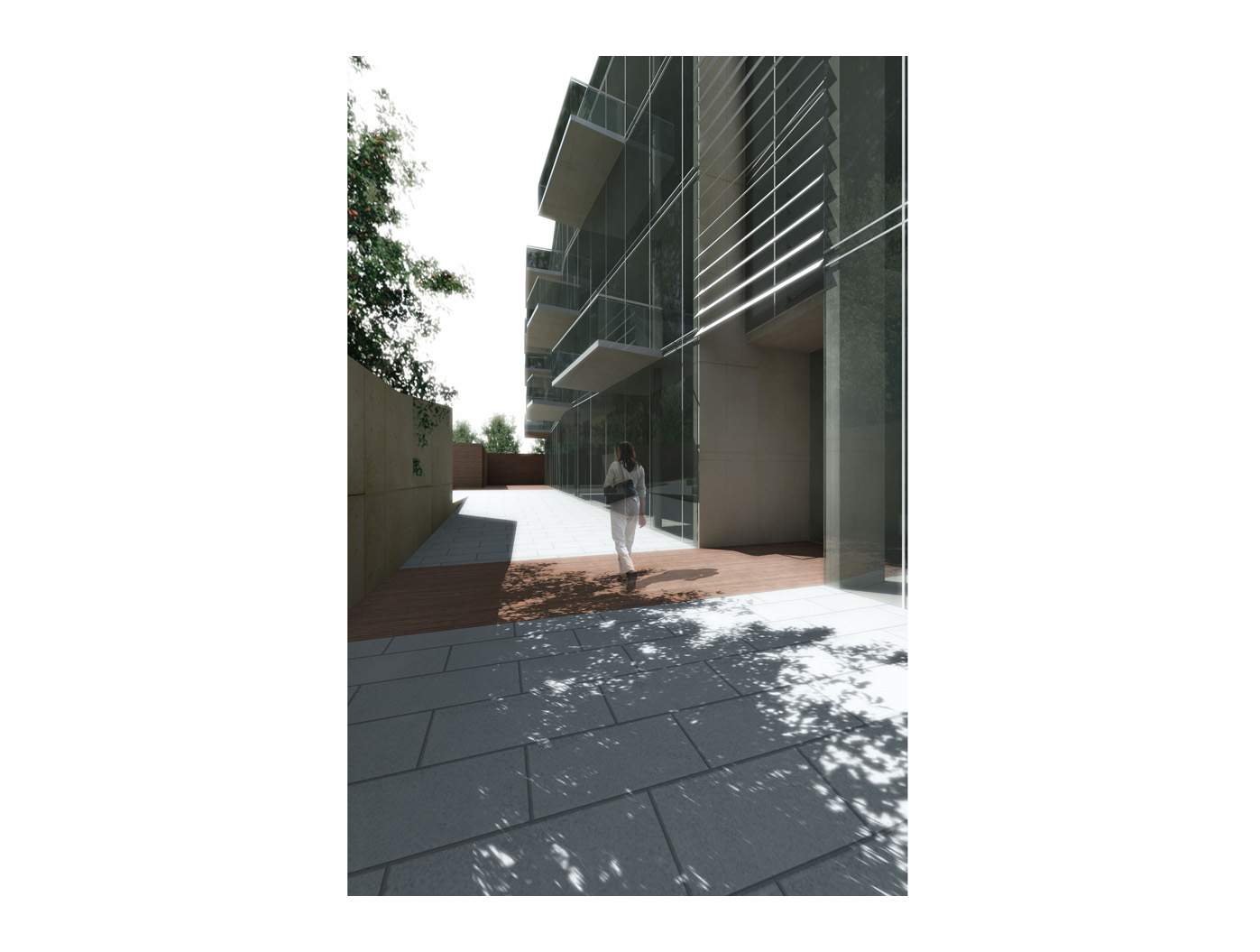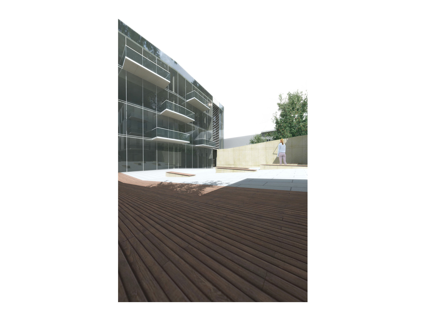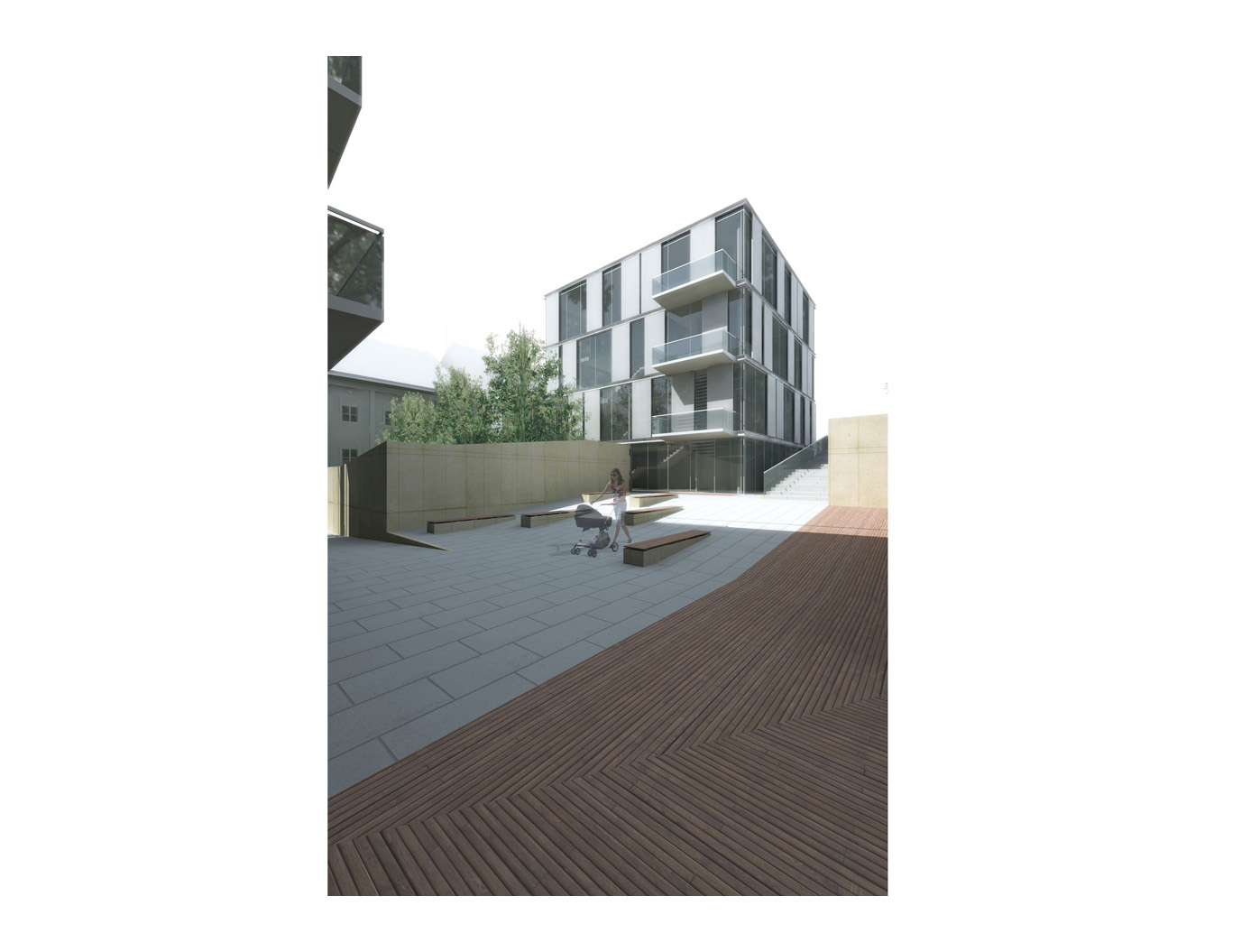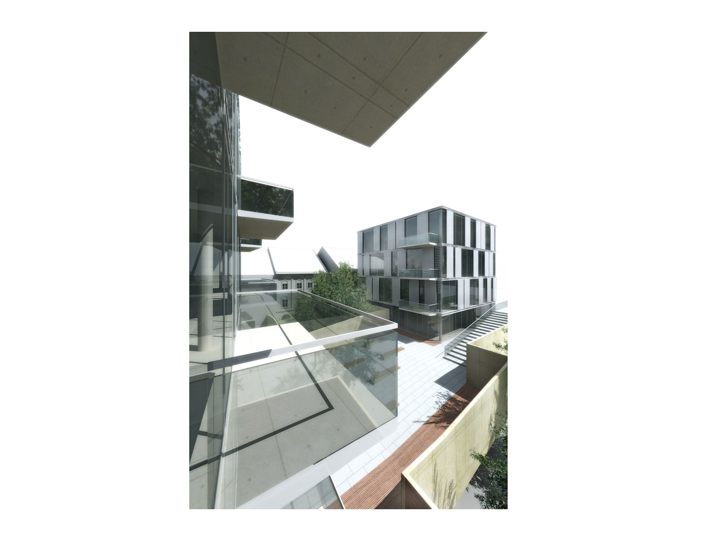Der kubische Baukörper nimmt flex- ible Loft-Büros auf, deren gross- zügige Fensterfronten Bezug zum Umfeld herstellen. Der quadratische Körper beherbergt ruhige Wohnein- heiten, zurückversetzt für Privat- sphäre, doch durch Loggien mit der Stadt verbunden.