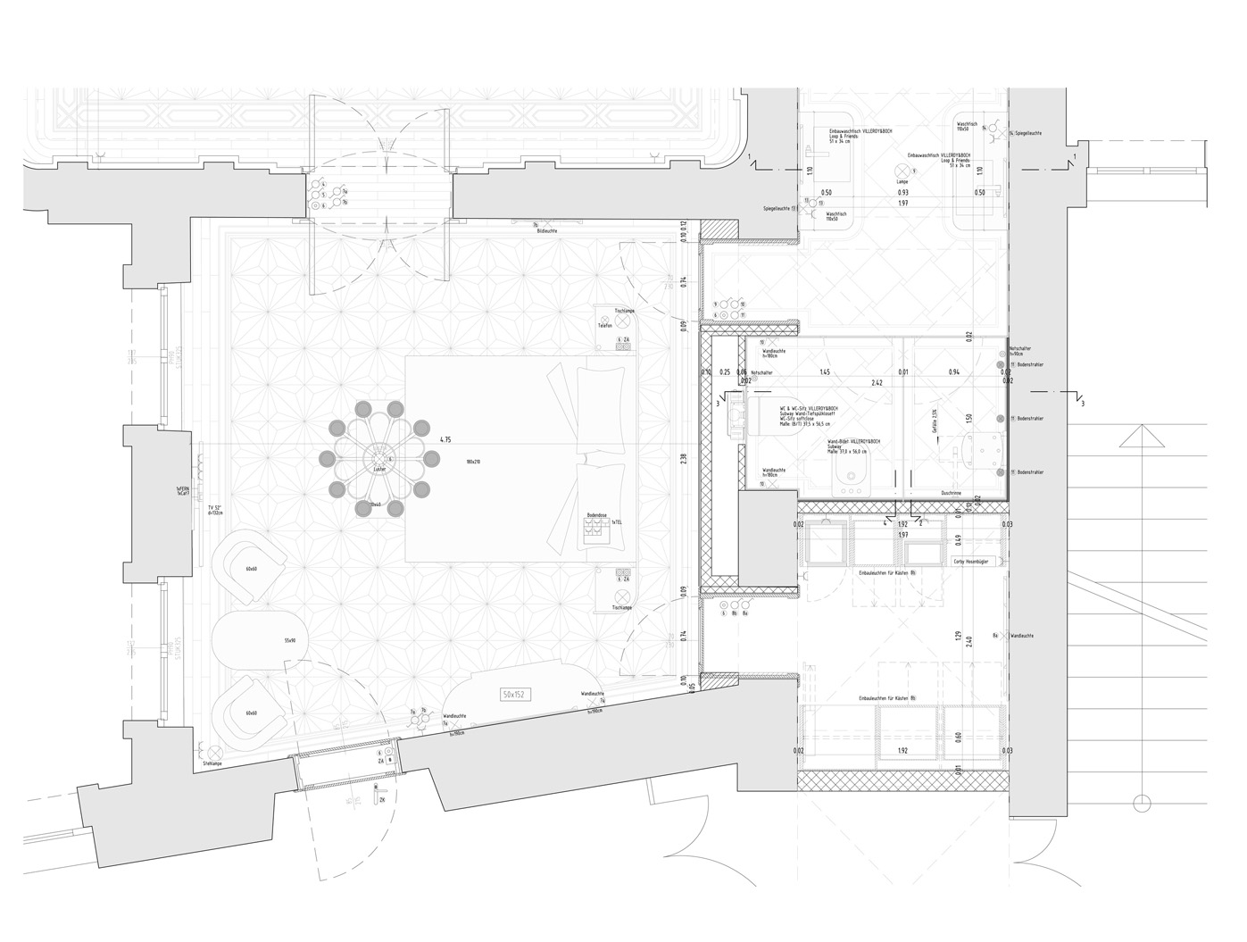 Besonders die Suiten zeigen eine meisterhafte Balance zwischen historischer Pracht und zeit- gemässer Funktionalität. Hochwert- ige Materialien, kunstvolle Details und eine durchdachte Lichtführung schaffen eine Atmosphäre von ex- klusivem Wohngefühl. Dies verdeut- licht, wie historische Bausubstanz mit modernen Annehmlichkeiten ver- schmilzt.
