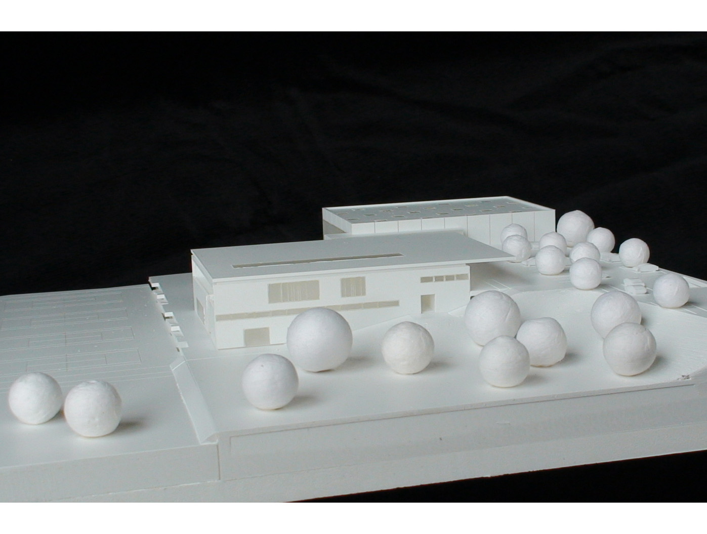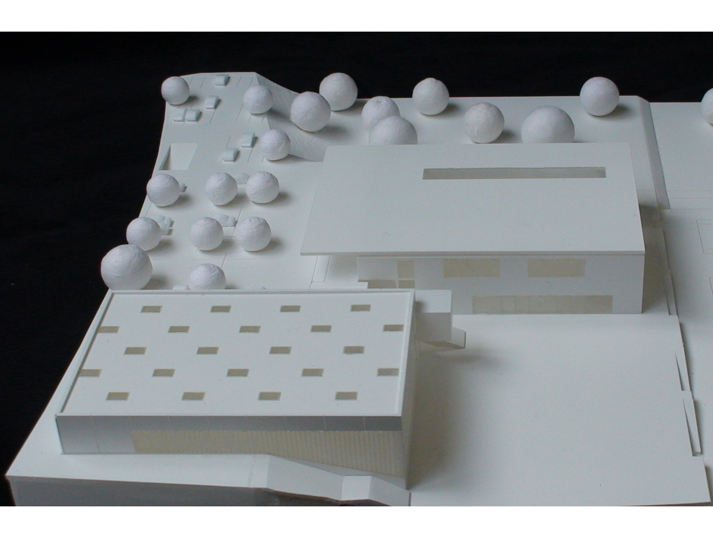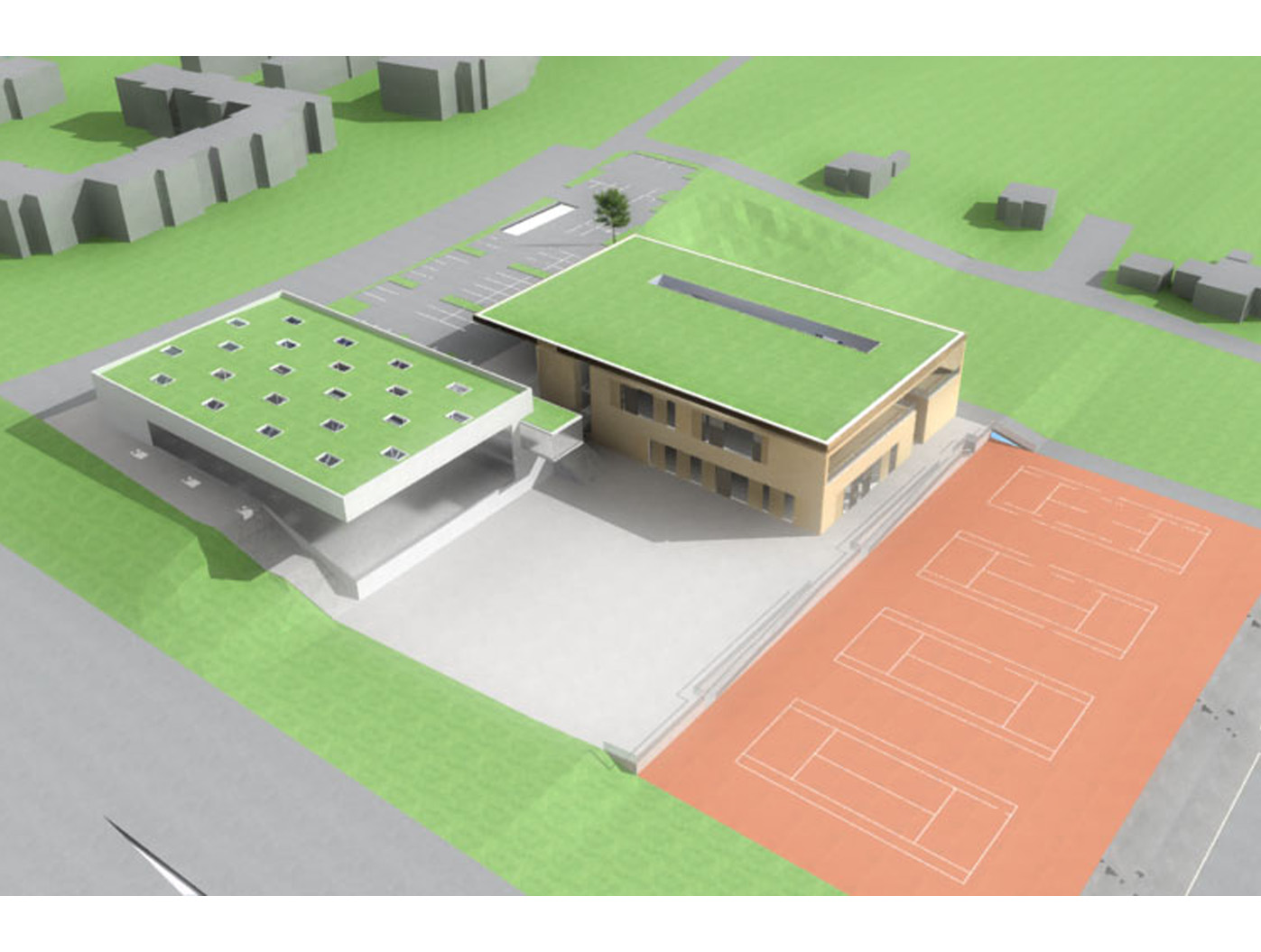 Der Entwurf fügt sich sensibel in die Topographie ein, respektiert die wasserrechtliche Schutzzone und schafft dennoch prägnante Raum- beziehungen. Drei klar differenz- ierte Baukörper: Hauptgebäude, Trendsporthalle und Outdoor-Sportbereich, entwickeln eine dy- namische Wechselwirkung zueinan- der.