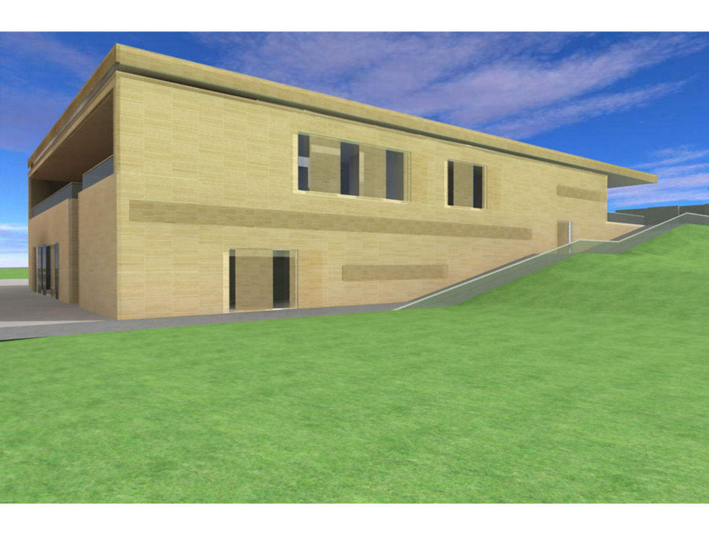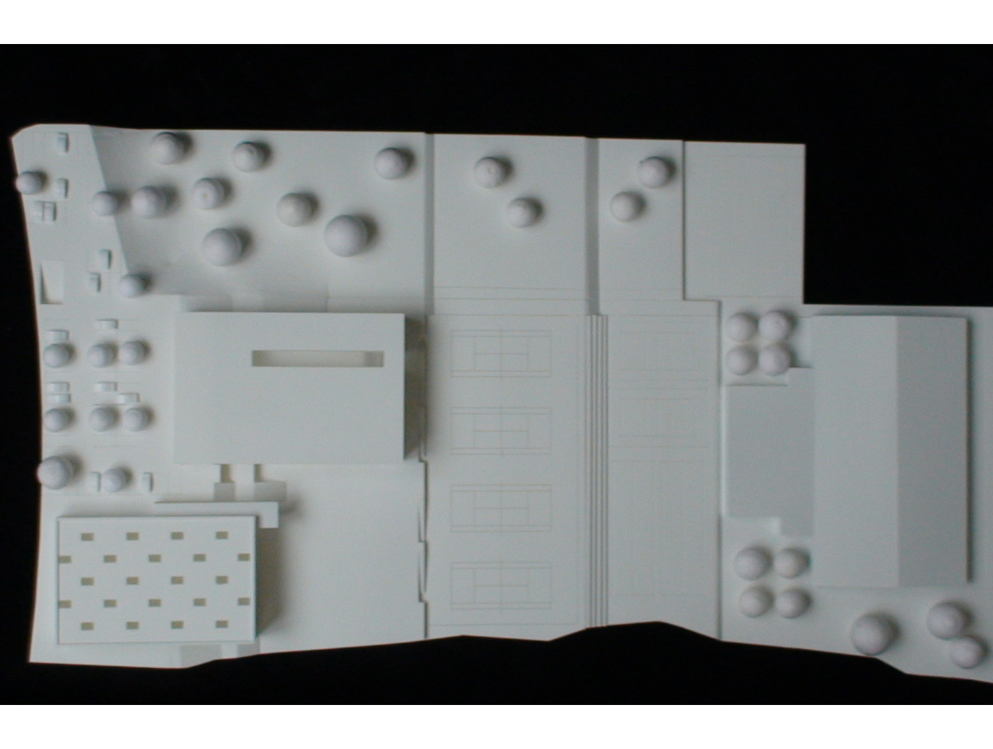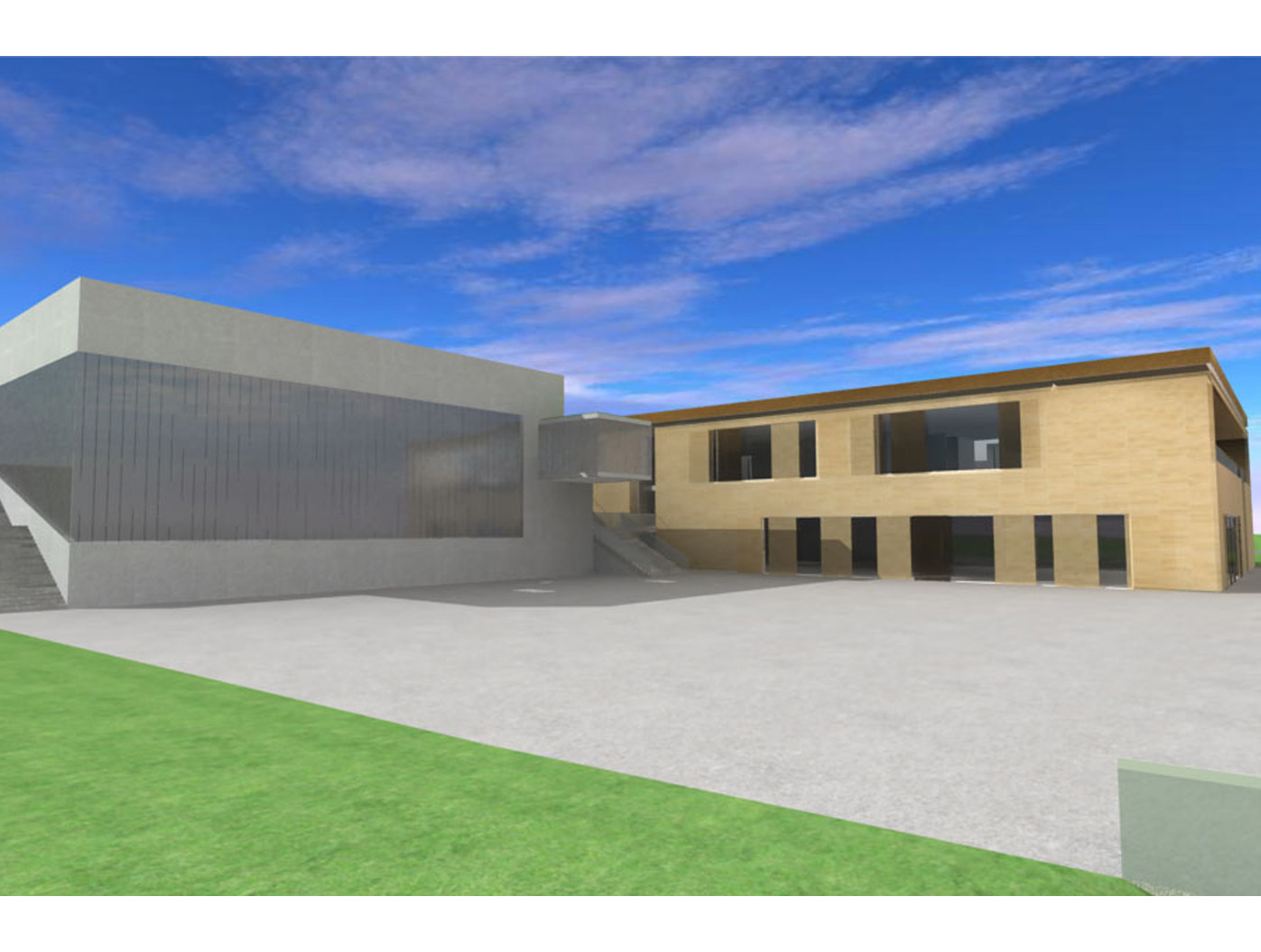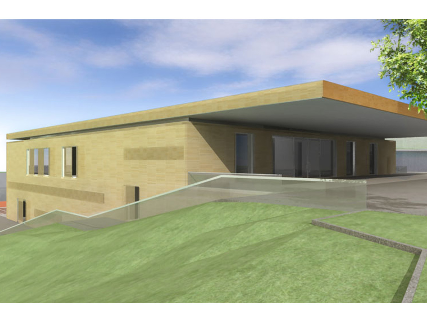 Der Entwurf fügt sich sensibel in die Topographie ein, respektiert die wasserrechtliche Schutzzone und schafft dennoch prägnante Raum- beziehungen. Drei klar differenz- ierte Baukörper: Hauptgebäude, Trendsporthalle und Outdoor-Sportbereich, entwickeln eine dy- namische Wechselwirkung zueinan- der.
