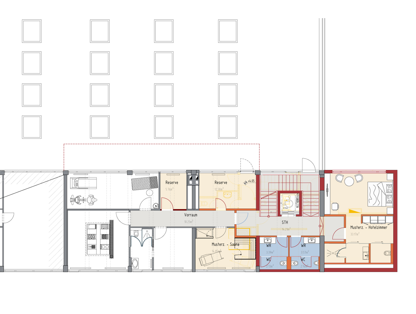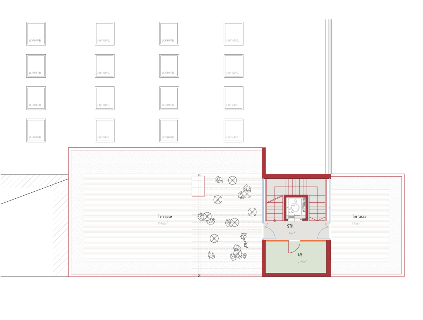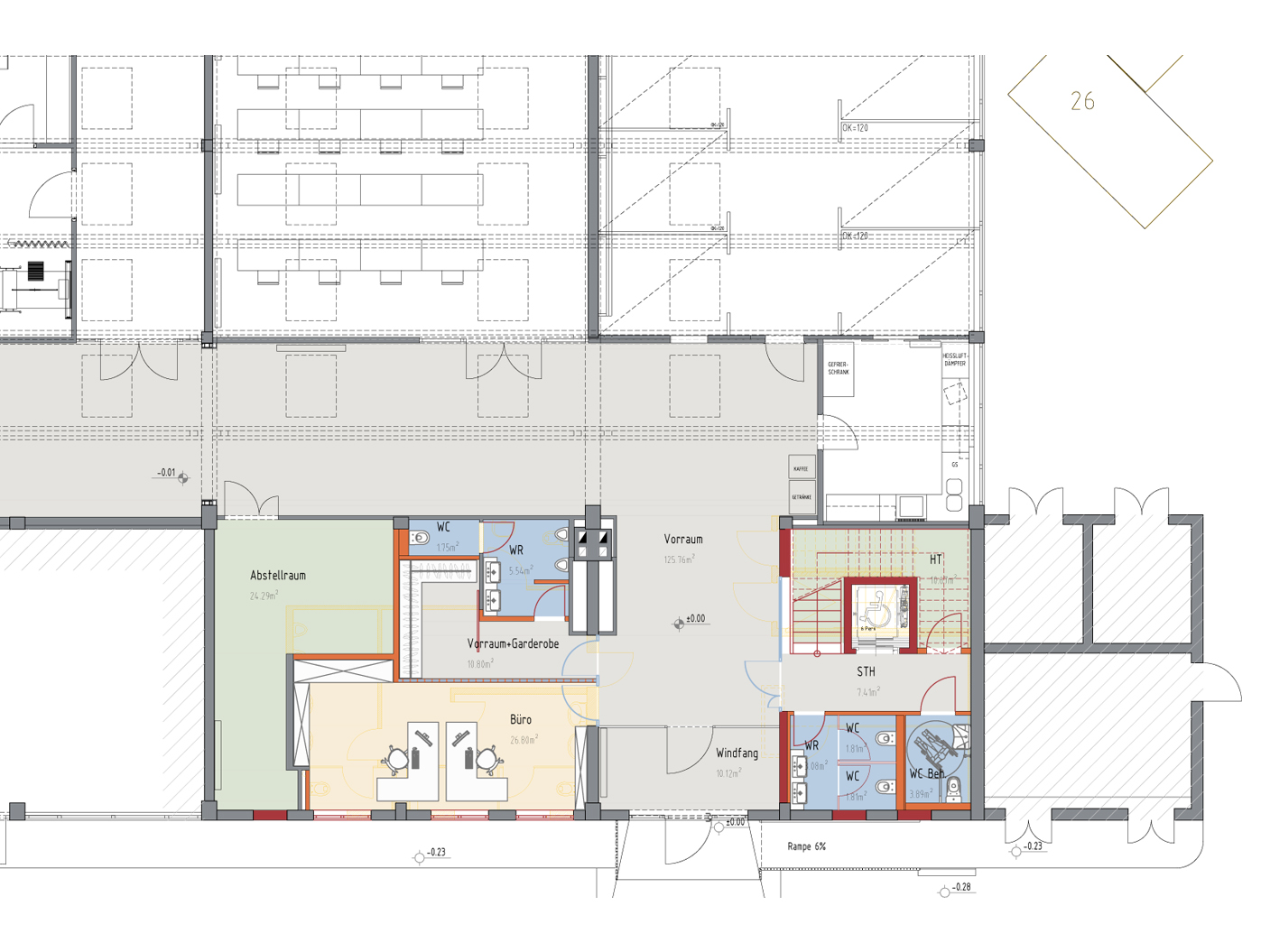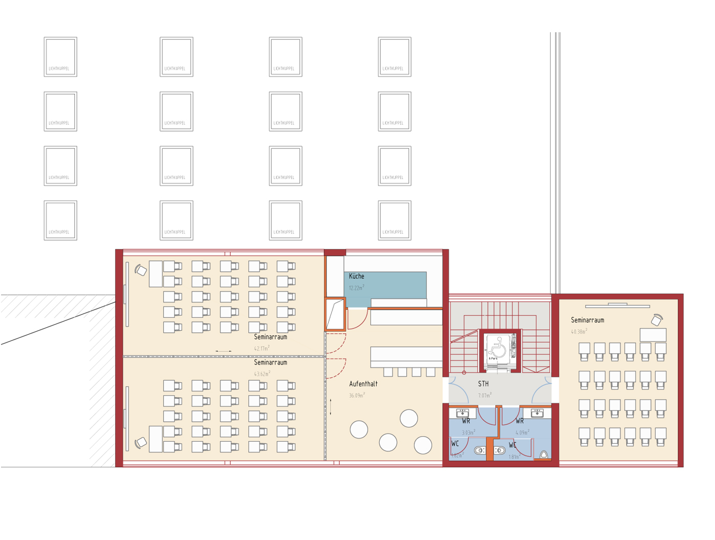 Im Inneren überzeugt das Konzept durch klare Raumfolgen und funk- tionale Zonierung. Die grosszügigen Seminarräume in den Obergeschos- sen profitieren von der intelli- genten Grundrissgestaltung, währ- end die geplante Terrassen- ebene zusätzliches Potenzial für zukünf- tige Erweiterungen bietet. Die Materialwahl schafft eine ange- nehme Lernatmosphäre, das warme Holz der Aufstockung korres- pondiert mit den sachlichen Ober- flächen des Bestandsgebäudes. Durch die grosszügige Verglasung entstehen lichtdurchflutete Schul- ungsräume, die den Bezug zum Aussenraum stets präsent halten.