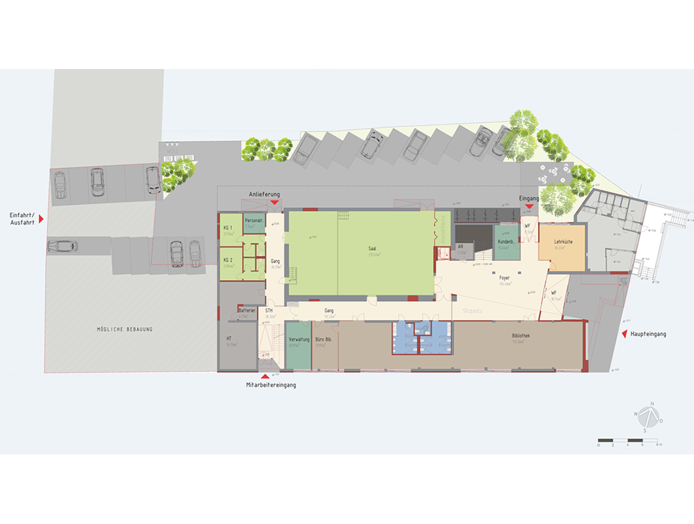 Der Besucher wird durch einen elegant gestalteten Eingangsbe- reich empfangen: Ein geschwung- enes Vordach, eine erweiterte Bibliotheksachse und eine behin- dertengerechte Stiegenanlage schaffen eine einladende Atmos- phäre. Im südlichen Gebäudeteil fügt sich ein modernes Stiegenhaus harmonisch ein, das höchsten Brandschutzanforderungen ent- spricht und zugleich ästhetisch anspruchsvoll gestaltet ist.