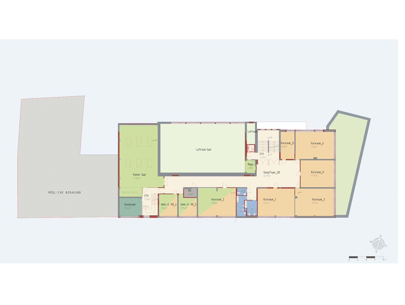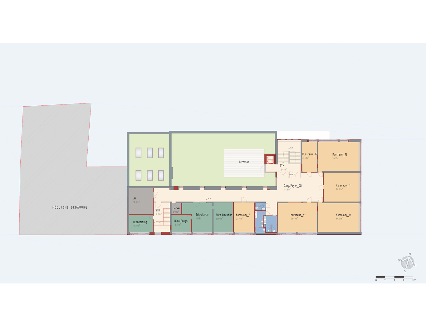 Die Raumaufteilung überzeugt durch ihre Funktionalität: Das erste Obergeschoss beherbergt licht- durchflutete Kursräume, einen einladenden Sozialbereich und einen multifunktionalen Saal mit Umkleiden. Darüber gruppieren sich im zweiten Stockwerk weitere helle Unterrichtsräume und modern ausgestattete Verwaltungsbereiche um das zentrale Stiegenhaus. Grosszügige Verglasungen in den Verkehrsflächen ermöglichen einen harmonischen Lichtfluss zwischen Innen und Aussenbereichen.