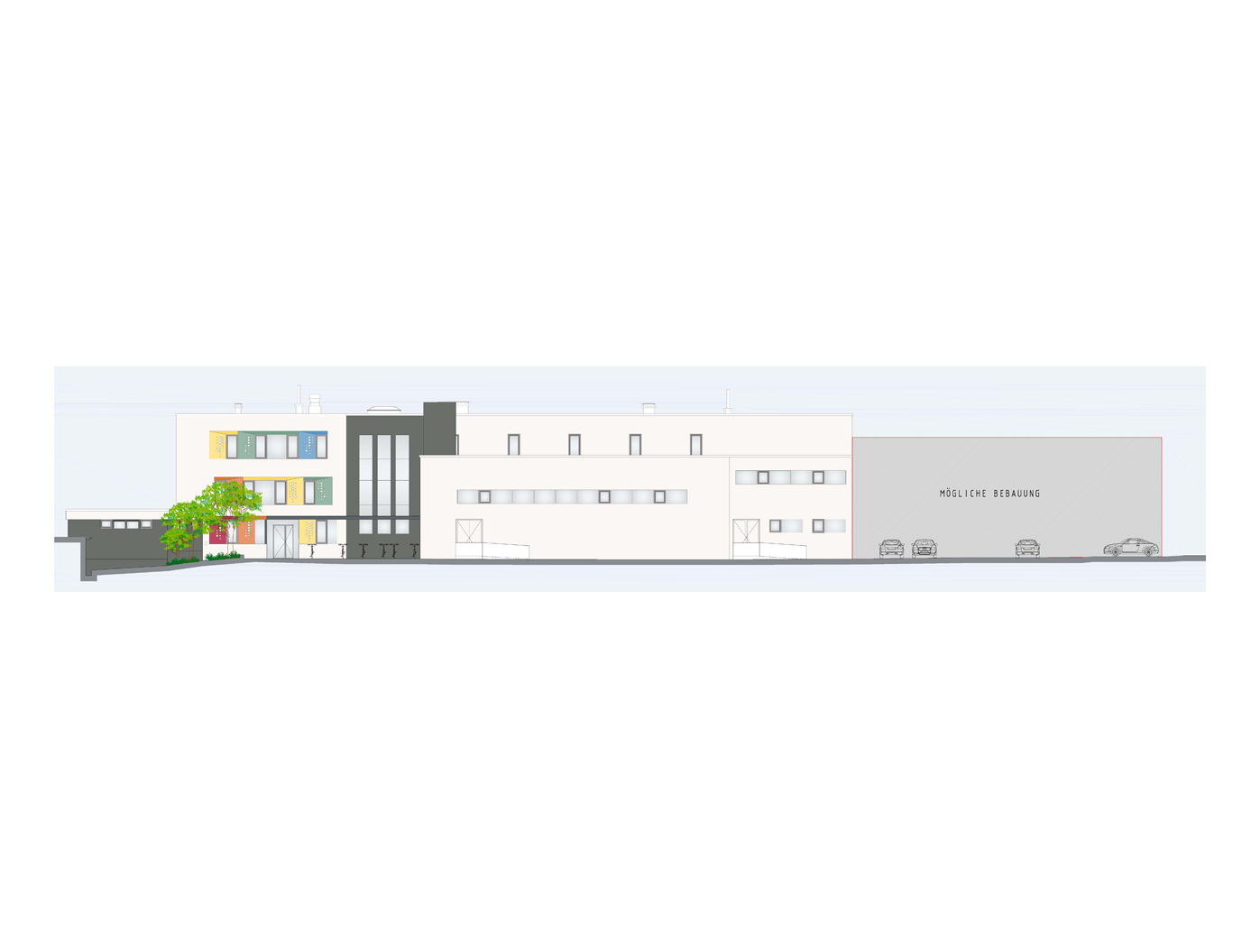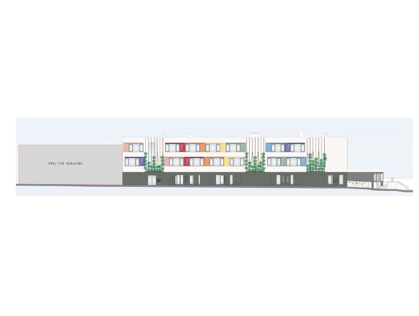 Horizontale Holz Alu Fensterbänder an Süd und Ostseite schaffen eine rhythmische Struktur, während schräge Verblechungen für spannende Tiefenwirkung sorgen. Die Farbgebung verbindet histor- isches Erbe mit zeitgemässer Architektur. Besonders markant ist der Kontrast zwischen dunklem Sockel und heller Fassade, ergänzt durch begrünte Rankelemente. Die Nordseite setzt mit farbigen Fensterbändern, einer grosszügigen Verglasung und lichtdurchfluteten Oberlichtern den Schlusspunkt dieses architektonisch anspruchs- vollen Ensembles, das Funktio- nalität mit ästhetischer Eleganz vereint.