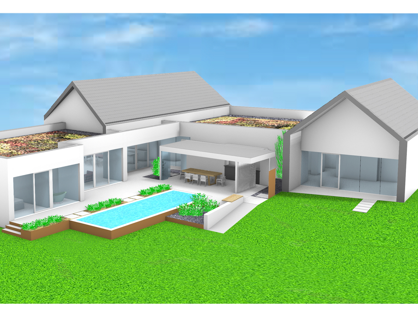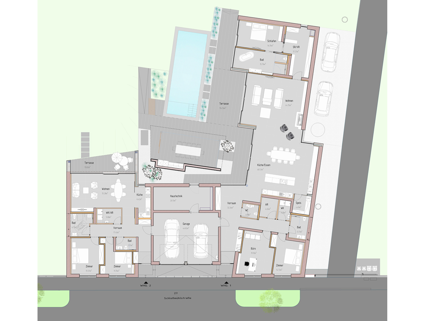 Durch die intelligente Raumauf- teilung entstehen zwei eigen- ständige Wohneinheiten, die den- noch visuell und funktional verbunden sind. Grosszügige Ver- glasungen schaffen lichtdurch- flutete Wohnbereiche und har- monische Bezüge zur umgebenden Natur. Die Architektur überzeugt durch präzise Details, von den sorgfältig komponierten Fassaden- proportionen bis zur fliessenden Raumfolge im Inneren.